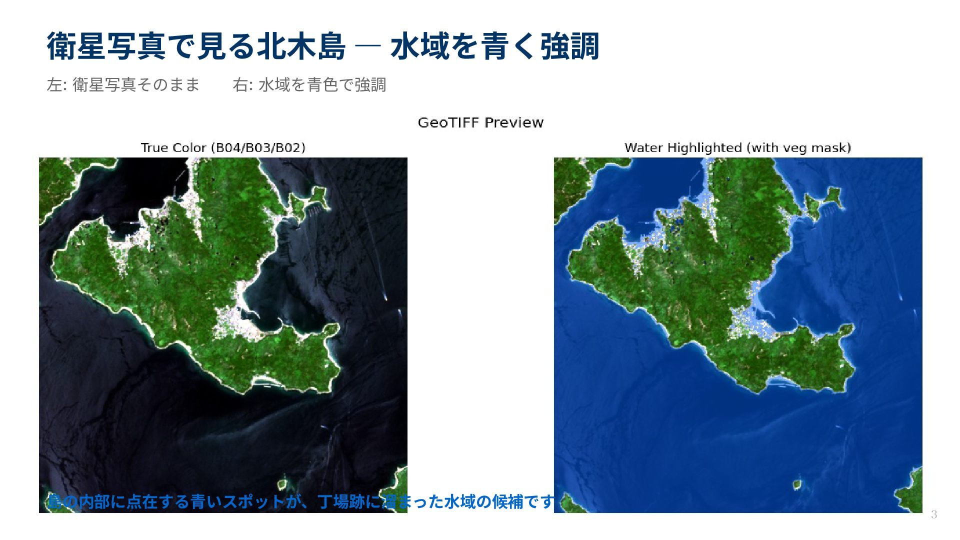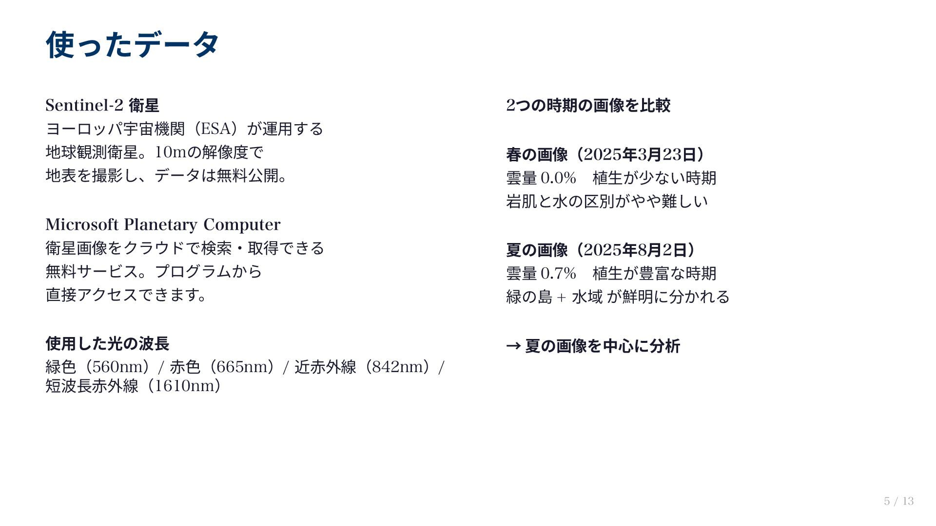 Planetary Computer 衛星画像をクラウドで検索・取得できる 無料サービス。プログラムから 直接アクセスできます。 使用した光の波長 緑色(560nm)/ 赤色(665nm)/ 近赤外線(842nm)/ 短波長赤外線(1610nm) 2つの時期の画像を比較 春の画像(2025年3月23日) 雲量 0.0% 植生が少ない時期 岩肌と水の区別がやや難しい 夏の画像(2025年8月2日) 雲量 0.7% 植生が豊富な時期 緑の島 + 水域 が鮮明に分かれる → 夏の画像を中心に分析