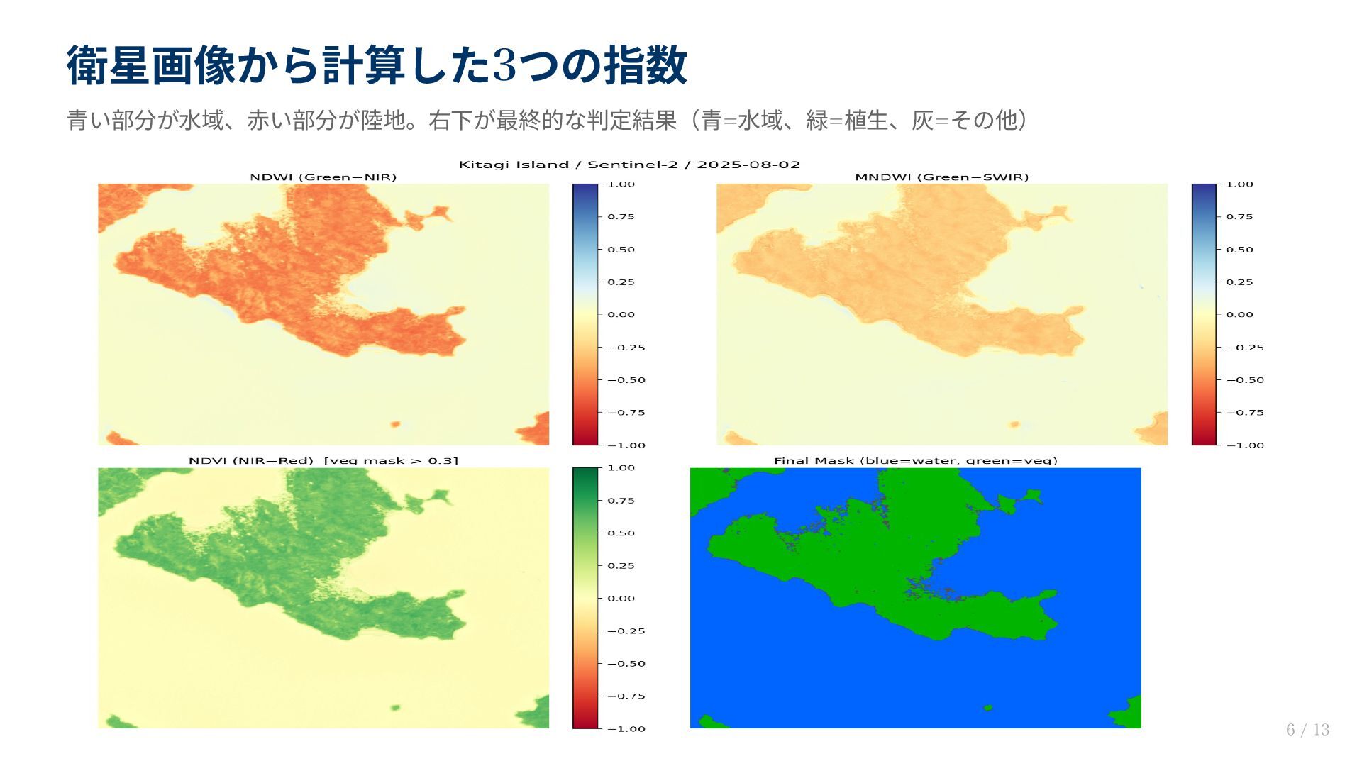 衛星画像から計算した3つの指数 青い部分が水域、赤い部分が陸地。右下が最終的な判定結果(青=水域、緑=植生、灰=その他) 6 / 13