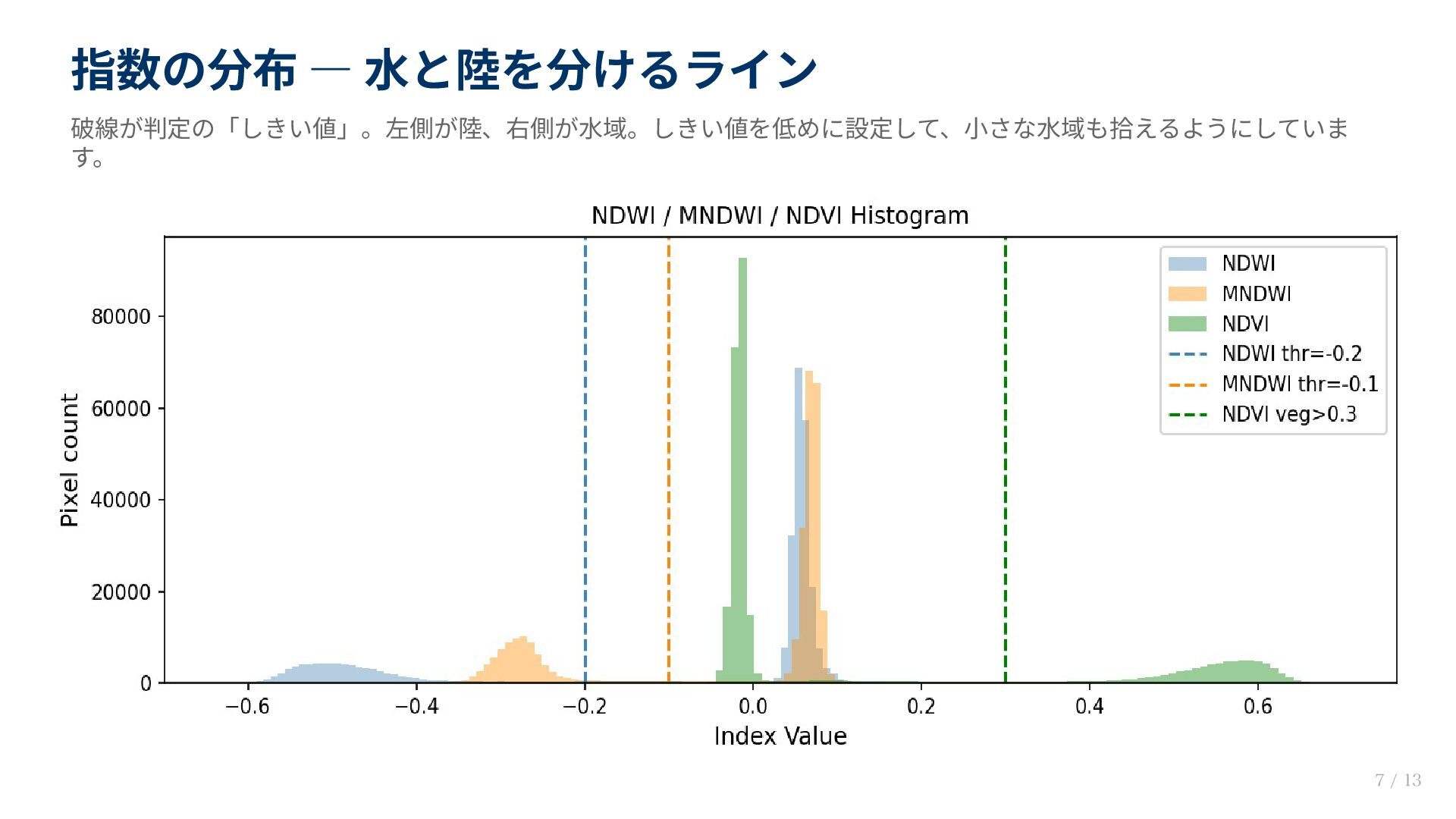 指数の分布 — 水と陸を分けるライン 7 / 13 破線が判定の「しきい値」。左側が陸、右側が水域。しきい値を低めに設定して、小さな水域も拾えるようにしていま す。