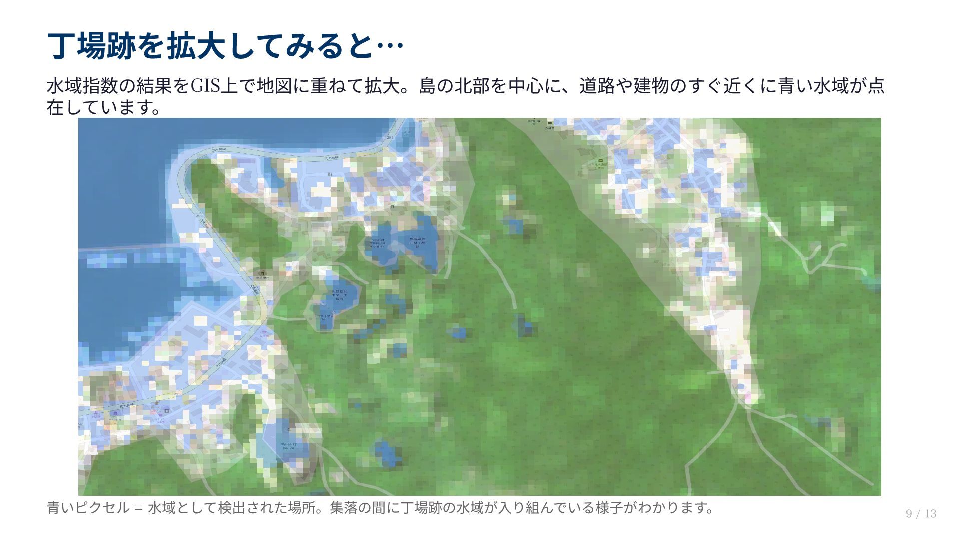 丁場跡を拡大してみると… 9 / 13 水域指数の結果をGIS上で地図に重ねて拡大。島の北部を中心に、道路や建物のすぐ近くに青い水域が点 在しています。 青いピクセル = 水域として検出された場所。集落の間に丁場跡の水域が入り組んでいる様子がわかります。