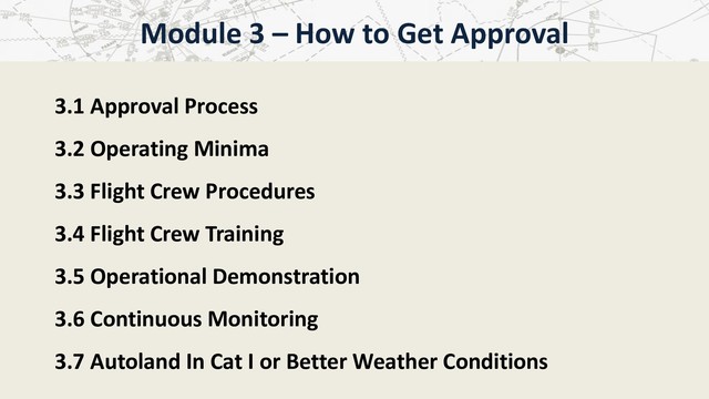 3.4 Flight Crew Training 3.5 Operational Demonstration 3.6 Continuous Monitoring 3.7 Autoland In Cat I or Better Weather Conditions Module 3 – How to Get Approval
