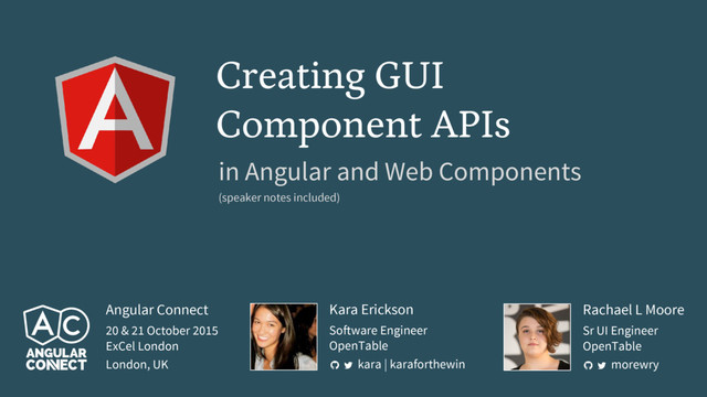 So you’ve embraced architecting your Angular application with reusable components – cheers to you! But you have UI components that need to communicate with each other or expose public methods, and you’re wondering about your options. In this talk, we’ll cover how new web component standards, like Custom Elements, handle this. Next, we’ll walk through how to accomplish it today in Angular 1.x – and bring it all together into what a solution will look like in upcoming Angular 2. Afterwards, you'll know how to design and implement the public HTML and JavaScript interfaces of GUI components.
