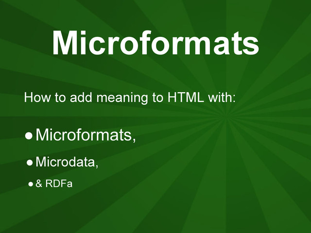 ◦How does a machine know that "Blah Blah" is the name of a person? ◦Currently? Context + vast amounts of data to analyze. ◦Microformats allow us to specify "this is a person's name" in our HTML code.