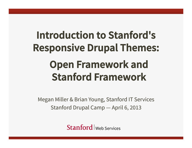 In this presentation we introduce Stanford's responsive, Drupal 7 themes: Open Framework, Stanford Framework, and its subthemes. We will introduce responsive web design, discuss which themes are best for what use (e.g. department vs. personal), and share our development process and what went in to planning the responsive behaviors for these themes.