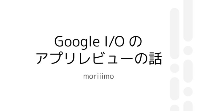 自己紹介 守本 綾子 @moriiimo MENUSのアプリ作ってます GoogleI/O行ってきました セッションは各地で報告会が あったので私はアプリのレ ビューについてお話します phoneXかよっていう写真とれた。