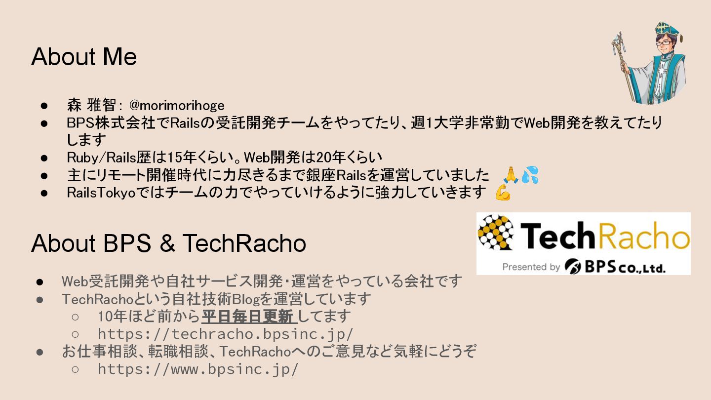 https://techracho.bpsinc.jp/ • お仕事相談、転職相談、TechRachoへのご意見など気軽にどうぞ ◦ https://www.bpsinc.jp/ About Me • 森 雅智: @morimorihoge • BPS株式会社でRailsの受託開発チームをやってたり、週1大学非常勤でWeb開発を教えてたり します • Ruby/Rails歴は15年くらい。Web開発は20年くらい • 主にリモート開催時代に力尽きるまで銀座Railsを運営していました 🙏💦 • RailsTokyoではチームの力でやっていけるように強力していきます 💪 About BPS & TechRacho