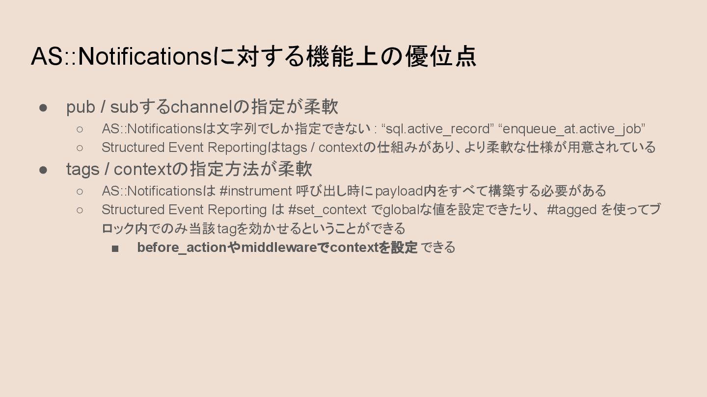 ◦ Structured Event Reportingはtags / contextの仕組みがあり、より柔軟な仕様が用意されている • tags / contextの指定方法が柔軟 ◦ AS::Notificationsは #instrument 呼び出し時にpayload内をすべて構築する必要がある ◦ Structured Event Reporting は #set_context でglobalな値を設定できたり、 #tagged を使ってブ ロック内でのみ当該tagを効かせるということができる ▪ before_actionやmiddlewareでcontextを設定できる