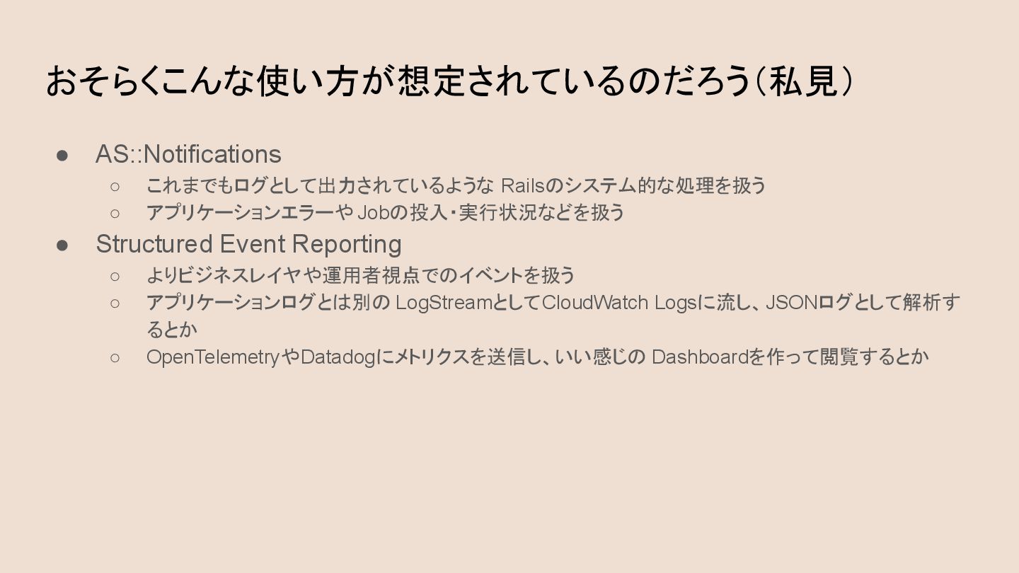 Structured Event Reporting ◦ よりビジネスレイヤや運用者視点でのイベントを扱う ◦ アプリケーションログとは別の LogStreamとしてCloudWatch Logsに流し、JSONログとして解析す るとか ◦ OpenTelemetryやDatadogにメトリクスを送信し、いい感じの Dashboardを作って閲覧するとか