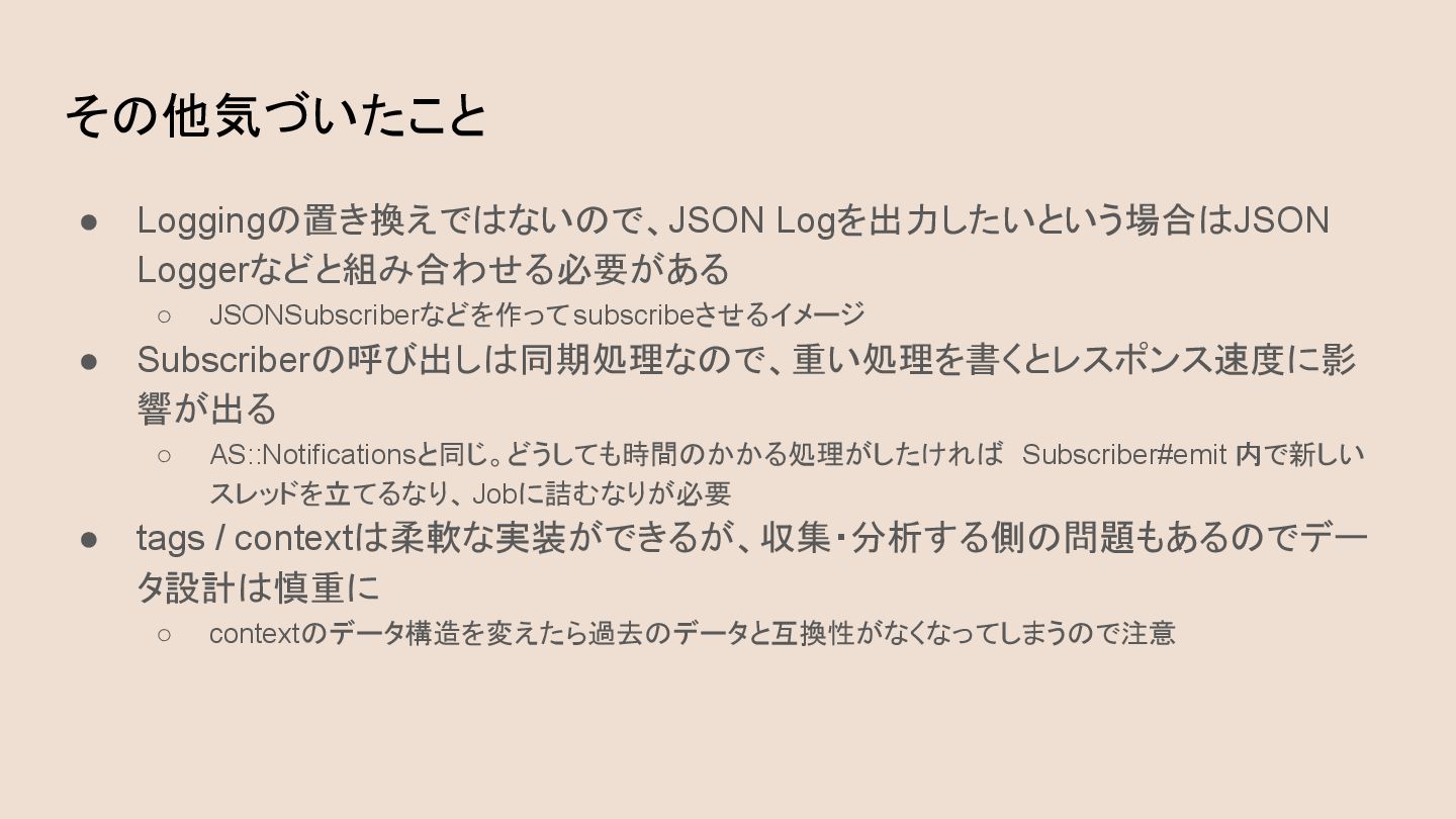 ◦ AS::Notificationsと同じ。どうしても時間のかかる処理がしたければ Subscriber#emit 内で新しい スレッドを立てるなり、 Jobに詰むなりが必要 • tags / contextは柔軟な実装ができるが、収集・分析する側の問題もあるのでデー タ設計は慎重に ◦ contextのデータ構造を変えたら過去のデータと互換性がなくなってしまうので注意