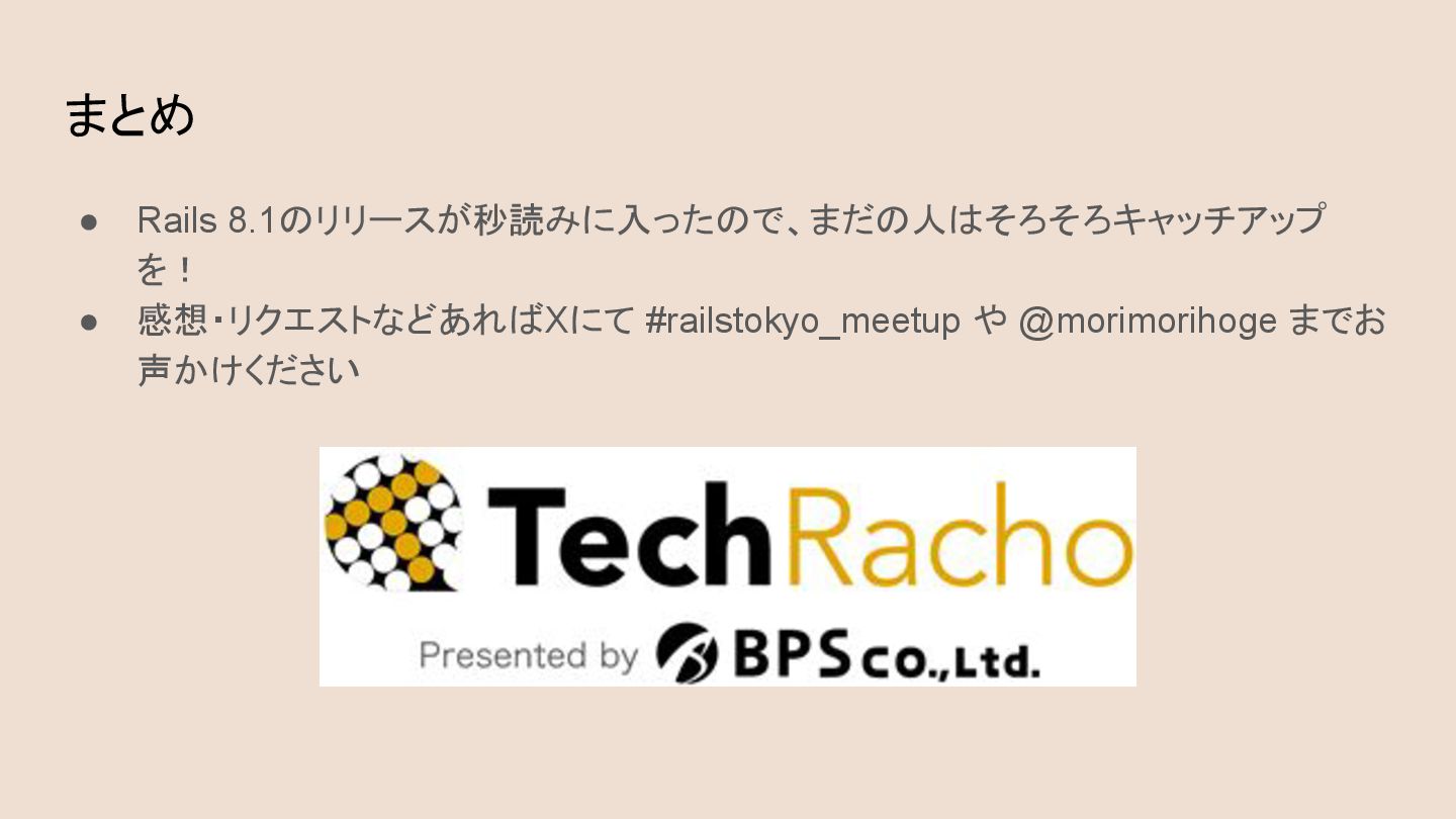 まとめ • Rails 8.1のリリースが秒読みに入ったので、まだの人はそろそろキャッチアップ を! • 感想・リクエストなどあればXにて #railstokyo_meetup や @morimorihoge
