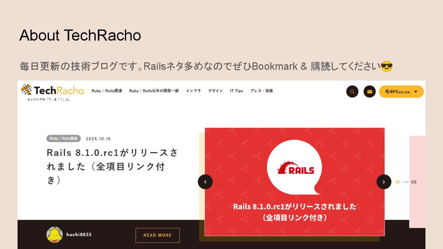 About TechRacho 毎日更新の技術ブログです。Railsネタ多めなのでぜひBookmark & 購読してください😎