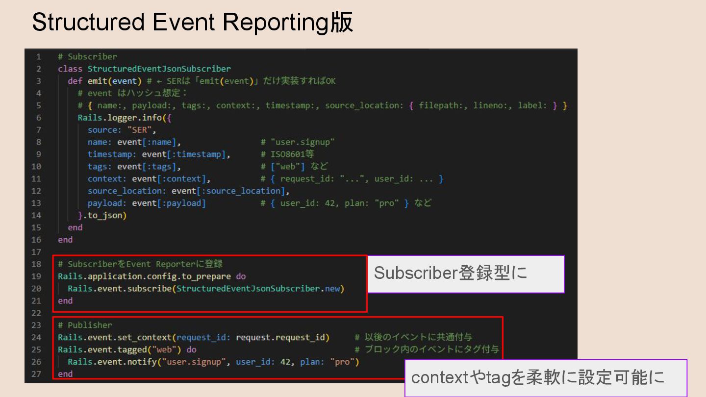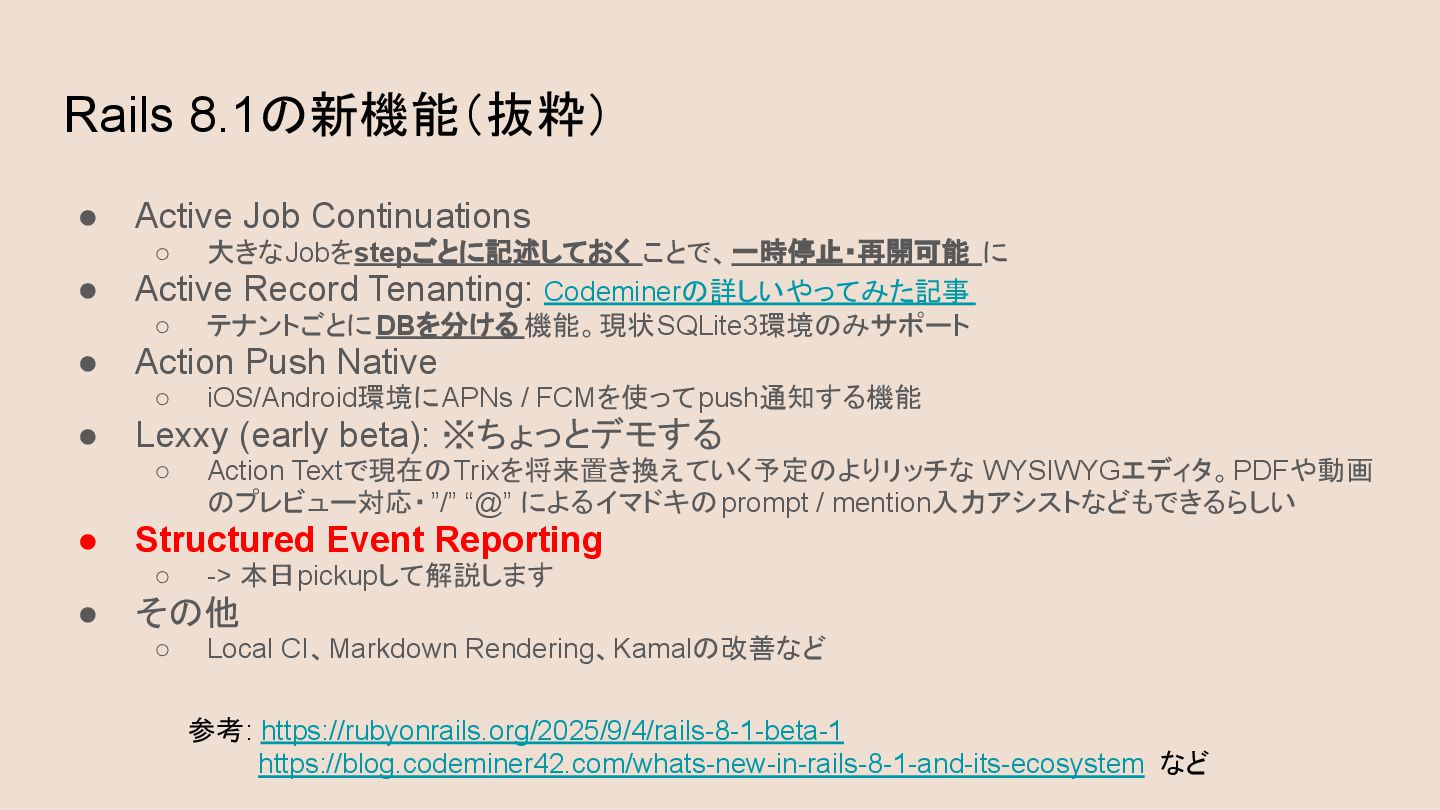 • Active Record Tenanting: Codeminerの詳しいやってみた記事 ◦ テナントごとにDBを分ける 機能。現状SQLite3環境のみサポート • Action Push Native ◦ iOS/Android環境にAPNs / FCMを使ってpush通知する機能 • Lexxy (early beta): ※ちょっとデモする ◦ Action Textで現在のTrixを将来置き換えていく予定のよりリッチな WYSIWYGエディタ。PDFや動画 のプレビュー対応・”/” “@” によるイマドキのprompt / mention入力アシストなどもできるらしい • Structured Event Reporting ◦ -> 本日pickupして解説します • その他 ◦ Local CI、Markdown Rendering、Kamalの改善など 参考: https://rubyonrails.org/2025/9/4/rails-8-1-beta-1 https://blog.codeminer42.com/whats-new-in-rails-8-1-and-its-ecosystem など