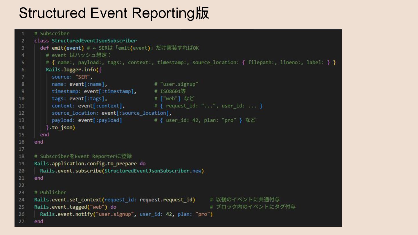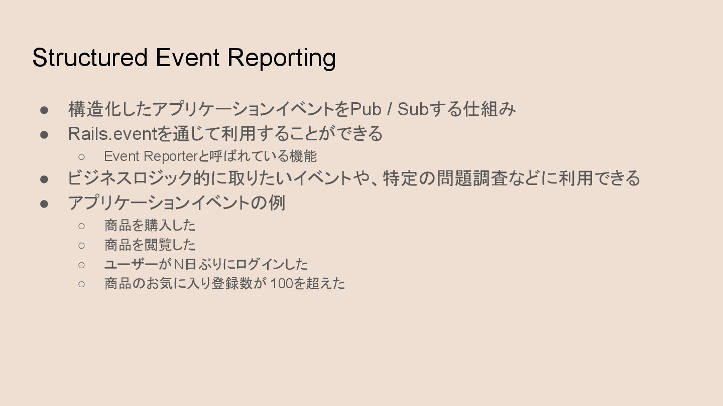 Structured Event Reporting • 構造化したアプリケーションイベントをPub / Subする仕組み • Rails.eventを通じて利用することができる ◦