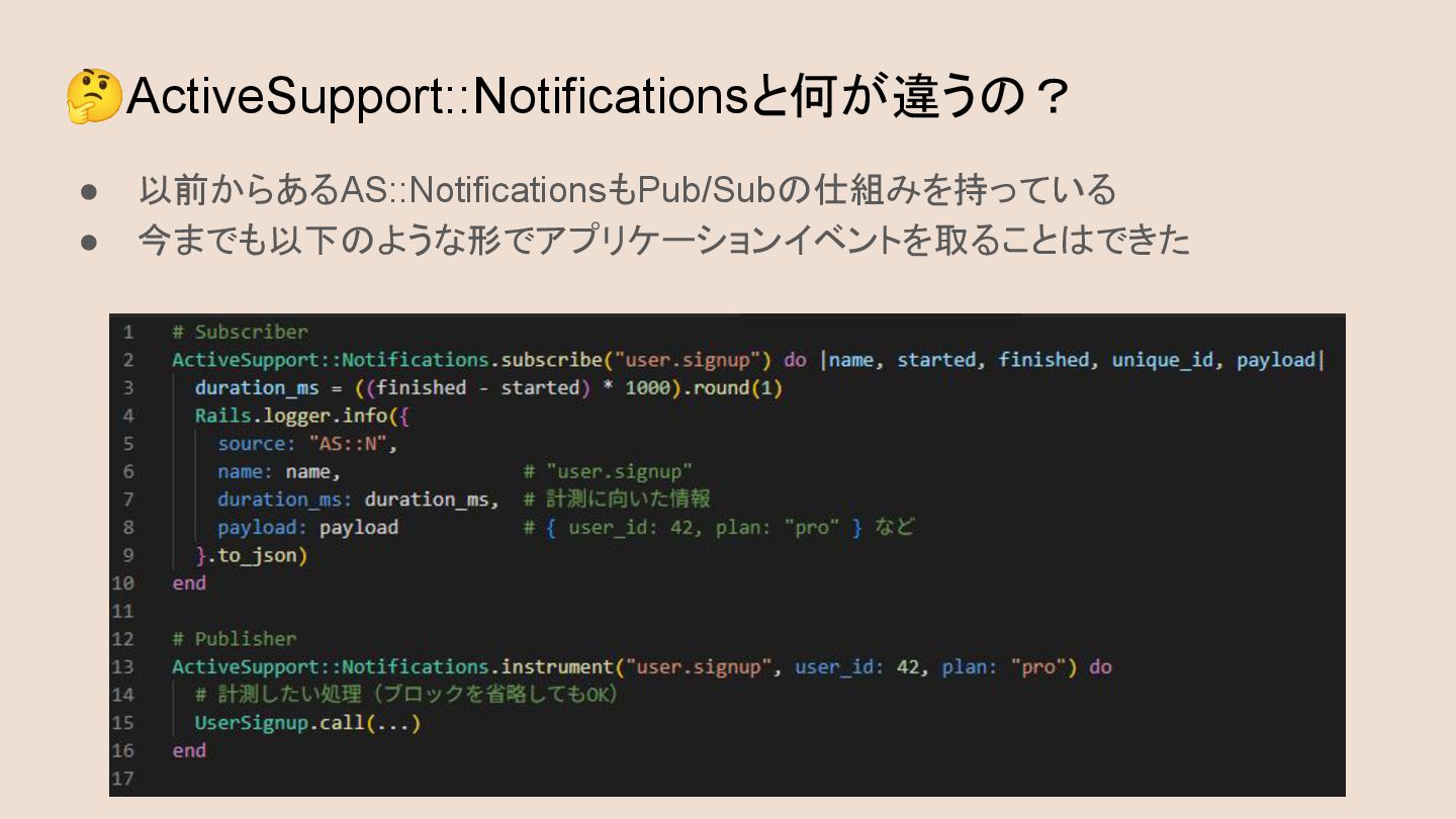 🤔ActiveSupport::Notificationsと何が違うの? • 以前からあるAS::NotificationsもPub/Subの仕組みを持っている • 今までも以下のような形でアプリケーションイベントを取ることはできた