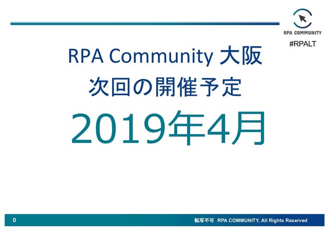 転写不可 RPA COMMUNITY, All Rights Reserved 3 2019年4⽉ 次回の開催予定 #RPALT