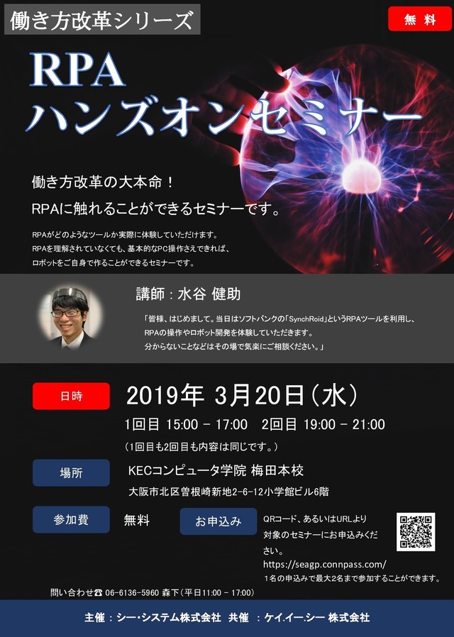 QRコード、あるいはURLより 対象のセミナーにお申込みくだ さい。 お申込み 主催 : シー・システム株式会社 共催 : ケイ.イー.シー 株式会社 日時 1回目 15:00 – 17:00 2回目 19:00 - 21:00 (1回目も2回目も内容は同じです。) 問い合わせ☎ 06-6136-5960 森下(平日11:00 – 17:00) https://seagp.connpass.com/ 働き方改革シリーズ KECコンピュータ学院 梅田本校 大阪市北区曽根崎新地2-6-12小学館ビル6階 無 料 1名の申込みで最大2名まで参加することができます。
