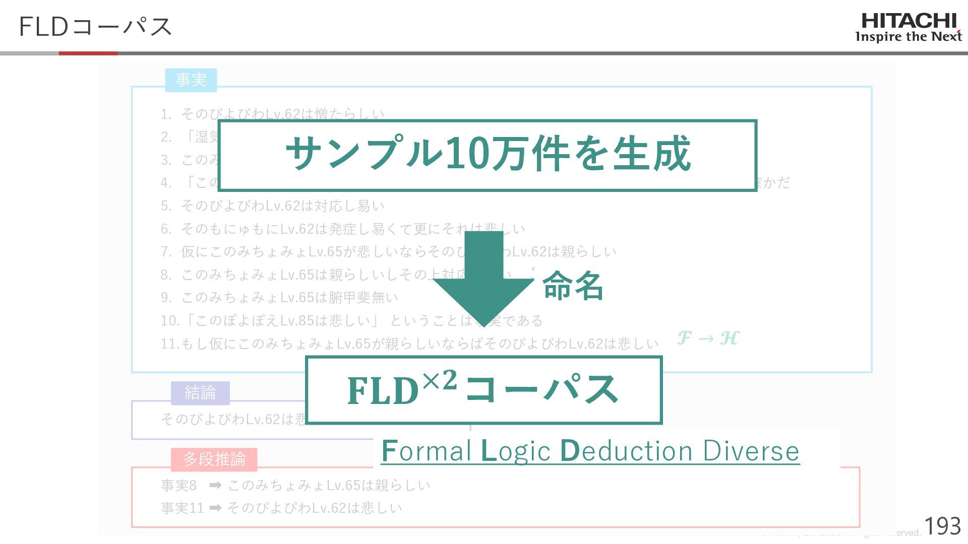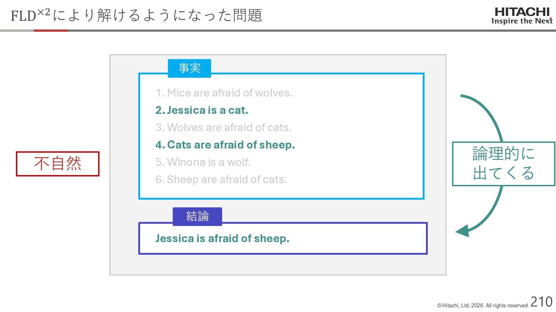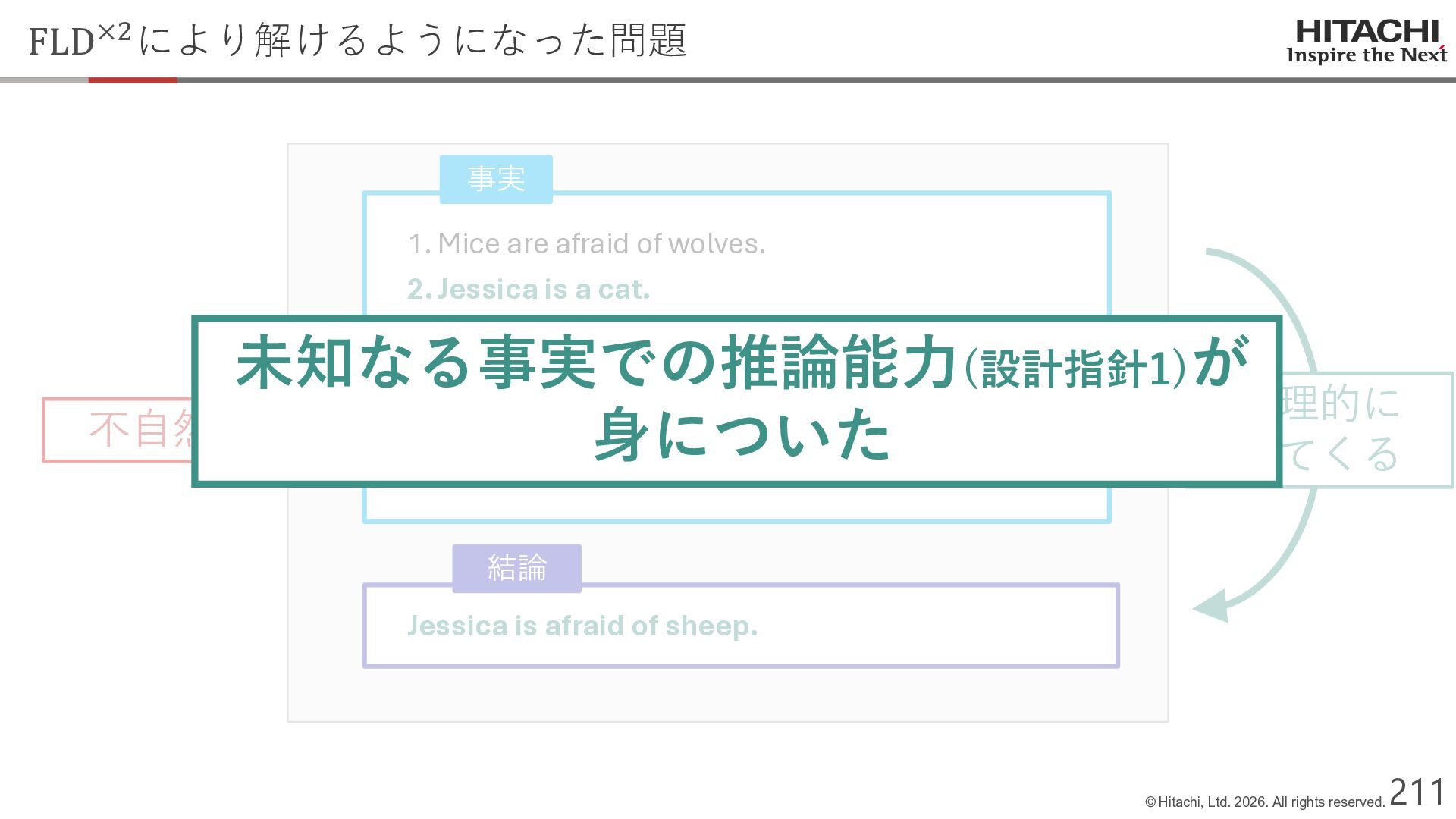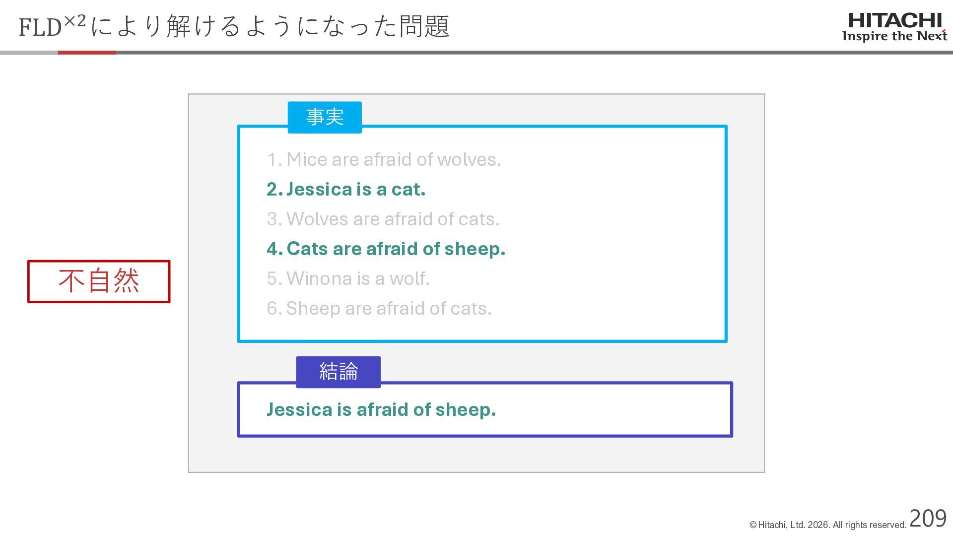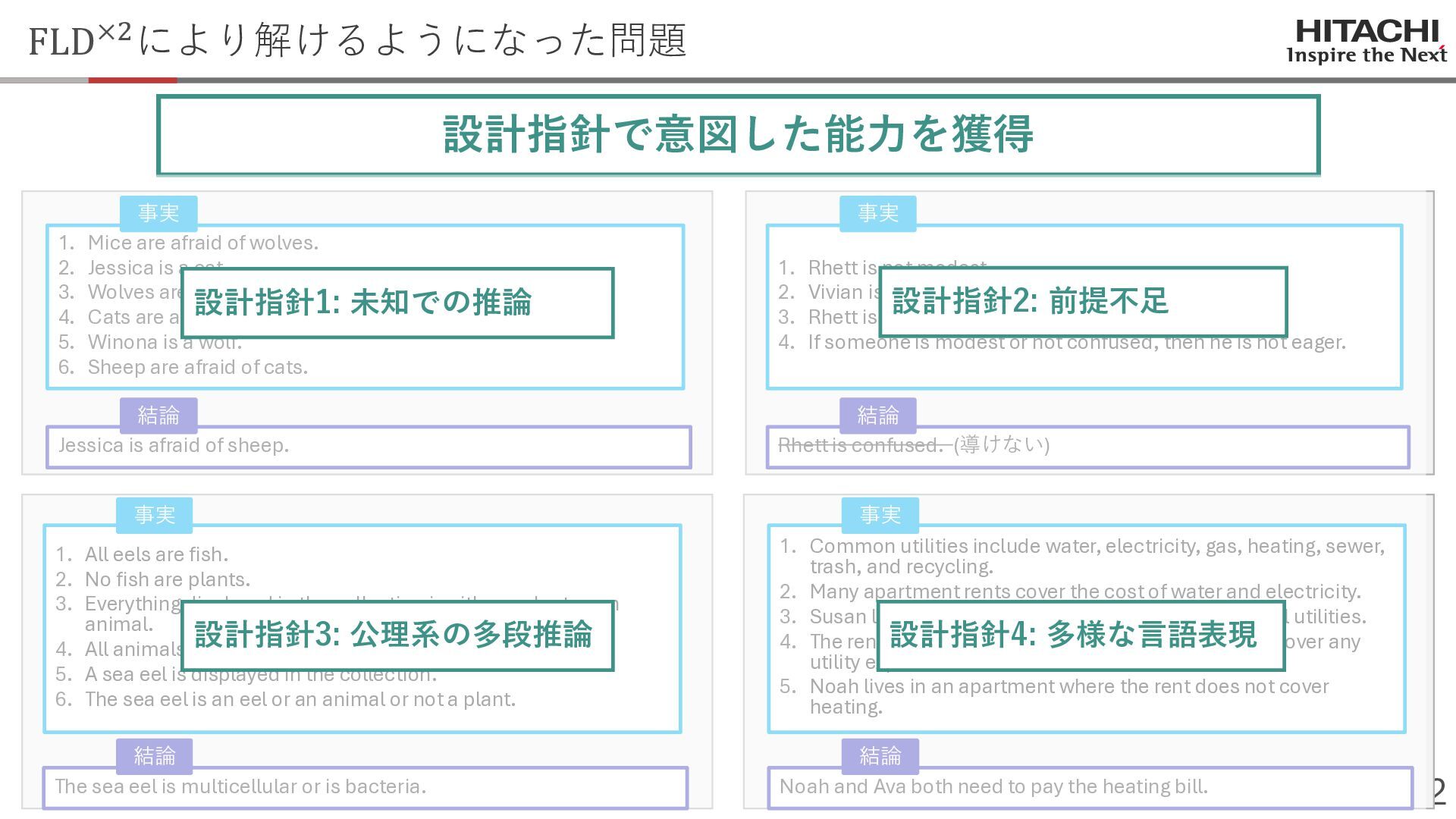 are afraid of wolves. 2. Jessica is a cat. 3. Wolves are afraid of cats. 4. Cats are afraid of sheep. 5. Winona is a wolf. 6. Sheep are afraid of cats. Jessica is afraid of sheep. 1. Rhett is not modest. 2. Vivian is confused. 3. Rhett is lazy. 4. If someone is modest or not confused, then he is not eager. Rhett is confused. (導けない) 1. All eels are fish. 2. No fish are plants. 3. Everything displayed in the collection is either a plant or an animal. 4. All animals displayed in the collection are multicellular. 5. A sea eel is displayed in the collection. 6. The sea eel is an eel or an animal or not a plant. 事実 1. Common utilities include water, electricity, gas, heating, sewer, trash, and recycling. 2. Many apartment rents cover the cost of water and electricity. 3. Susan lives in an apartment where the rent covers all utilities. 4. The rent of the apartment where Ava lives does not cover any utility expenses. 5. Noah lives in an apartment where the rent does not cover heating. 事実 事実 事実 結論 結論 Noah and Ava both need to pay the heating bill. The sea eel is multicellular or is bacteria. 結論 結論 FLD×2により解けるようになった問題 設計指針で意図した能力を獲得 設計指針1: 未知での推論 設計指針3: 公理系の多段推論 設計指針2: 前提不足 設計指針4: 多様な言語表現