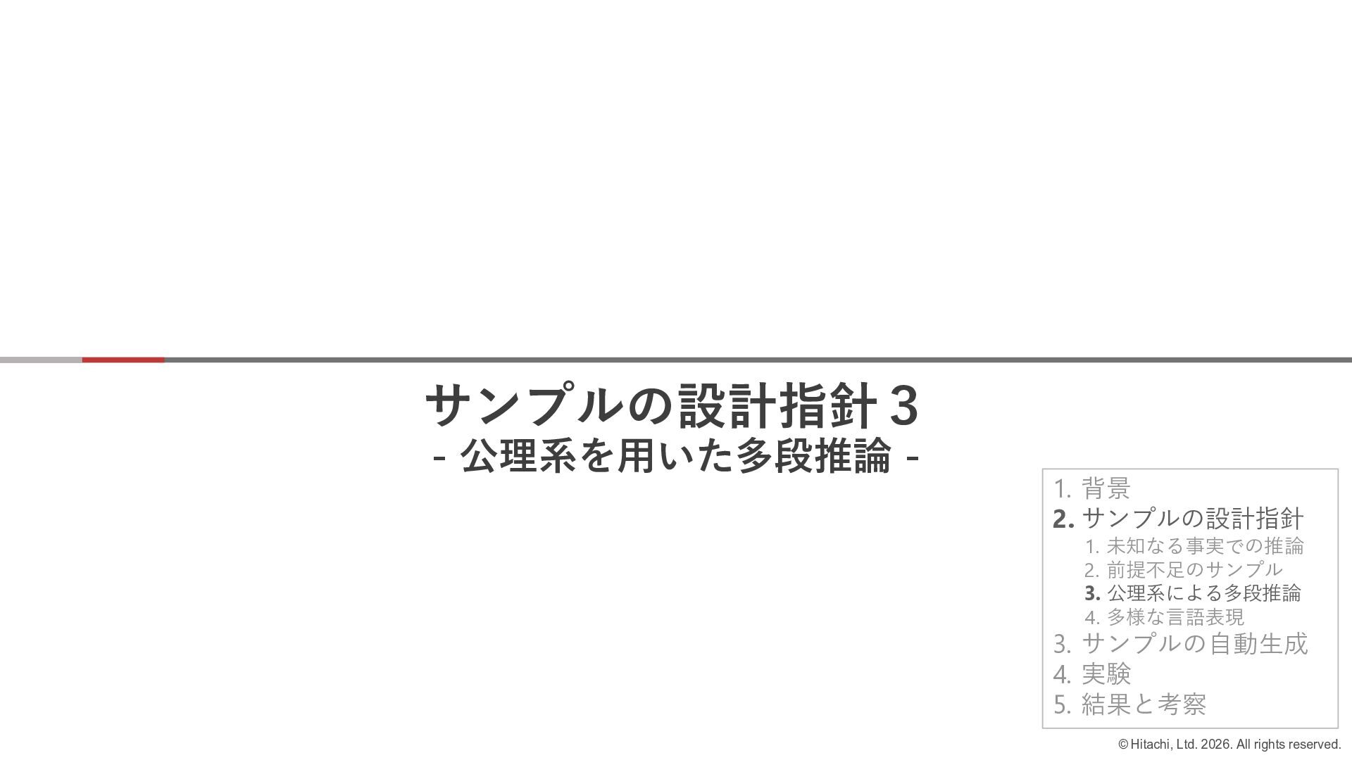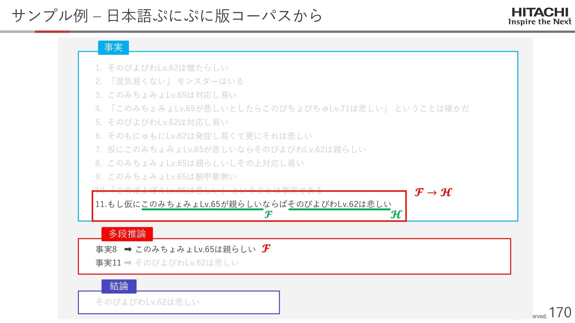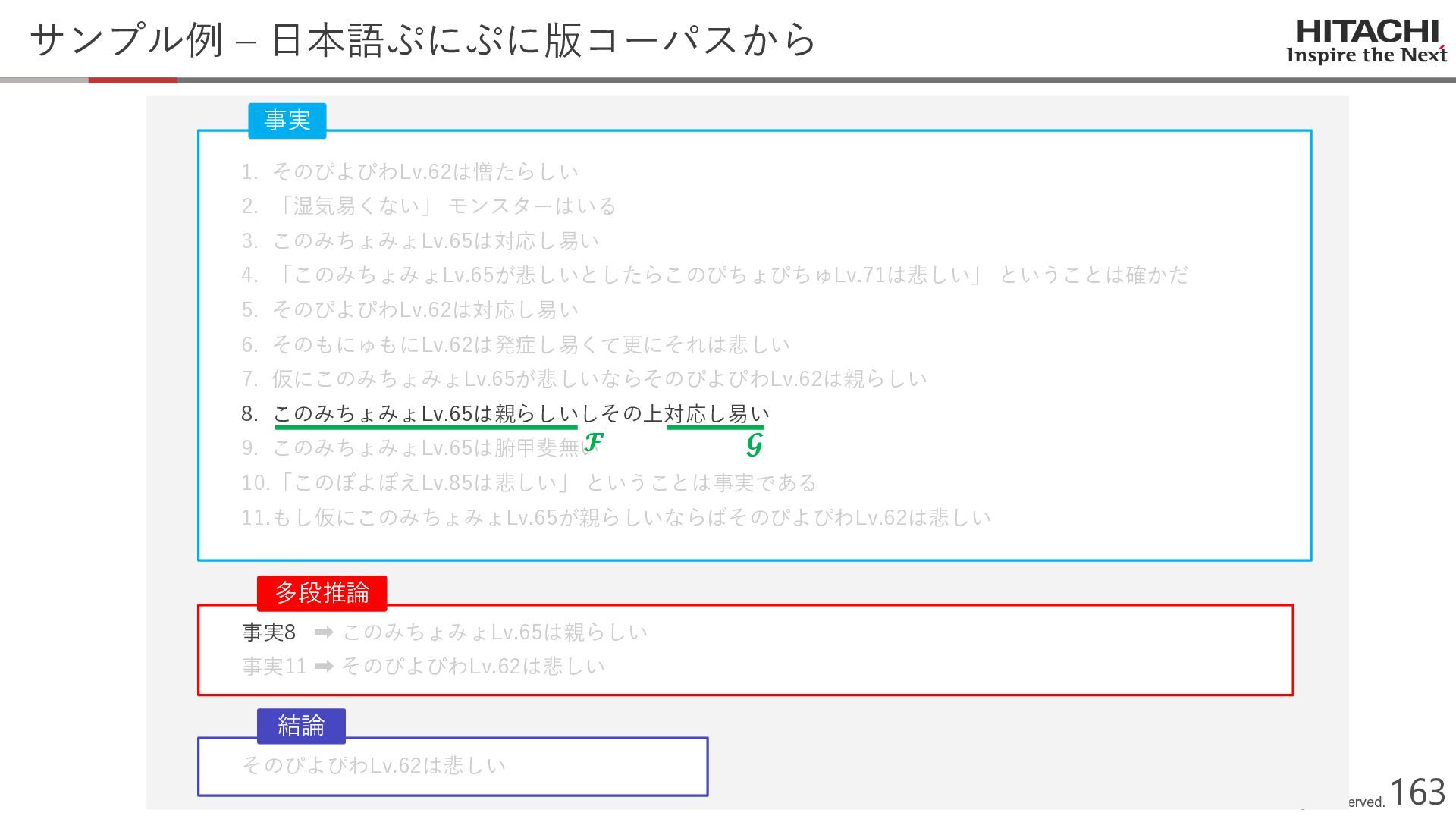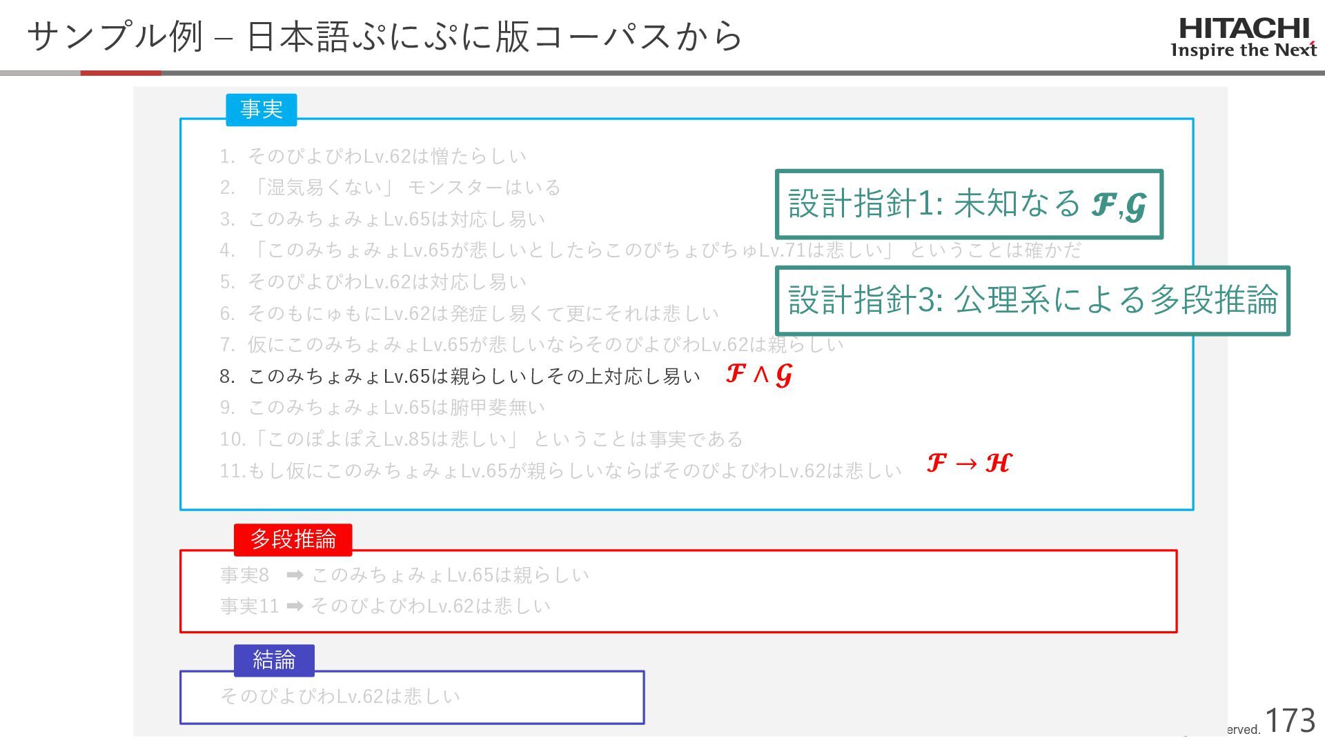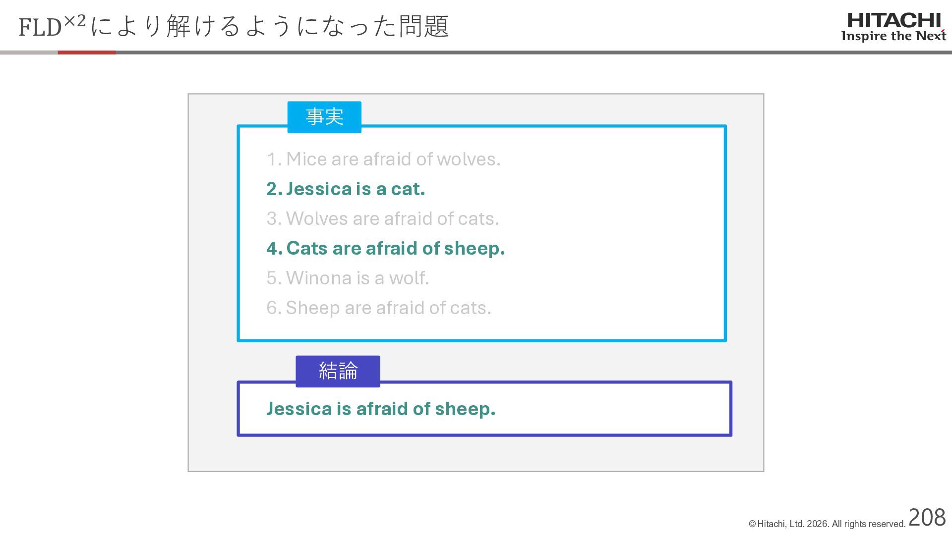 are afraid of wolves. 2. Jessica is a cat. 3. Wolves are afraid of cats. 4. Cats are afraid of sheep. 5. Winona is a wolf. 6. Sheep are afraid of cats. Jessica is afraid of sheep. 1. Rhett is not modest. 2. Vivian is confused. 3. Rhett is lazy. 4. If someone is modest or not confused, then he is not eager. Rhett is confused. (導けない) 1. All eels are fish. 2. No fish are plants. 3. Everything displayed in the collection is either a plant or an animal. 4. All animals displayed in the collection are multicellular. 5. A sea eel is displayed in the collection. 6. The sea eel is an eel or an animal or not a plant. 事実 1. Common utilities include water, electricity, gas, heating, sewer, trash, and recycling. 2. Many apartment rents cover the cost of water and electricity. 3. Susan lives in an apartment where the rent covers all utilities. 4. The rent of the apartment where Ava lives does not cover any utility expenses. 5. Noah lives in an apartment where the rent does not cover heating. 事実 事実 事実 結論 結論 Noah and Ava both need to pay the heating bill. The sea eel is multicellular or is bacteria. 結論 結論 FLD×2により解けるようになった問題 設計指針で意図した能力を獲得 設計指針1: 未知での推論 設計指針3: 公理系の多段推論 設計指針2: 前提不足 設計指針4: 多様な言語表現