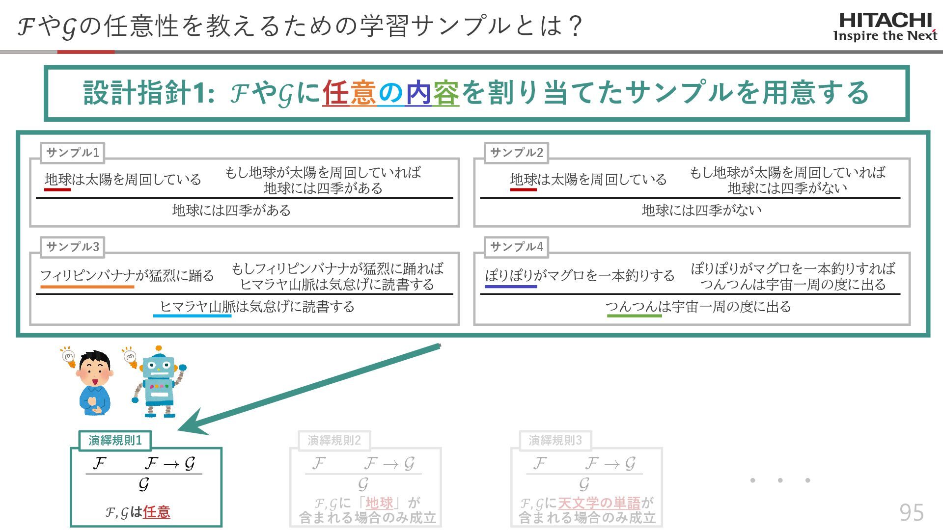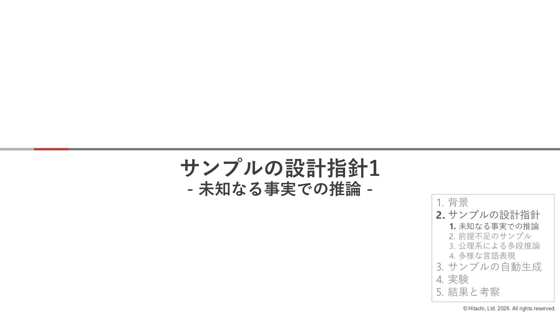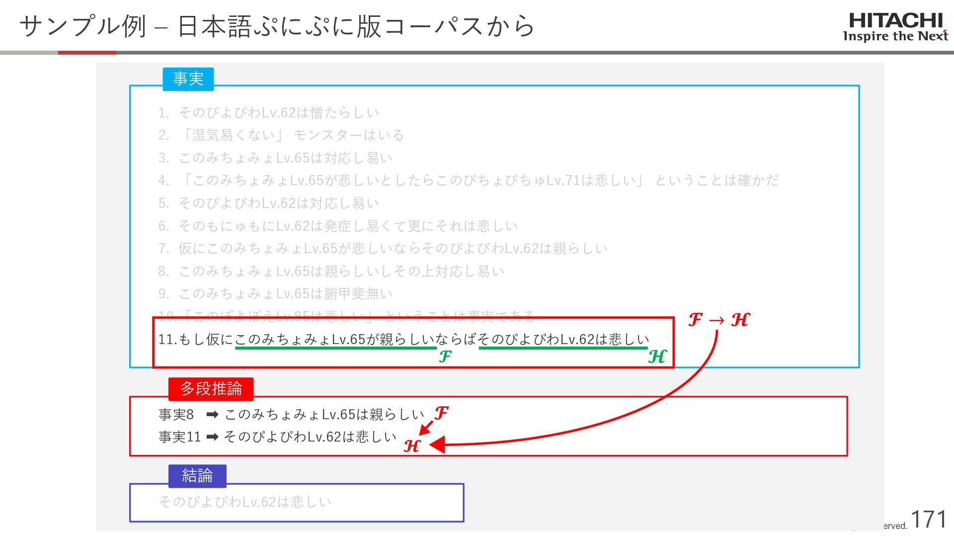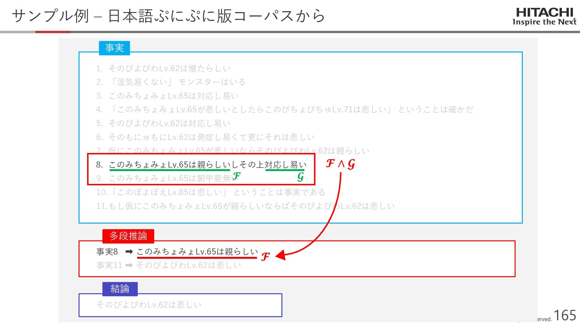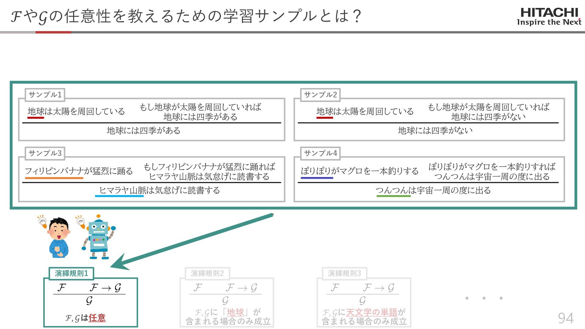 are afraid of wolves. 2. Jessica is a cat. 3. Wolves are afraid of cats. 4. Cats are afraid of sheep. 5. Winona is a wolf. 6. Sheep are afraid of cats. Jessica is afraid of sheep. 1. Rhett is not modest. 2. Vivian is confused. 3. Rhett is lazy. 4. If someone is modest or not confused, then he is not eager. Rhett is confused. (導けない) 1. All eels are fish. 2. No fish are plants. 3. Everything displayed in the collection is either a plant or an animal. 4. All animals displayed in the collection are multicellular. 5. A sea eel is displayed in the collection. 6. The sea eel is an eel or an animal or not a plant. 事実 1. Common utilities include water, electricity, gas, heating, sewer, trash, and recycling. 2. Many apartment rents cover the cost of water and electricity. 3. Susan lives in an apartment where the rent covers all utilities. 4. The rent of the apartment where Ava lives does not cover any utility expenses. 5. Noah lives in an apartment where the rent does not cover heating. 事実 事実 事実 結論 結論 Noah and Ava both need to pay the heating bill. The sea eel is multicellular or is bacteria. 結論 結論 FLD×2により解けるようになった問題 設計指針で意図した能力を獲得 設計指針1: 未知での推論 設計指針3: 公理系の多段推論 設計指針2: 前提不足 設計指針4: 多様な言語表現