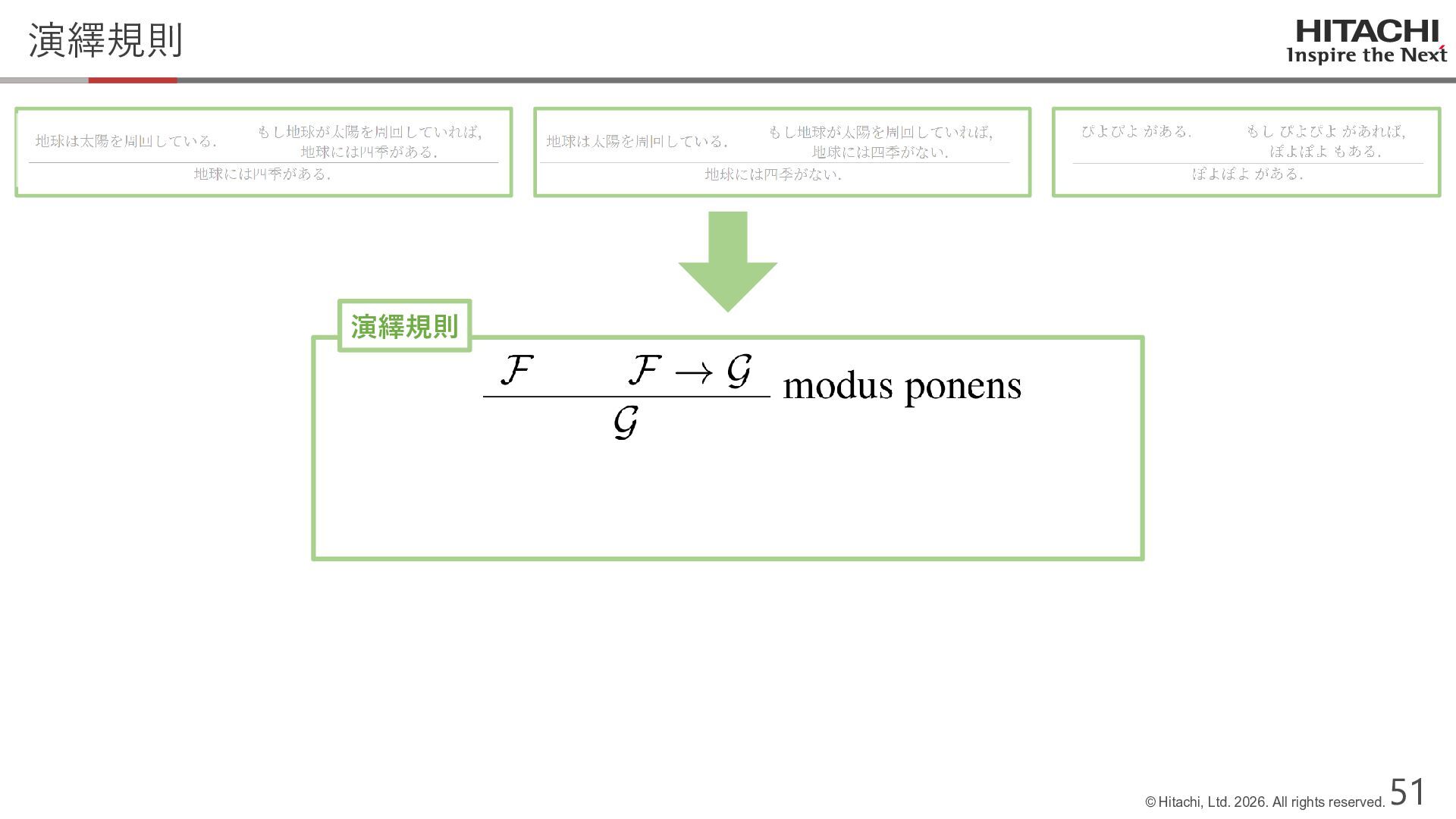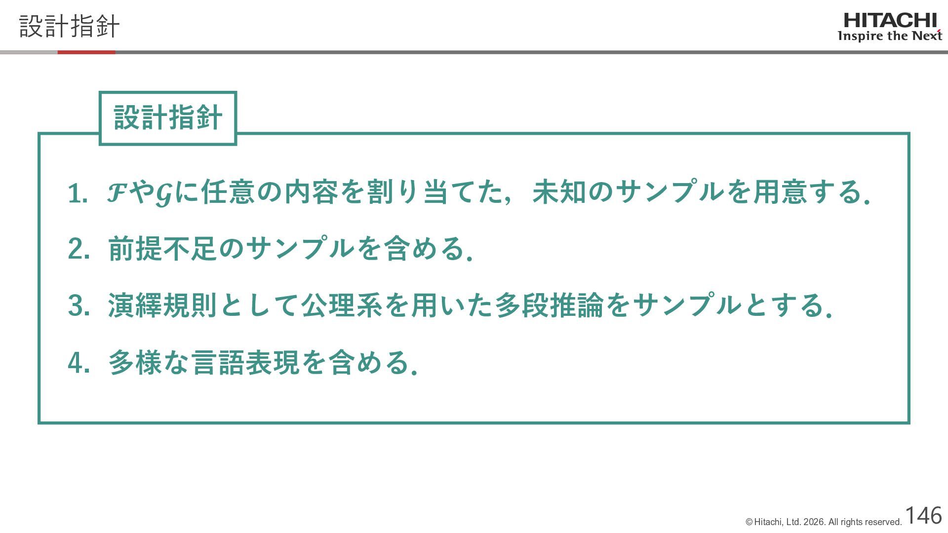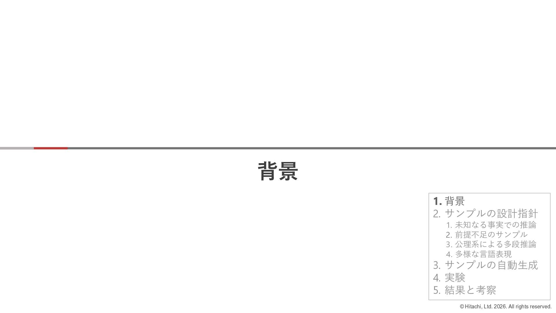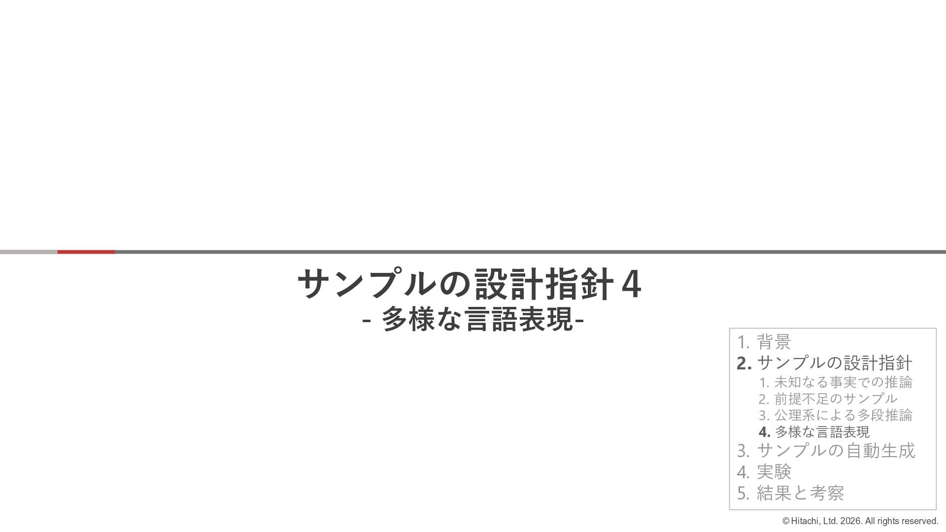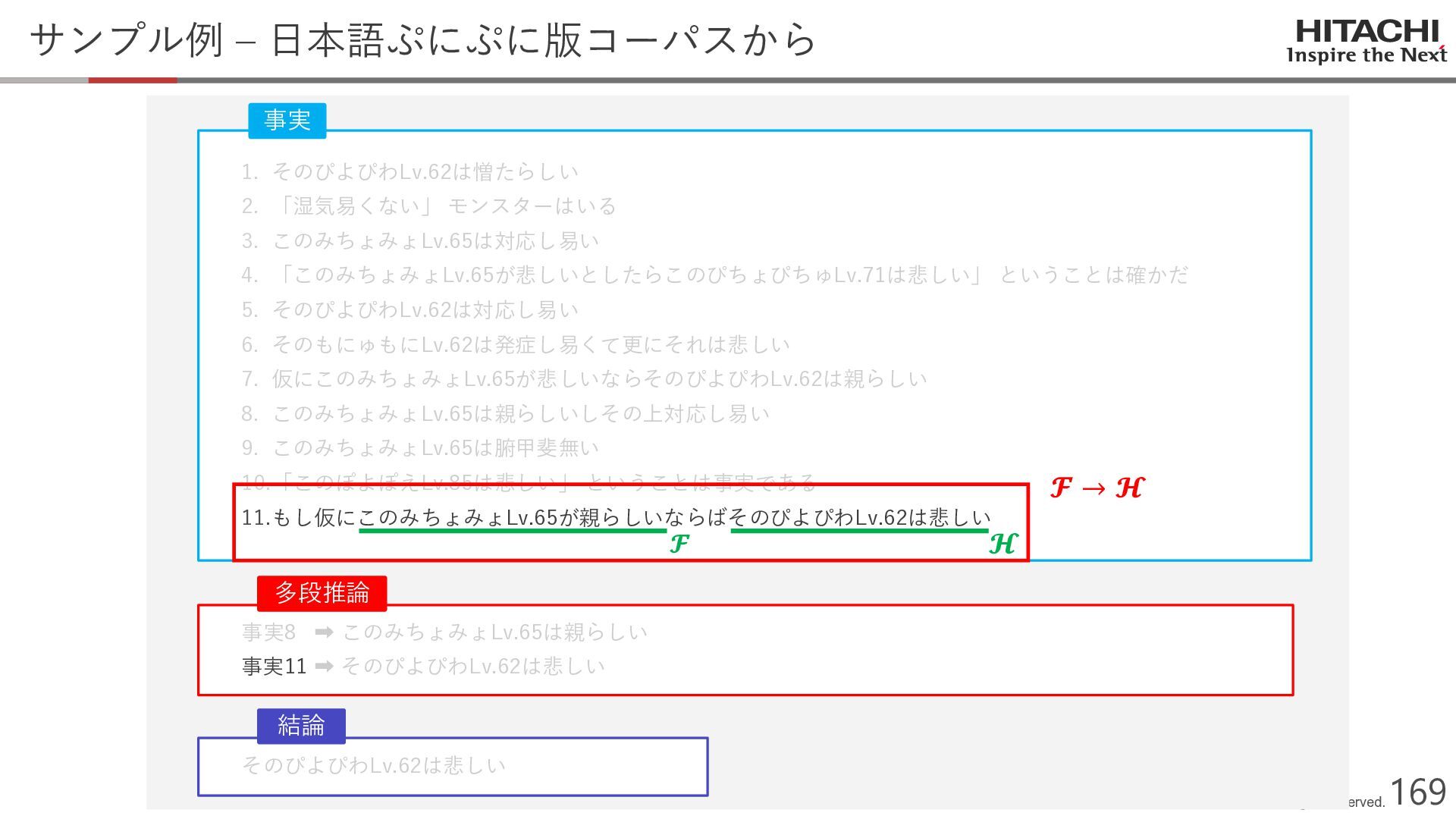 are afraid of wolves. 2. Jessica is a cat. 3. Wolves are afraid of cats. 4. Cats are afraid of sheep. 5. Winona is a wolf. 6. Sheep are afraid of cats. Jessica is afraid of sheep. 1. Rhett is not modest. 2. Vivian is confused. 3. Rhett is lazy. 4. If someone is modest or not confused, then he is not eager. Rhett is confused. (導けない) 1. All eels are fish. 2. No fish are plants. 3. Everything displayed in the collection is either a plant or an animal. 4. All animals displayed in the collection are multicellular. 5. A sea eel is displayed in the collection. 6. The sea eel is an eel or an animal or not a plant. 事実 1. Common utilities include water, electricity, gas, heating, sewer, trash, and recycling. 2. Many apartment rents cover the cost of water and electricity. 3. Susan lives in an apartment where the rent covers all utilities. 4. The rent of the apartment where Ava lives does not cover any utility expenses. 5. Noah lives in an apartment where the rent does not cover heating. 事実 事実 事実 結論 結論 Noah and Ava both need to pay the heating bill. The sea eel is multicellular or is bacteria. 結論 結論 FLD×2により解けるようになった問題 設計指針で意図した能力を獲得 設計指針1: 未知での推論 設計指針3: 公理系の多段推論 設計指針2: 前提不足 設計指針4: 多様な言語表現