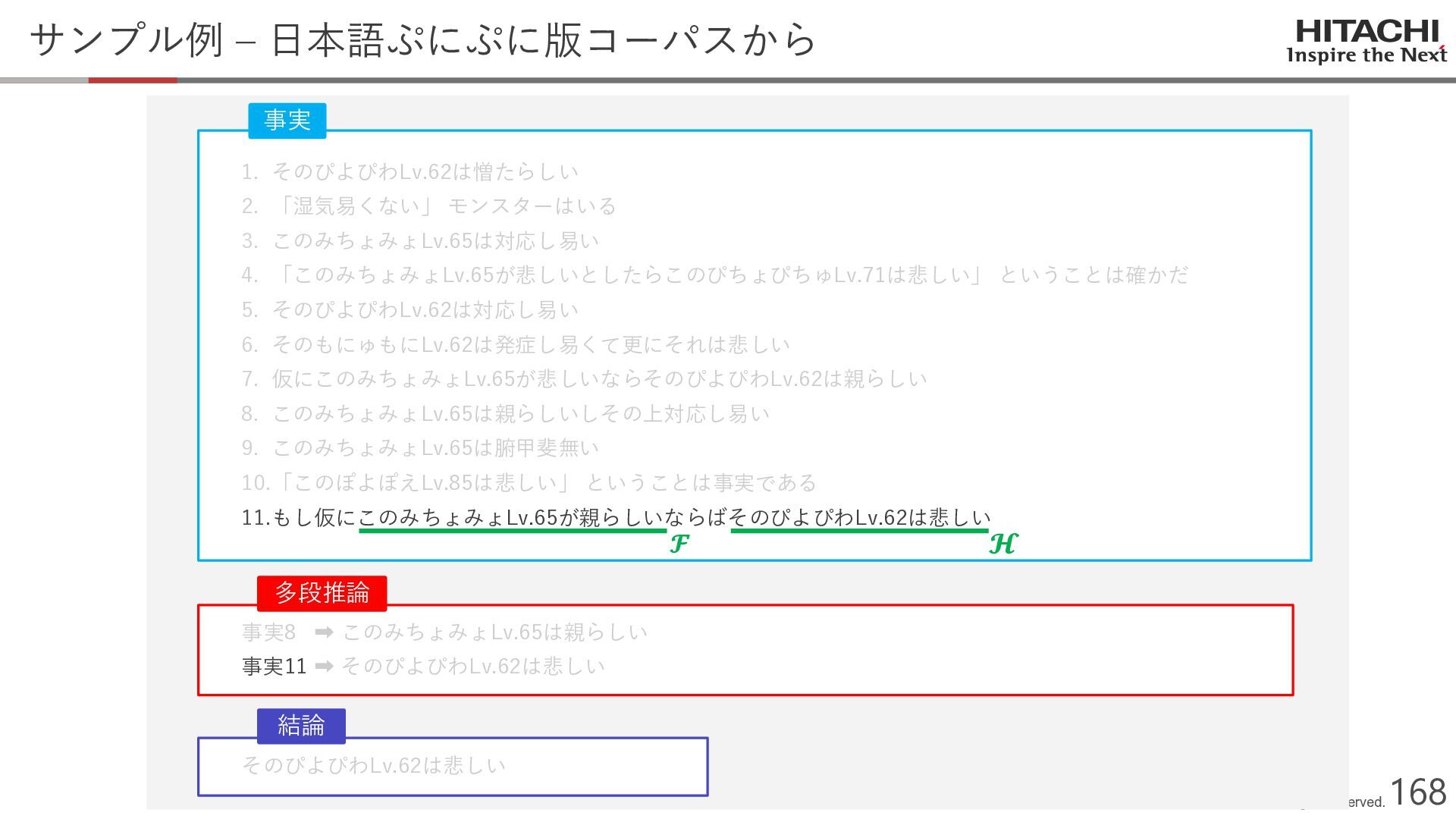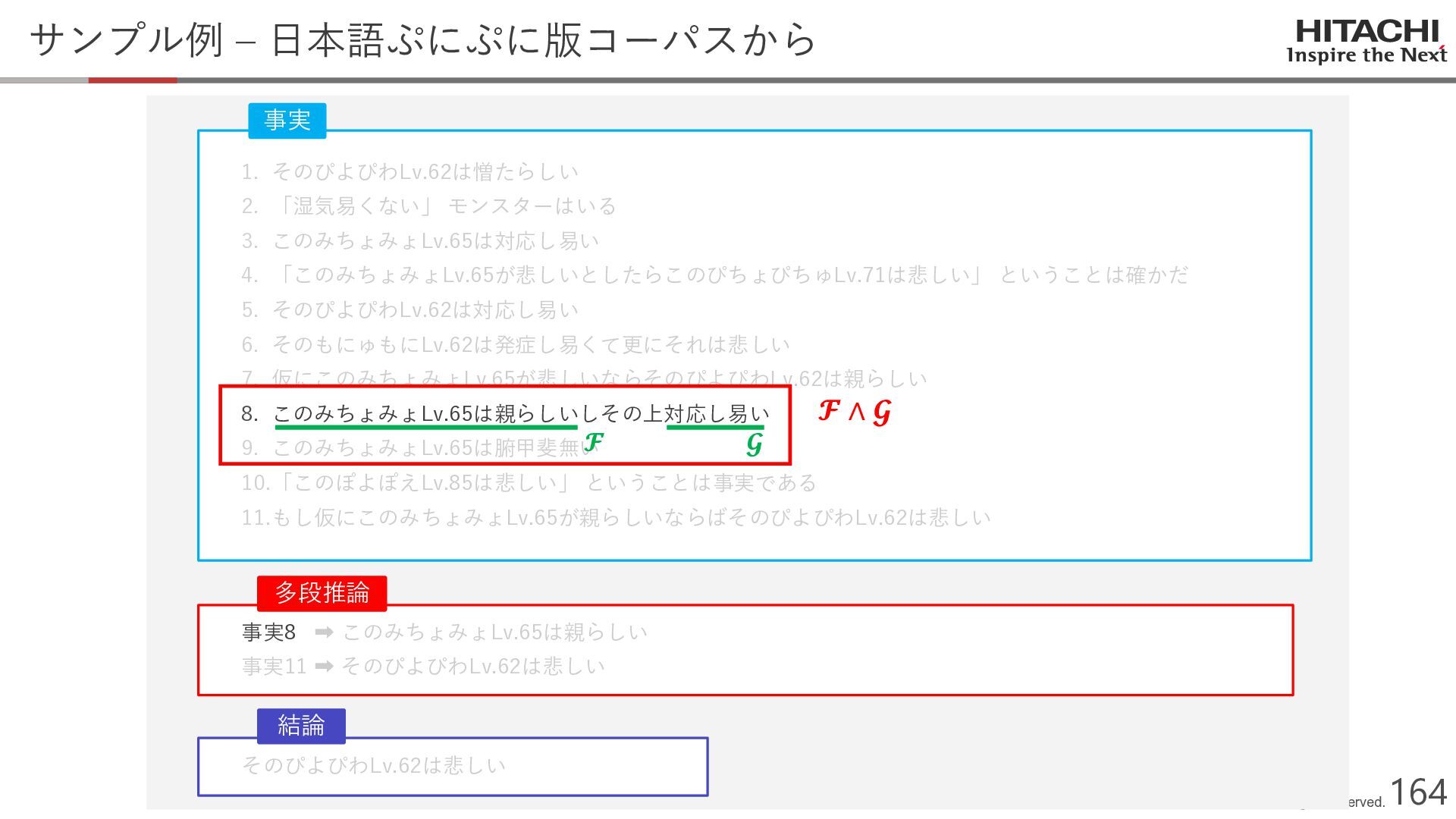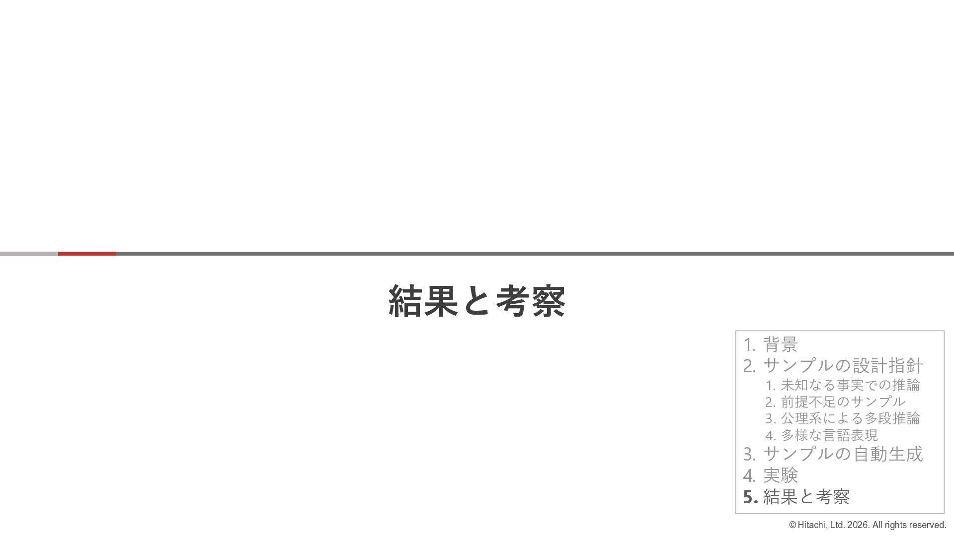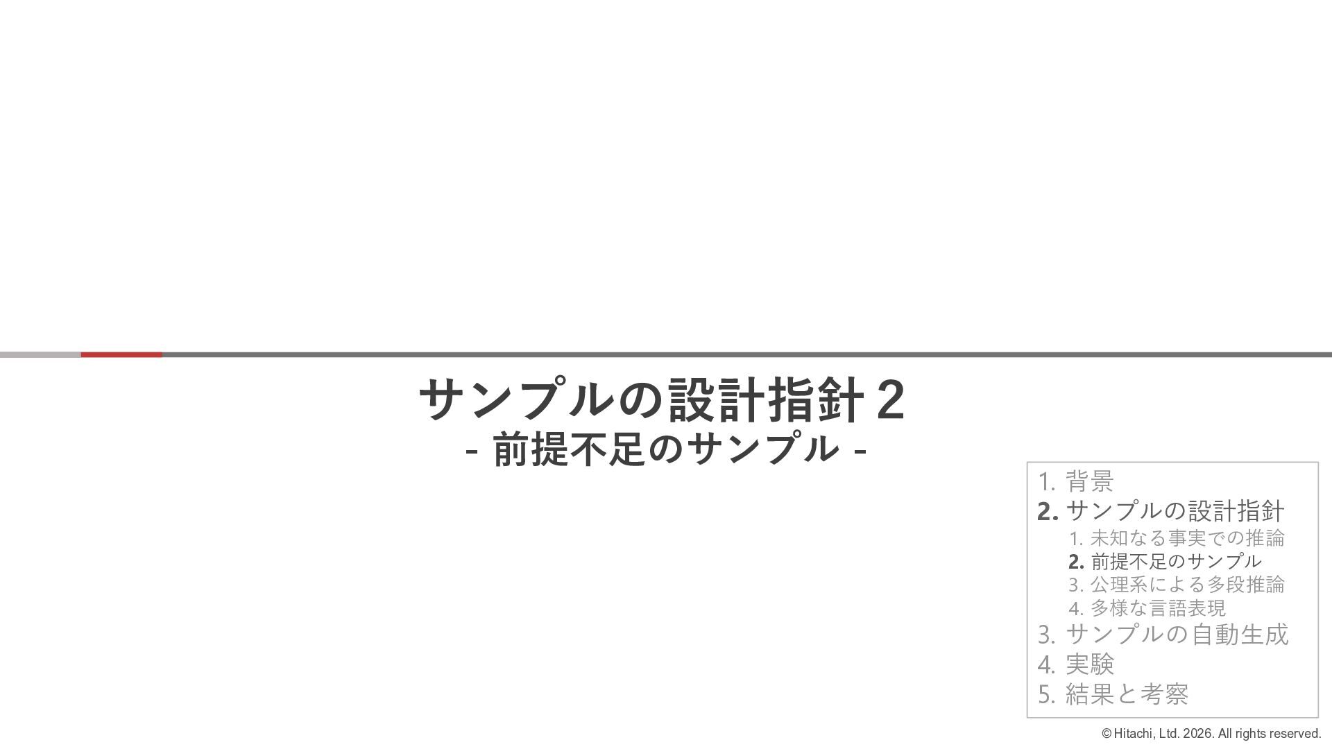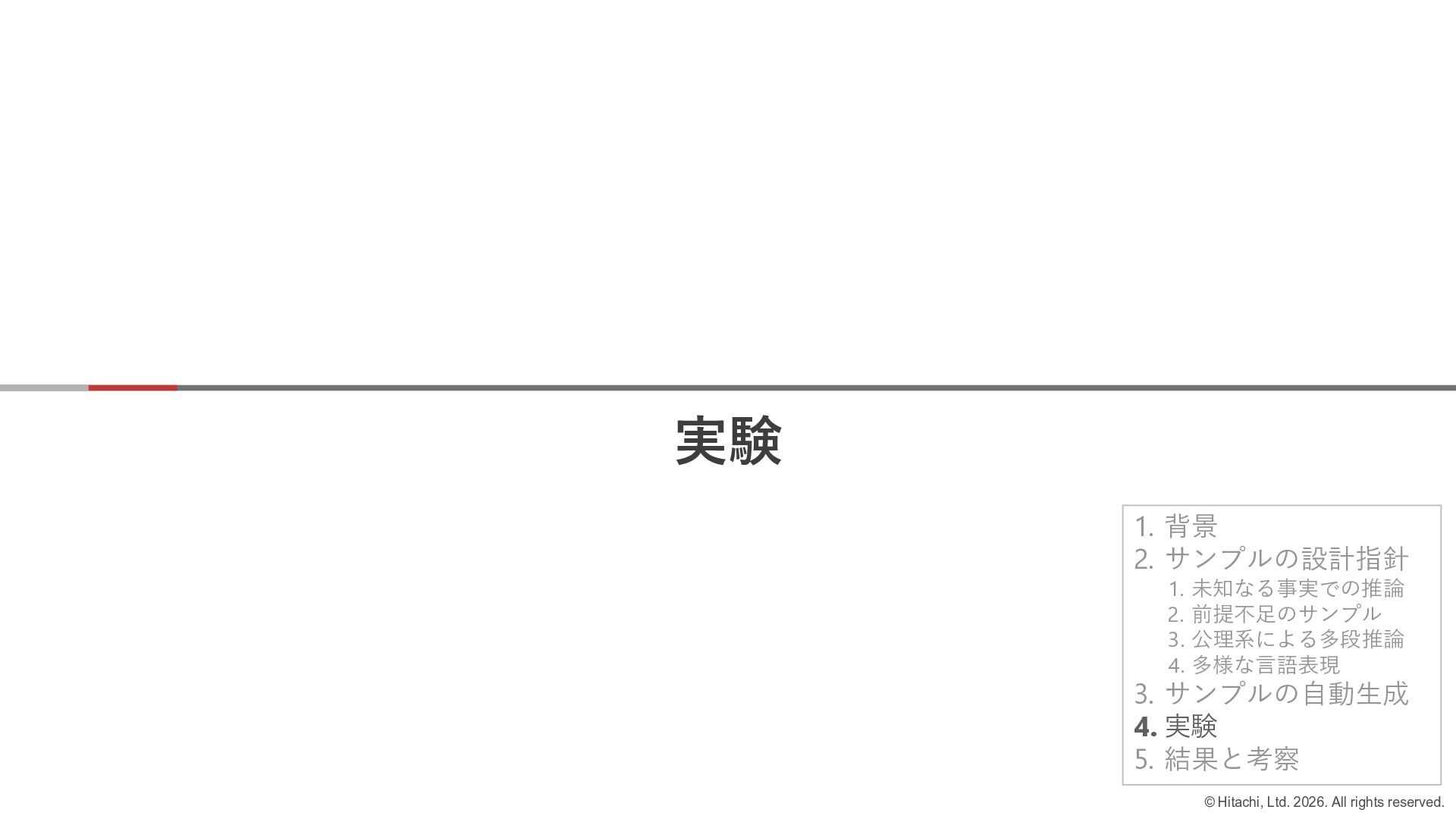 are afraid of wolves. 2. Jessica is a cat. 3. Wolves are afraid of cats. 4. Cats are afraid of sheep. 5. Winona is a wolf. 6. Sheep are afraid of cats. Jessica is afraid of sheep. 1. Rhett is not modest. 2. Vivian is confused. 3. Rhett is lazy. 4. If someone is modest or not confused, then he is not eager. Rhett is confused. (導けない) 1. All eels are fish. 2. No fish are plants. 3. Everything displayed in the collection is either a plant or an animal. 4. All animals displayed in the collection are multicellular. 5. A sea eel is displayed in the collection. 6. The sea eel is an eel or an animal or not a plant. 事実 1. Common utilities include water, electricity, gas, heating, sewer, trash, and recycling. 2. Many apartment rents cover the cost of water and electricity. 3. Susan lives in an apartment where the rent covers all utilities. 4. The rent of the apartment where Ava lives does not cover any utility expenses. 5. Noah lives in an apartment where the rent does not cover heating. 事実 事実 事実 結論 結論 Noah and Ava both need to pay the heating bill. The sea eel is multicellular or is bacteria. 結論 結論 FLD×2により解けるようになった問題 設計指針で意図した能力を獲得 設計指針1: 未知での推論 設計指針3: 公理系の多段推論 設計指針2: 前提不足 設計指針4: 多様な言語表現
