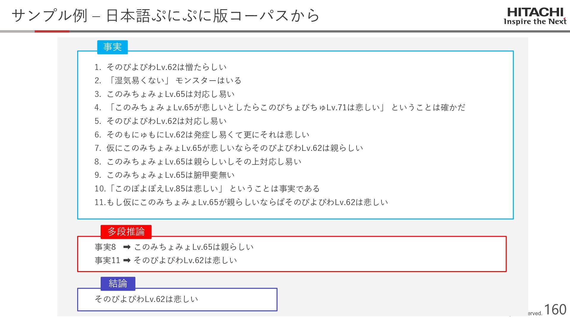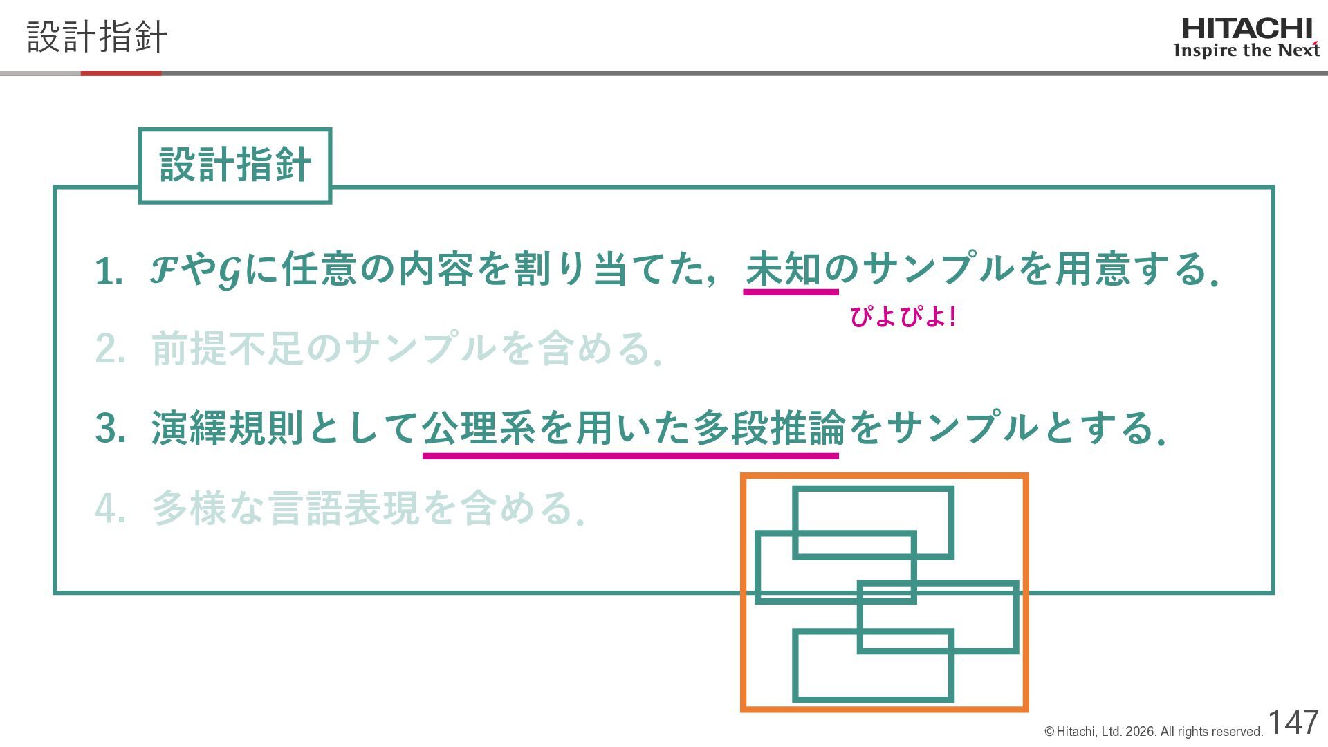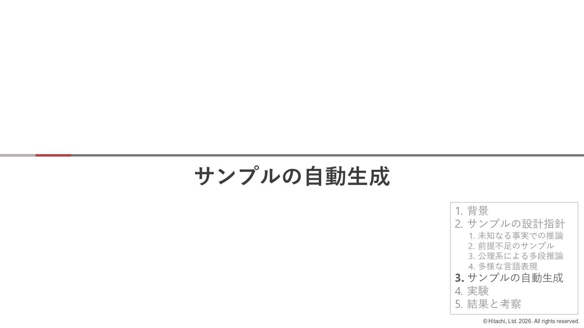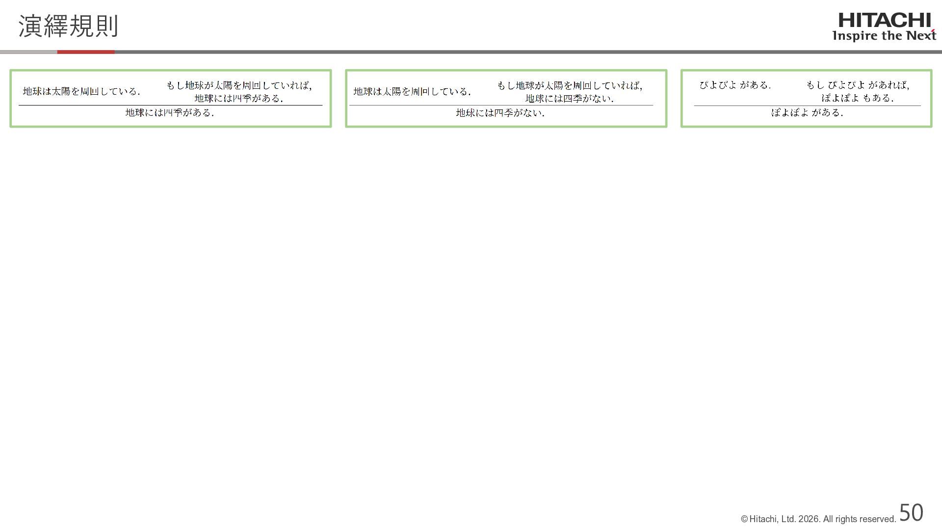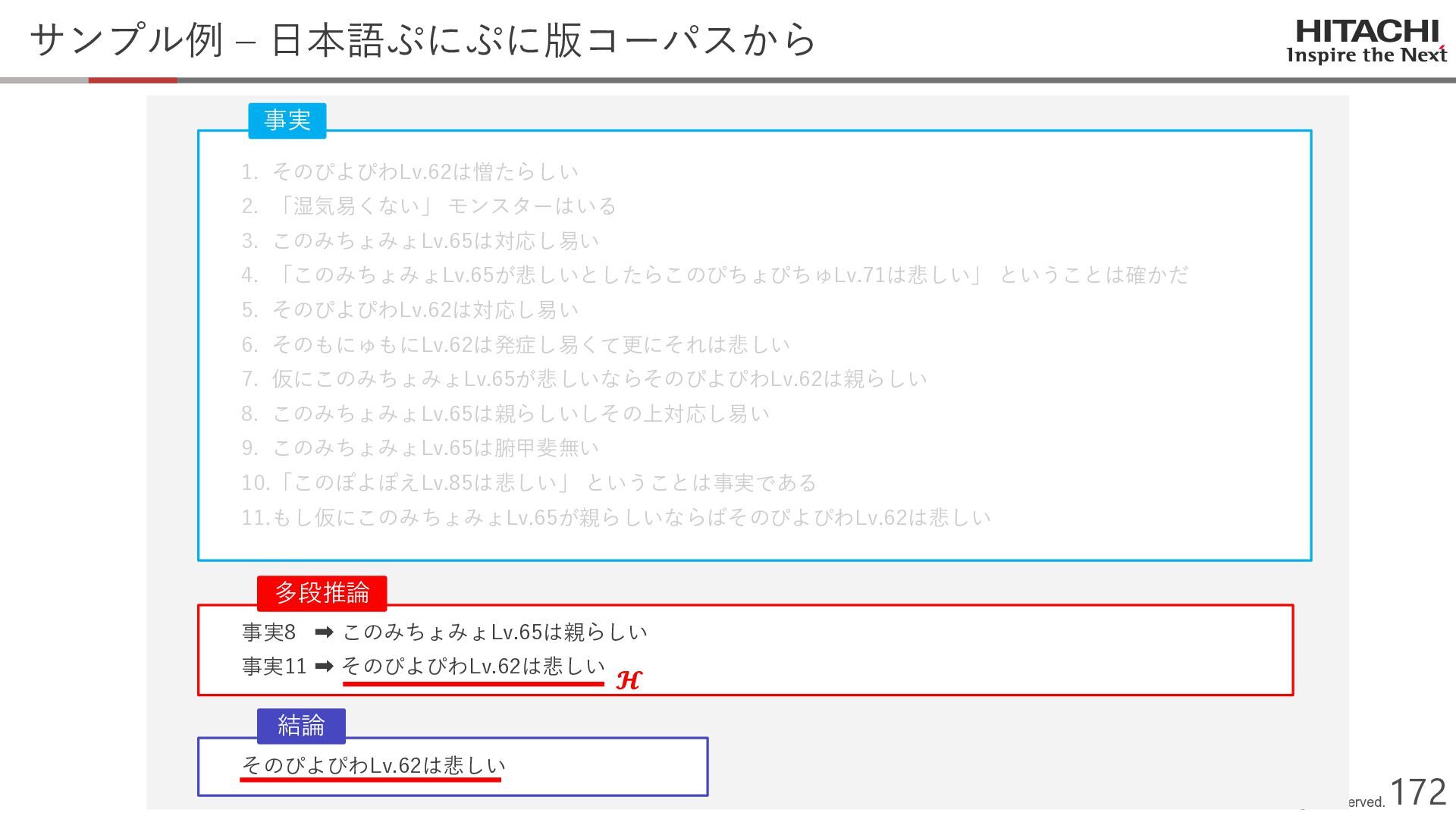 are afraid of wolves. 2. Jessica is a cat. 3. Wolves are afraid of cats. 4. Cats are afraid of sheep. 5. Winona is a wolf. 6. Sheep are afraid of cats. Jessica is afraid of sheep. 1. Rhett is not modest. 2. Vivian is confused. 3. Rhett is lazy. 4. If someone is modest or not confused, then he is not eager. Rhett is confused. (導けない) 1. All eels are fish. 2. No fish are plants. 3. Everything displayed in the collection is either a plant or an animal. 4. All animals displayed in the collection are multicellular. 5. A sea eel is displayed in the collection. 6. The sea eel is an eel or an animal or not a plant. 事実 1. Common utilities include water, electricity, gas, heating, sewer, trash, and recycling. 2. Many apartment rents cover the cost of water and electricity. 3. Susan lives in an apartment where the rent covers all utilities. 4. The rent of the apartment where Ava lives does not cover any utility expenses. 5. Noah lives in an apartment where the rent does not cover heating. 事実 事実 事実 結論 結論 Noah and Ava both need to pay the heating bill. The sea eel is multicellular or is bacteria. 結論 結論 FLD×2により解けるようになった問題 設計指針で意図した能力を獲得 設計指針1: 未知での推論 設計指針3: 公理系の多段推論 設計指針2: 前提不足 設計指針4: 多様な言語表現