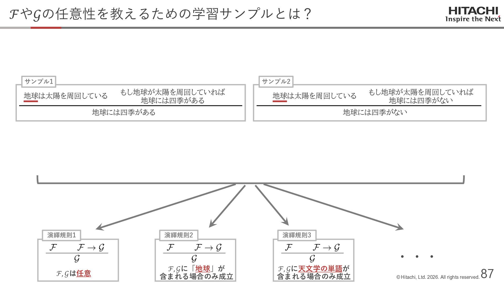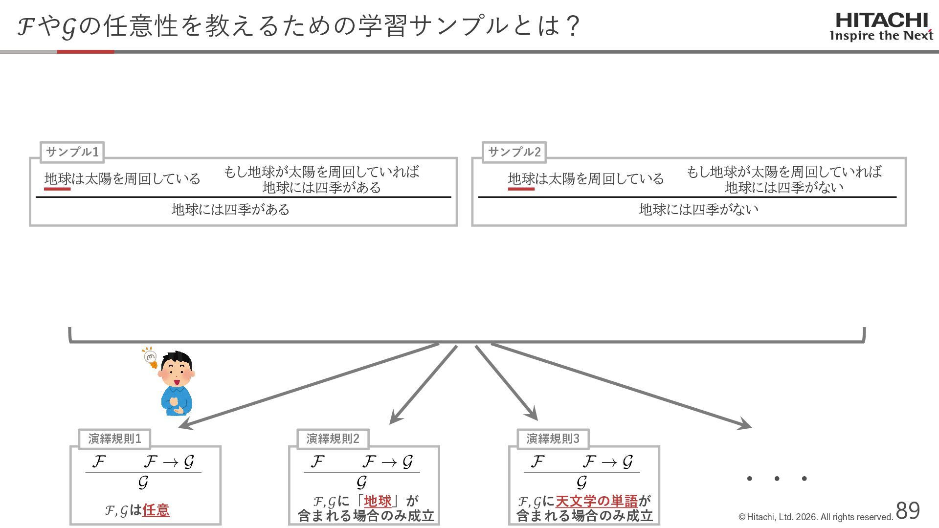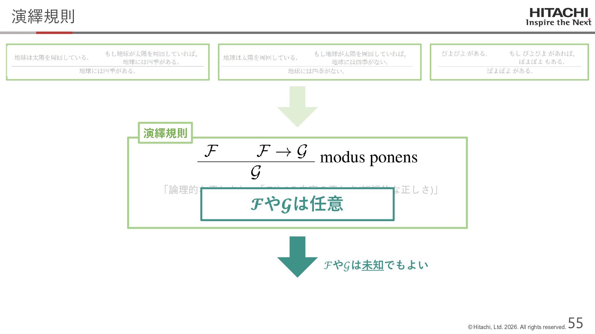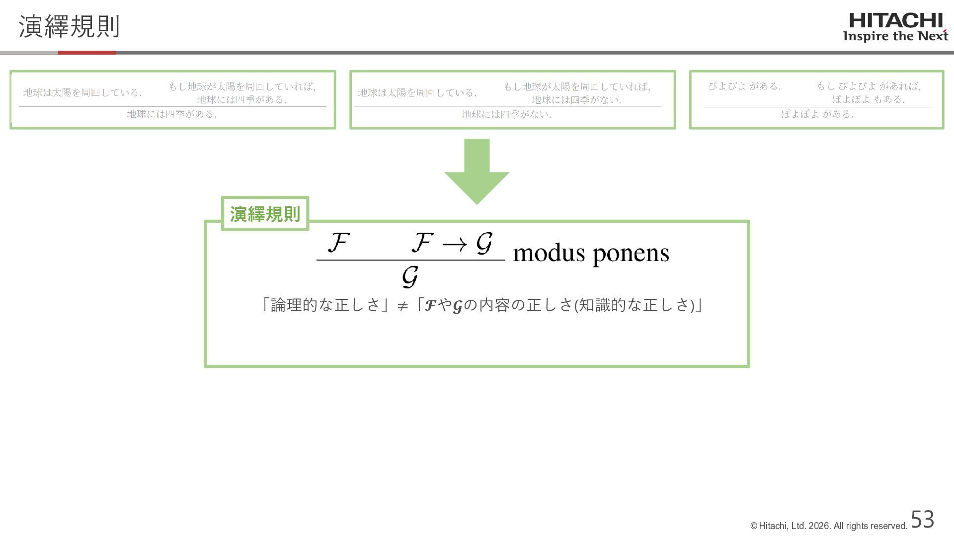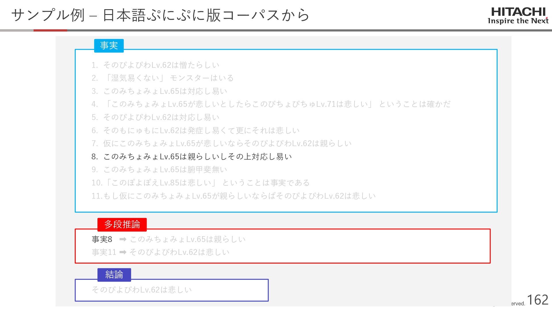 are afraid of wolves. 2. Jessica is a cat. 3. Wolves are afraid of cats. 4. Cats are afraid of sheep. 5. Winona is a wolf. 6. Sheep are afraid of cats. Jessica is afraid of sheep. 1. Rhett is not modest. 2. Vivian is confused. 3. Rhett is lazy. 4. If someone is modest or not confused, then he is not eager. Rhett is confused. (導けない) 1. All eels are fish. 2. No fish are plants. 3. Everything displayed in the collection is either a plant or an animal. 4. All animals displayed in the collection are multicellular. 5. A sea eel is displayed in the collection. 6. The sea eel is an eel or an animal or not a plant. 事実 1. Common utilities include water, electricity, gas, heating, sewer, trash, and recycling. 2. Many apartment rents cover the cost of water and electricity. 3. Susan lives in an apartment where the rent covers all utilities. 4. The rent of the apartment where Ava lives does not cover any utility expenses. 5. Noah lives in an apartment where the rent does not cover heating. 事実 事実 事実 結論 結論 Noah and Ava both need to pay the heating bill. The sea eel is multicellular or is bacteria. 結論 結論 FLD×2により解けるようになった問題 設計指針で意図した能力を獲得 設計指針1: 未知での推論 設計指針3: 公理系の多段推論 設計指針2: 前提不足 設計指針4: 多様な言語表現