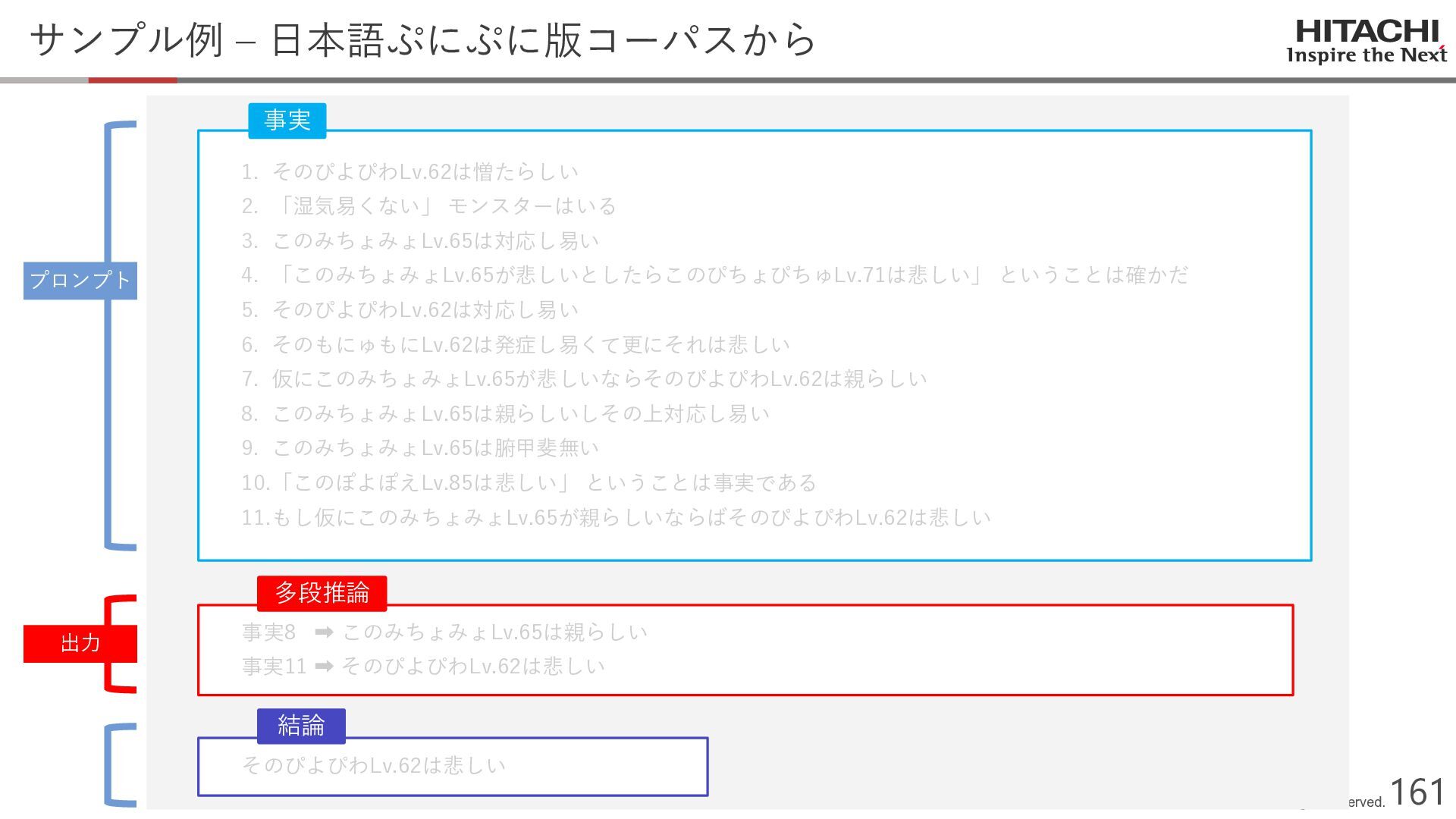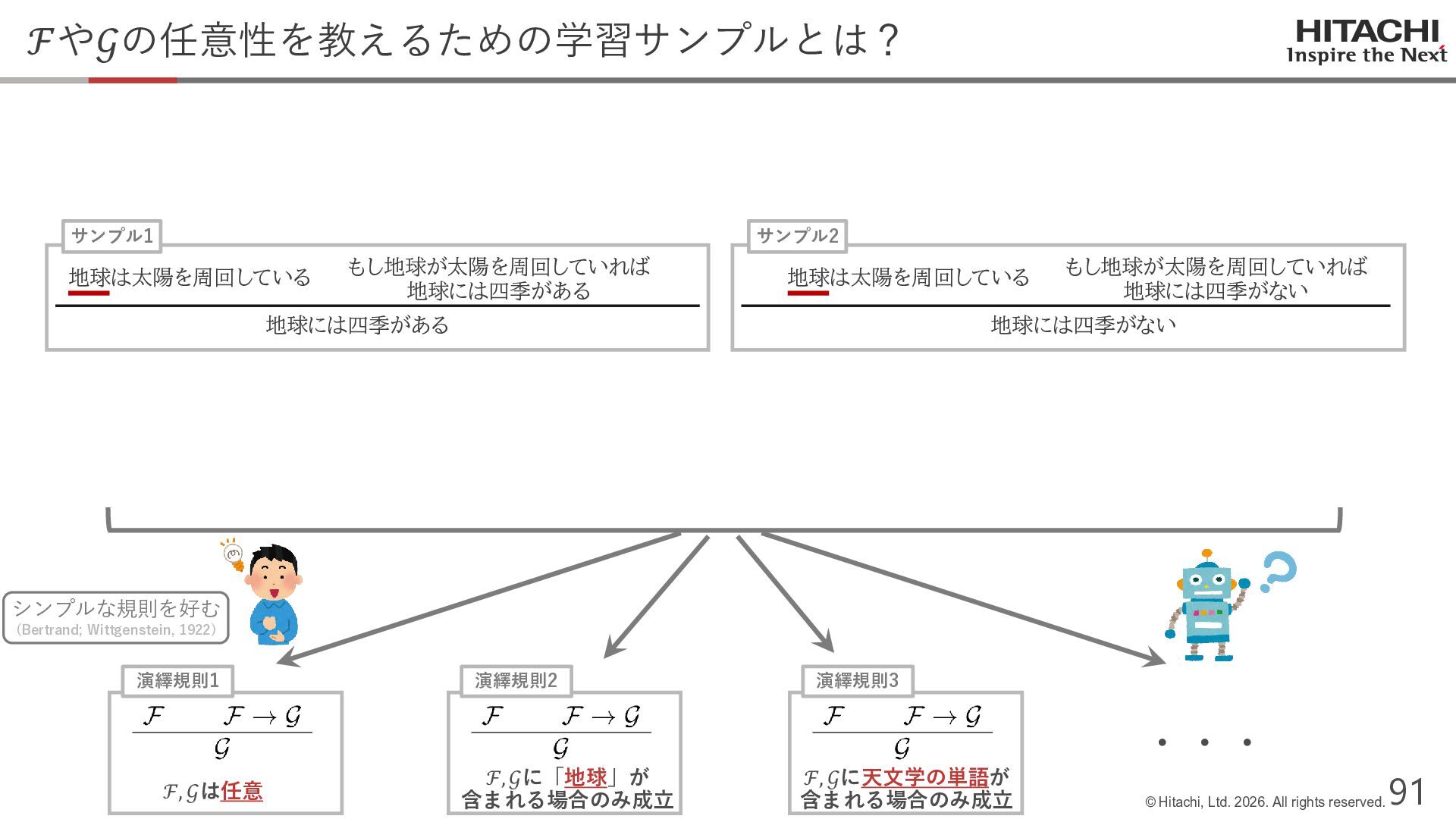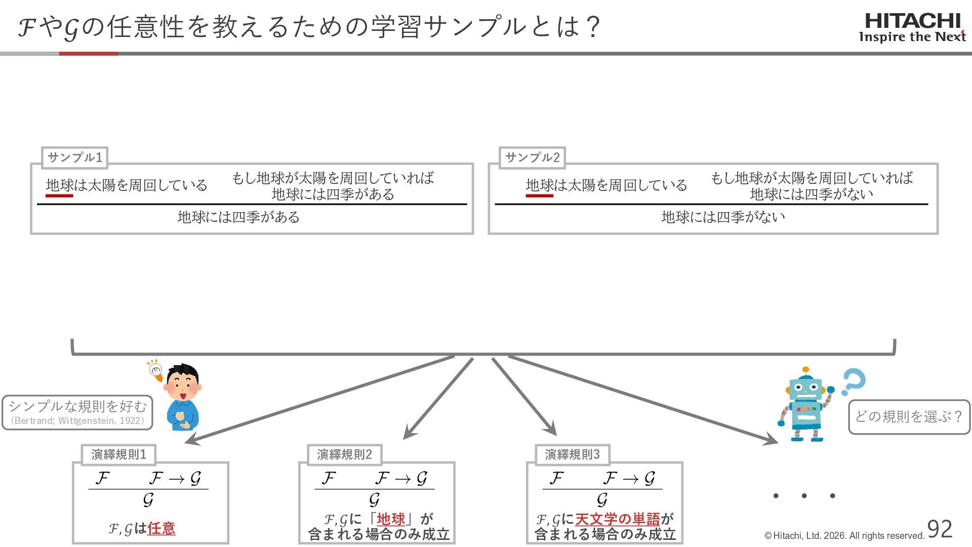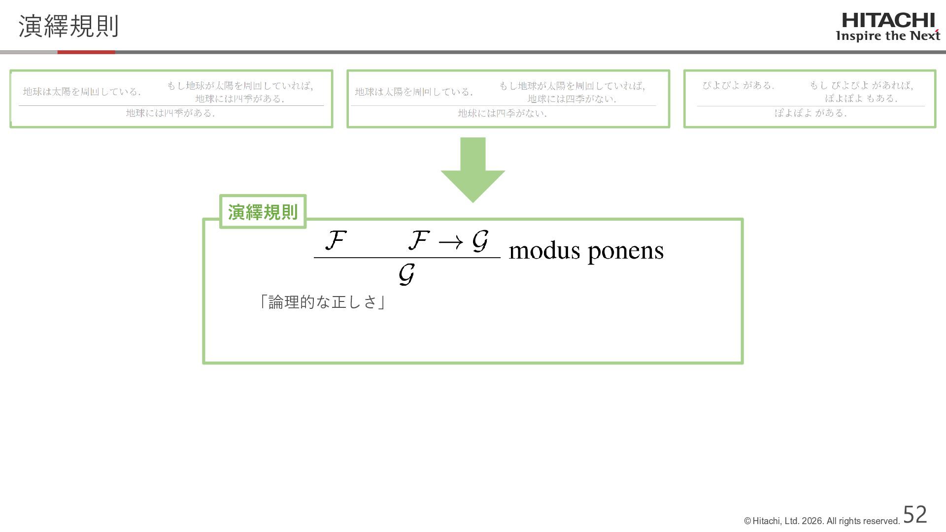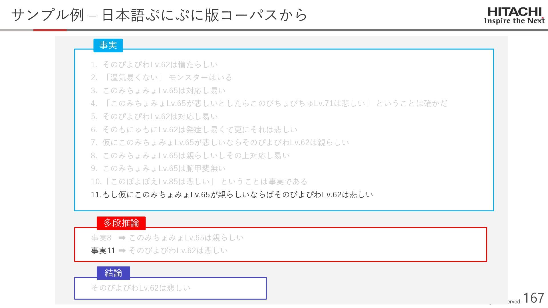 are afraid of wolves. 2. Jessica is a cat. 3. Wolves are afraid of cats. 4. Cats are afraid of sheep. 5. Winona is a wolf. 6. Sheep are afraid of cats. Jessica is afraid of sheep. 1. Rhett is not modest. 2. Vivian is confused. 3. Rhett is lazy. 4. If someone is modest or not confused, then he is not eager. Rhett is confused. (導けない) 1. All eels are fish. 2. No fish are plants. 3. Everything displayed in the collection is either a plant or an animal. 4. All animals displayed in the collection are multicellular. 5. A sea eel is displayed in the collection. 6. The sea eel is an eel or an animal or not a plant. 事実 1. Common utilities include water, electricity, gas, heating, sewer, trash, and recycling. 2. Many apartment rents cover the cost of water and electricity. 3. Susan lives in an apartment where the rent covers all utilities. 4. The rent of the apartment where Ava lives does not cover any utility expenses. 5. Noah lives in an apartment where the rent does not cover heating. 事実 事実 事実 結論 結論 Noah and Ava both need to pay the heating bill. The sea eel is multicellular or is bacteria. 結論 結論 FLD×2により解けるようになった問題 設計指針で意図した能力を獲得 設計指針1: 未知での推論 設計指針3: 公理系の多段推論 設計指針2: 前提不足 設計指針4: 多様な言語表現