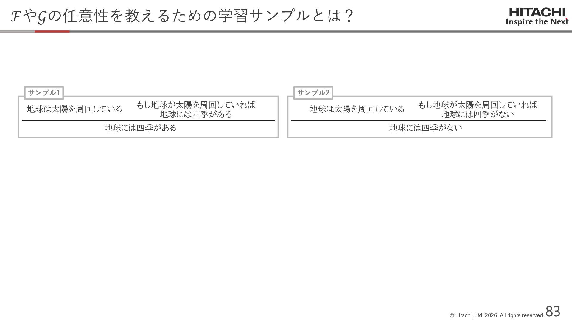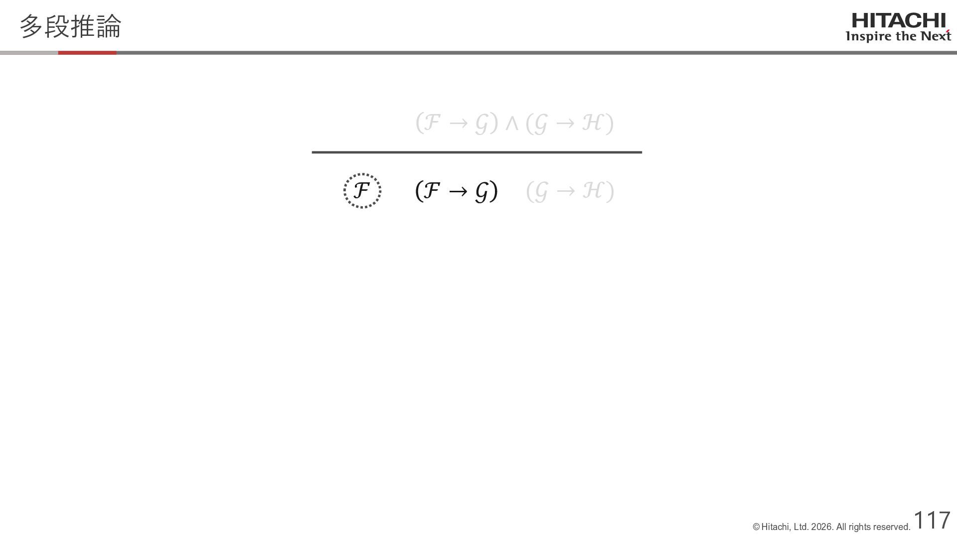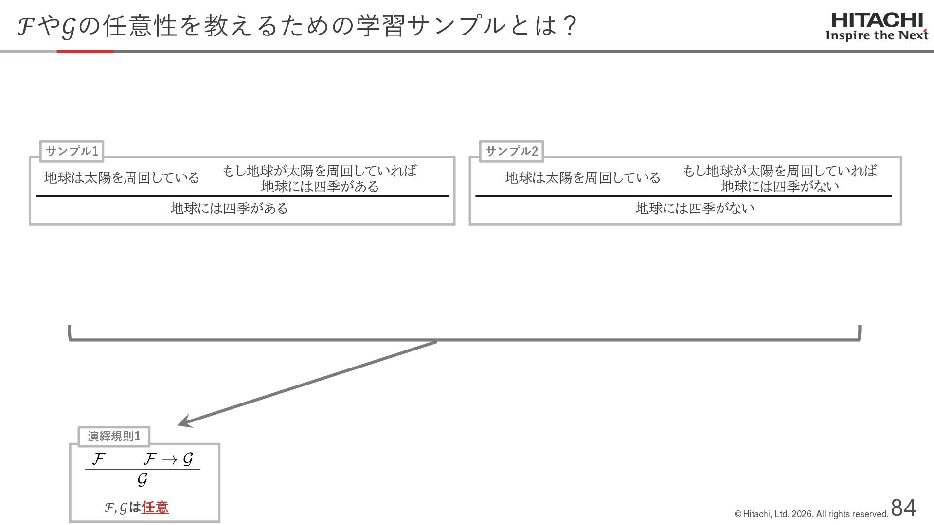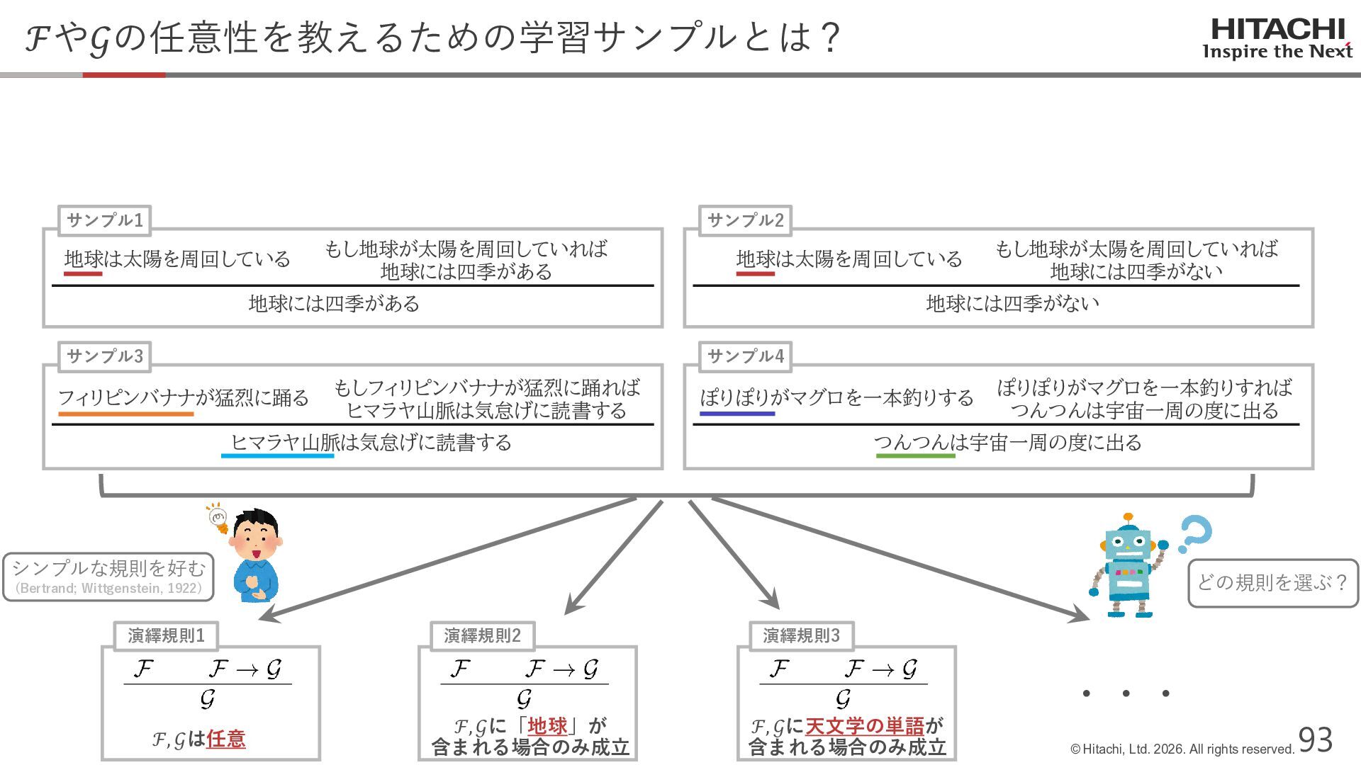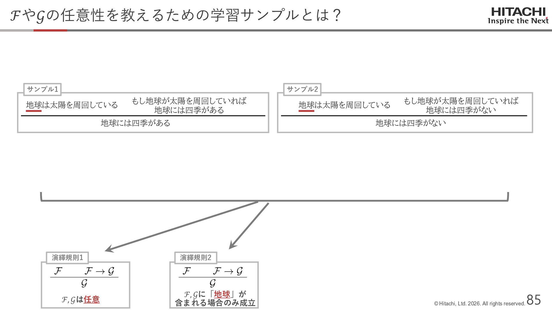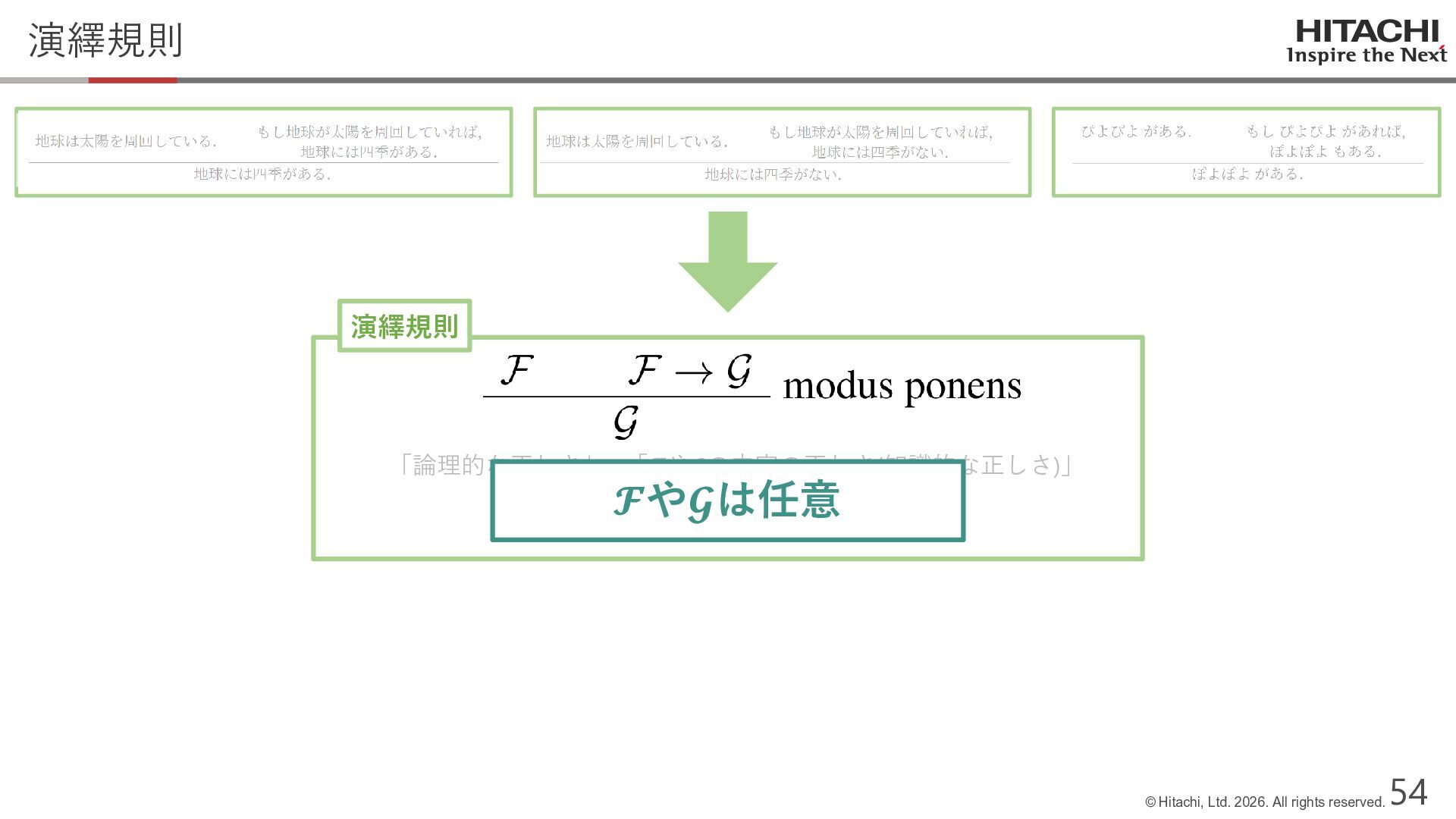 are afraid of wolves. 2. Jessica is a cat. 3. Wolves are afraid of cats. 4. Cats are afraid of sheep. 5. Winona is a wolf. 6. Sheep are afraid of cats. Jessica is afraid of sheep. 1. Rhett is not modest. 2. Vivian is confused. 3. Rhett is lazy. 4. If someone is modest or not confused, then he is not eager. Rhett is confused. (導けない) 1. All eels are fish. 2. No fish are plants. 3. Everything displayed in the collection is either a plant or an animal. 4. All animals displayed in the collection are multicellular. 5. A sea eel is displayed in the collection. 6. The sea eel is an eel or an animal or not a plant. 事実 1. Common utilities include water, electricity, gas, heating, sewer, trash, and recycling. 2. Many apartment rents cover the cost of water and electricity. 3. Susan lives in an apartment where the rent covers all utilities. 4. The rent of the apartment where Ava lives does not cover any utility expenses. 5. Noah lives in an apartment where the rent does not cover heating. 事実 事実 事実 結論 結論 Noah and Ava both need to pay the heating bill. The sea eel is multicellular or is bacteria. 結論 結論 FLD×2により解けるようになった問題 設計指針で意図した能力を獲得 設計指針1: 未知での推論 設計指針3: 公理系の多段推論 設計指針2: 前提不足 設計指針4: 多様な言語表現