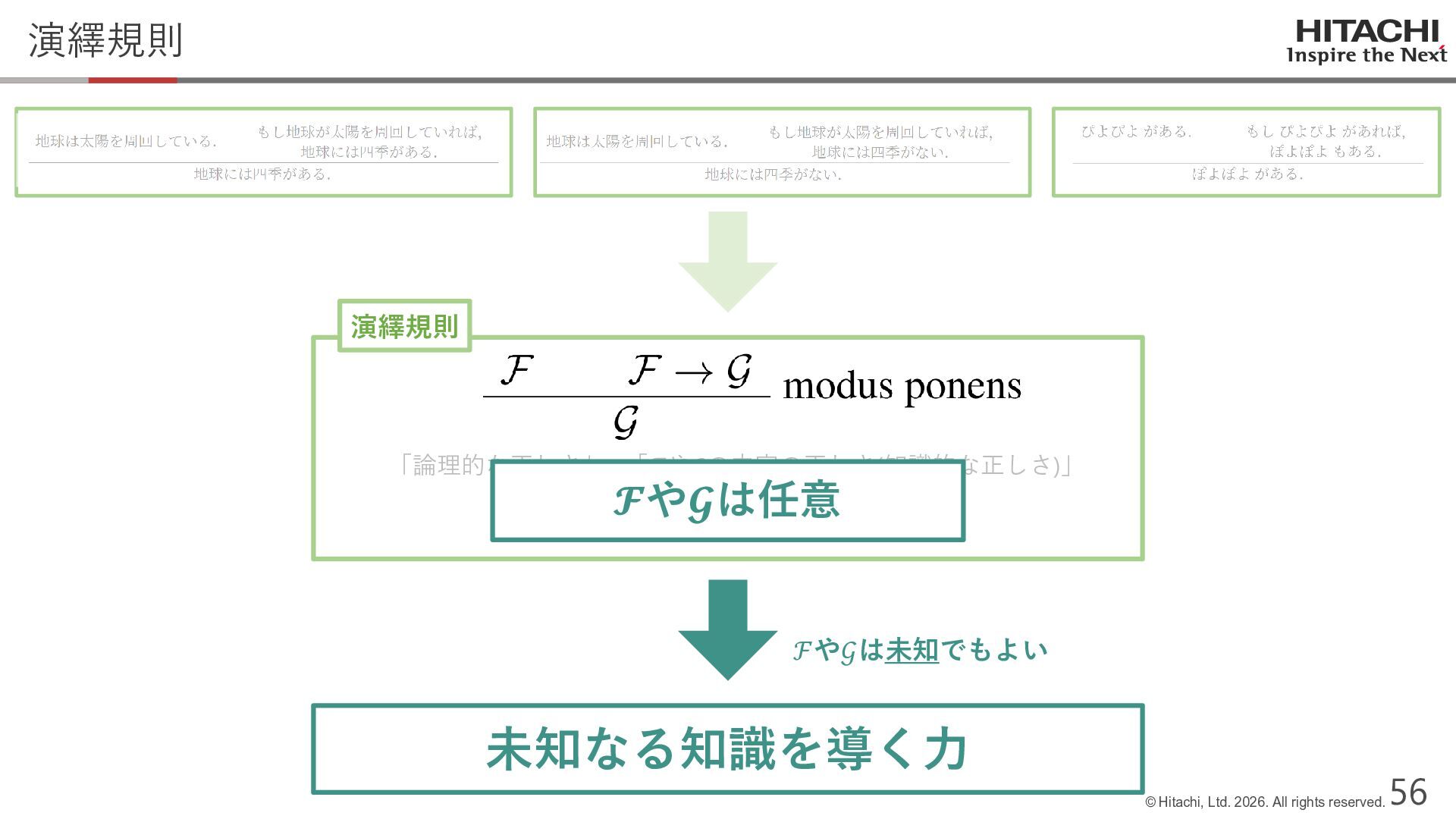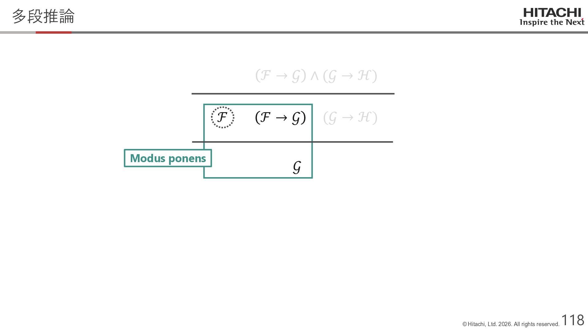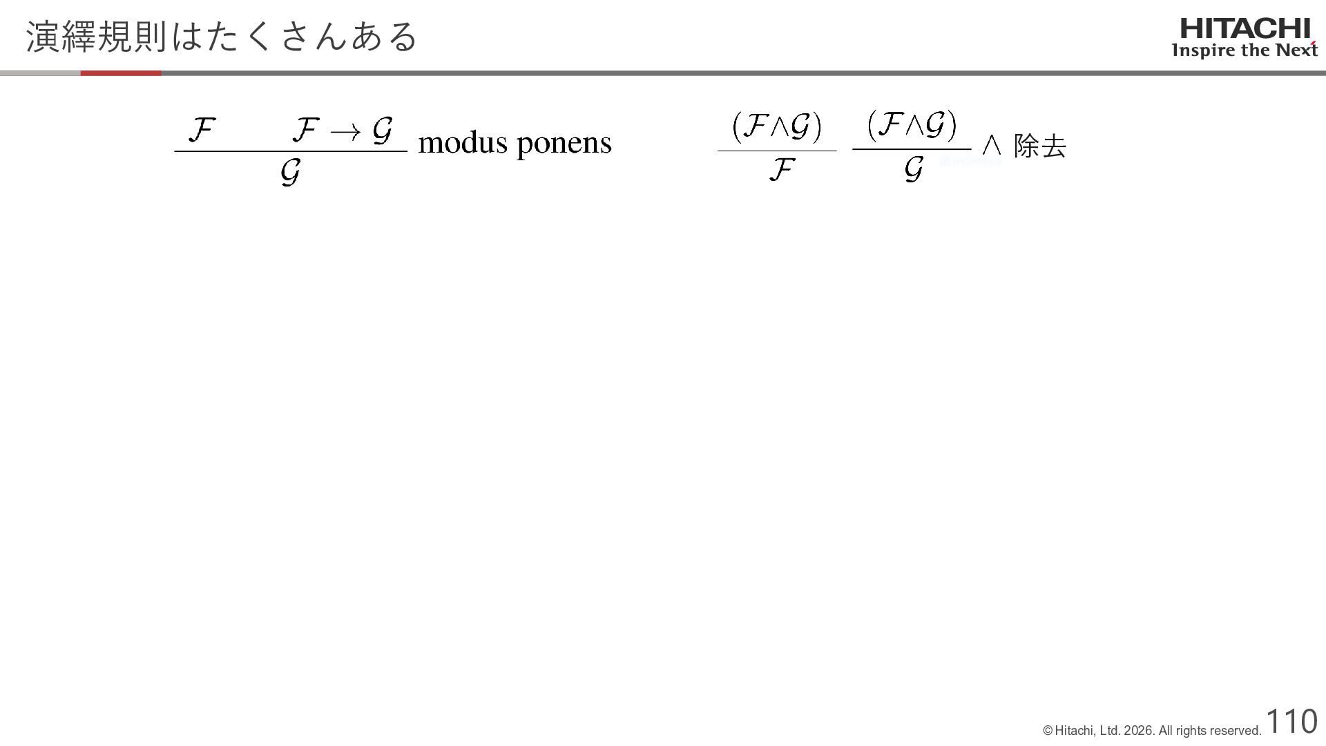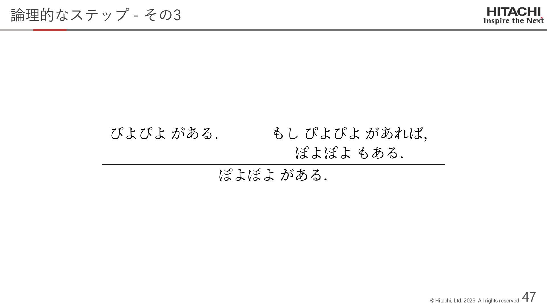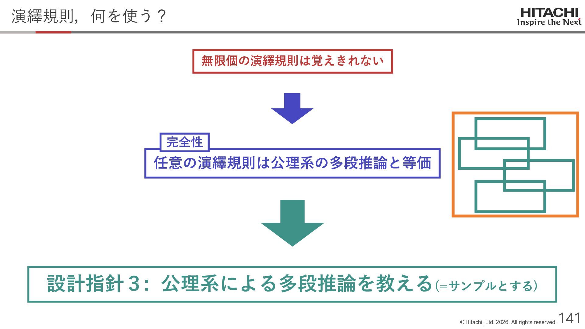 are afraid of wolves. 2. Jessica is a cat. 3. Wolves are afraid of cats. 4. Cats are afraid of sheep. 5. Winona is a wolf. 6. Sheep are afraid of cats. Jessica is afraid of sheep. 1. Rhett is not modest. 2. Vivian is confused. 3. Rhett is lazy. 4. If someone is modest or not confused, then he is not eager. Rhett is confused. (導けない) 1. All eels are fish. 2. No fish are plants. 3. Everything displayed in the collection is either a plant or an animal. 4. All animals displayed in the collection are multicellular. 5. A sea eel is displayed in the collection. 6. The sea eel is an eel or an animal or not a plant. 事実 1. Common utilities include water, electricity, gas, heating, sewer, trash, and recycling. 2. Many apartment rents cover the cost of water and electricity. 3. Susan lives in an apartment where the rent covers all utilities. 4. The rent of the apartment where Ava lives does not cover any utility expenses. 5. Noah lives in an apartment where the rent does not cover heating. 事実 事実 事実 結論 結論 Noah and Ava both need to pay the heating bill. The sea eel is multicellular or is bacteria. 結論 結論 FLD×2により解けるようになった問題 設計指針で意図した能力を獲得 設計指針1: 未知での推論 設計指針3: 公理系の多段推論 設計指針2: 前提不足 設計指針4: 多様な言語表現
