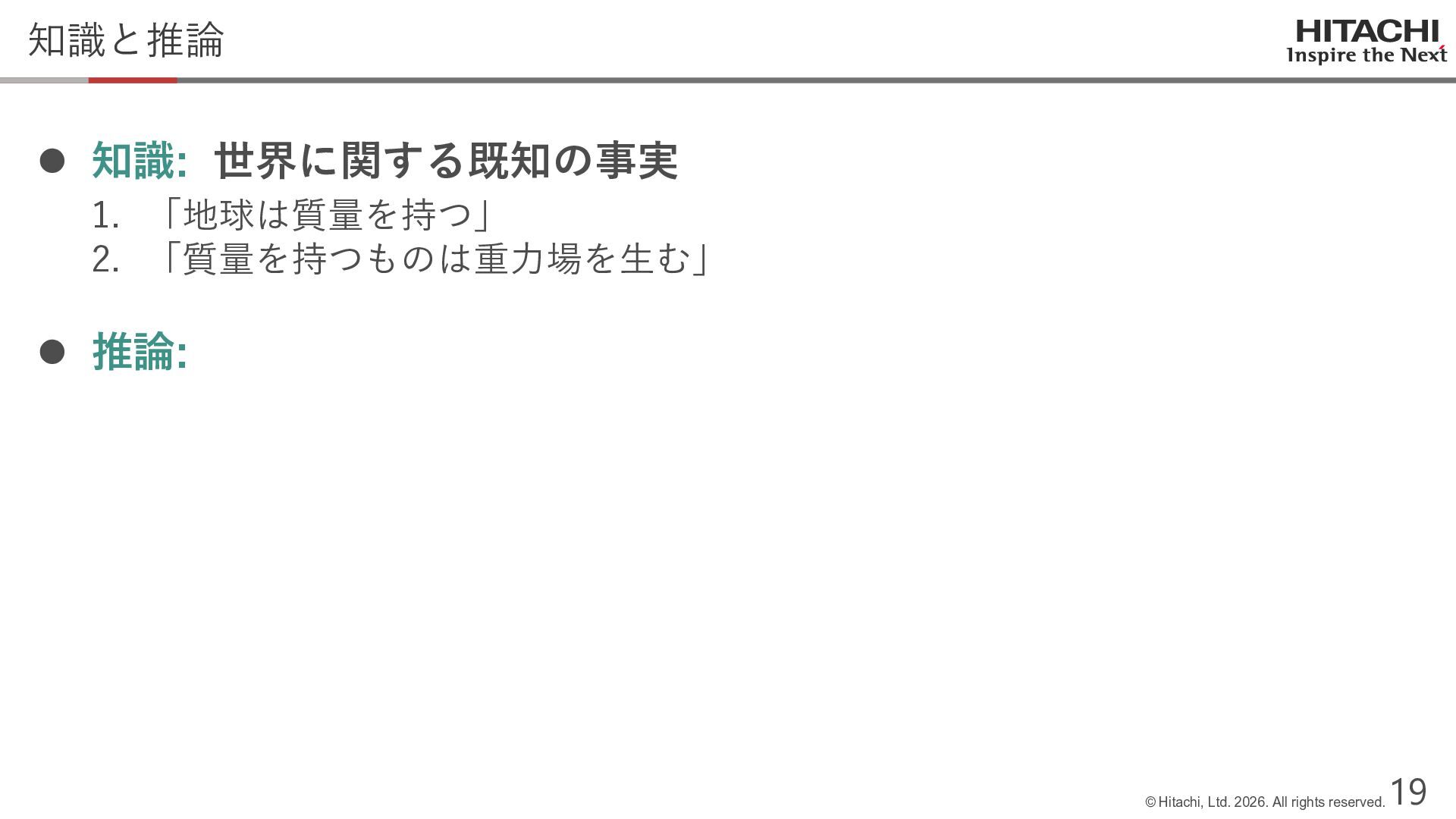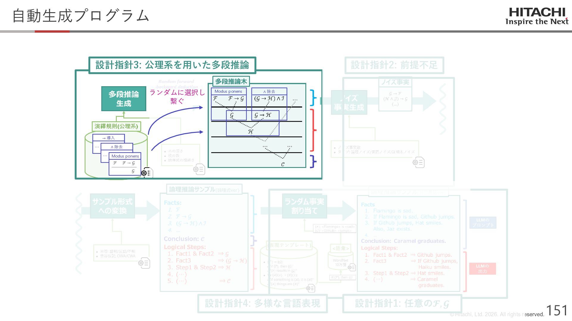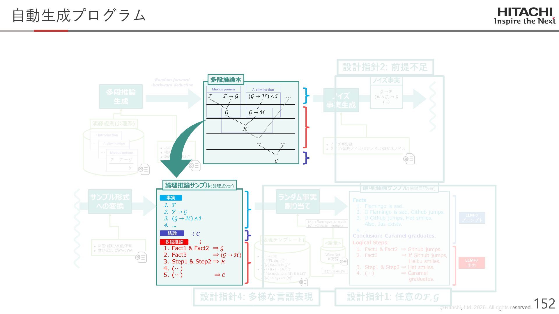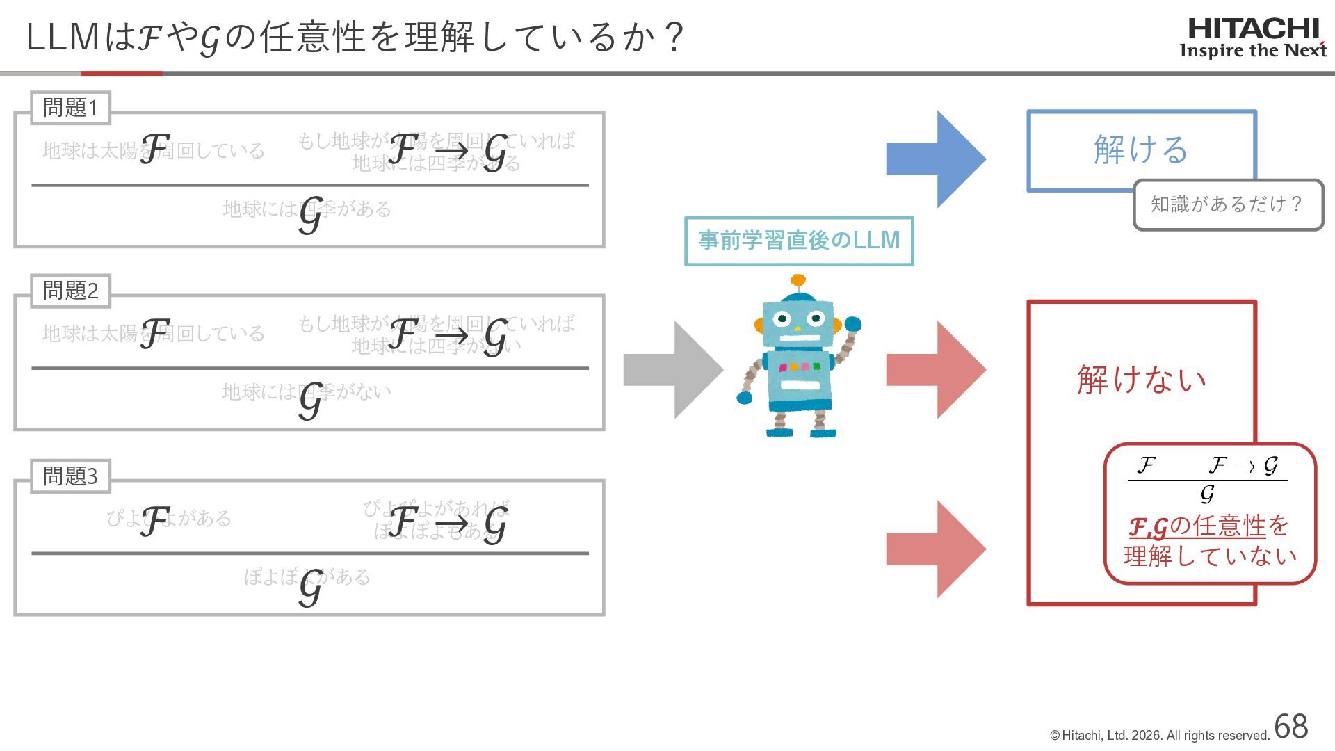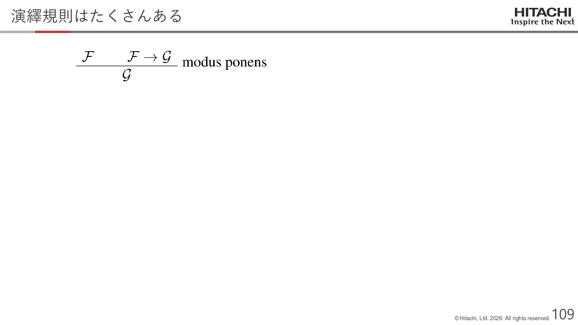 are afraid of wolves. 2. Jessica is a cat. 3. Wolves are afraid of cats. 4. Cats are afraid of sheep. 5. Winona is a wolf. 6. Sheep are afraid of cats. Jessica is afraid of sheep. 1. Rhett is not modest. 2. Vivian is confused. 3. Rhett is lazy. 4. If someone is modest or not confused, then he is not eager. Rhett is confused. (導けない) 1. All eels are fish. 2. No fish are plants. 3. Everything displayed in the collection is either a plant or an animal. 4. All animals displayed in the collection are multicellular. 5. A sea eel is displayed in the collection. 6. The sea eel is an eel or an animal or not a plant. 事実 1. Common utilities include water, electricity, gas, heating, sewer, trash, and recycling. 2. Many apartment rents cover the cost of water and electricity. 3. Susan lives in an apartment where the rent covers all utilities. 4. The rent of the apartment where Ava lives does not cover any utility expenses. 5. Noah lives in an apartment where the rent does not cover heating. 事実 事実 事実 結論 結論 Noah and Ava both need to pay the heating bill. The sea eel is multicellular or is bacteria. 結論 結論 FLD×2により解けるようになった問題 設計指針で意図した能力を獲得 設計指針1: 未知での推論 設計指針3: 公理系の多段推論 設計指針2: 前提不足 設計指針4: 多様な言語表現