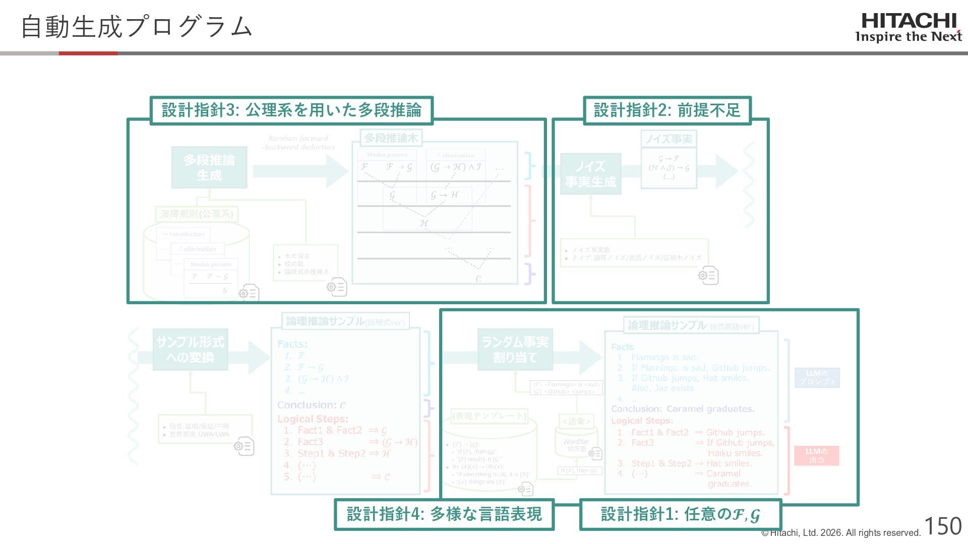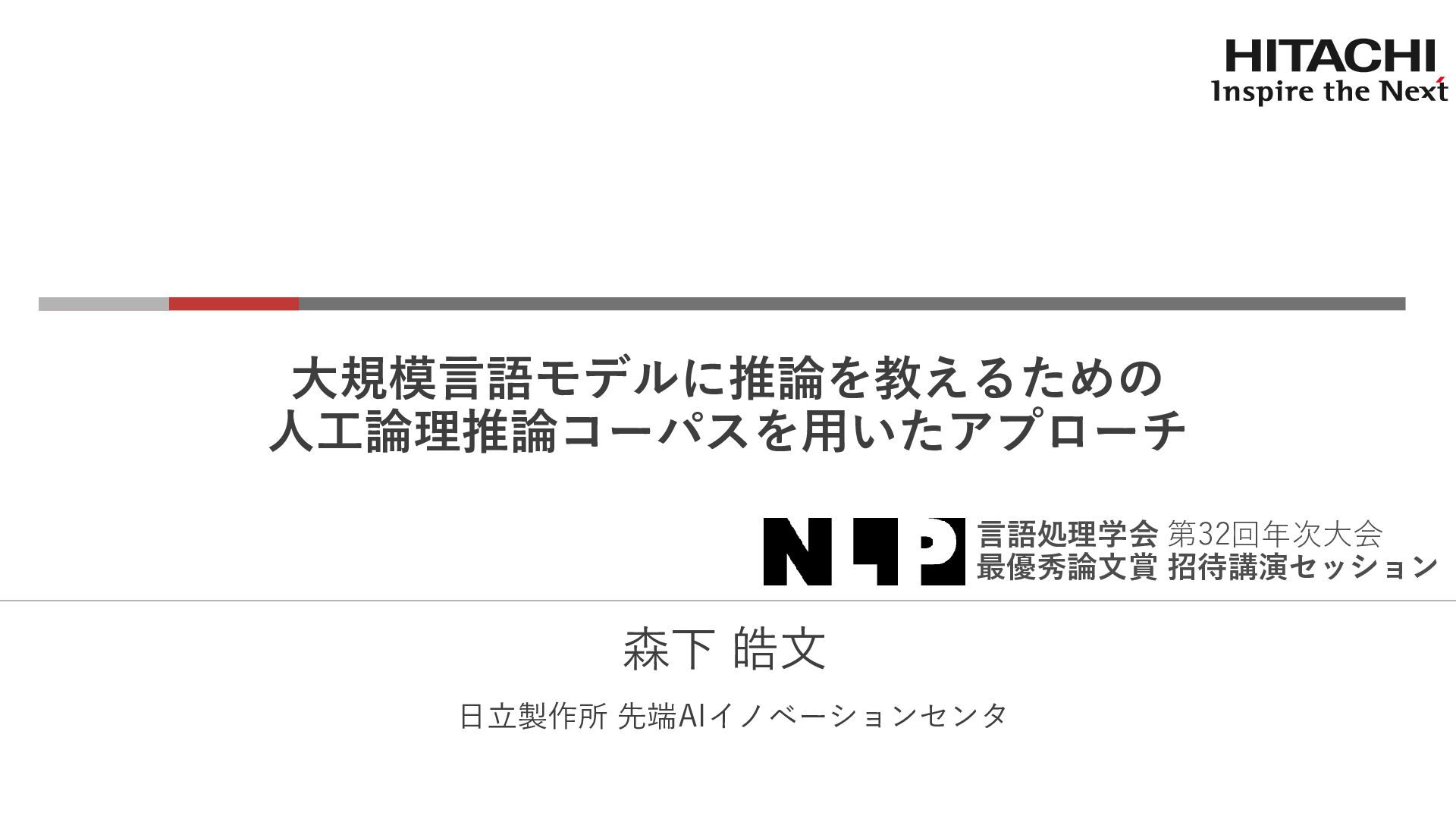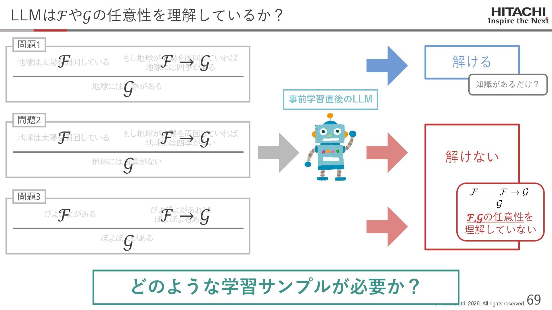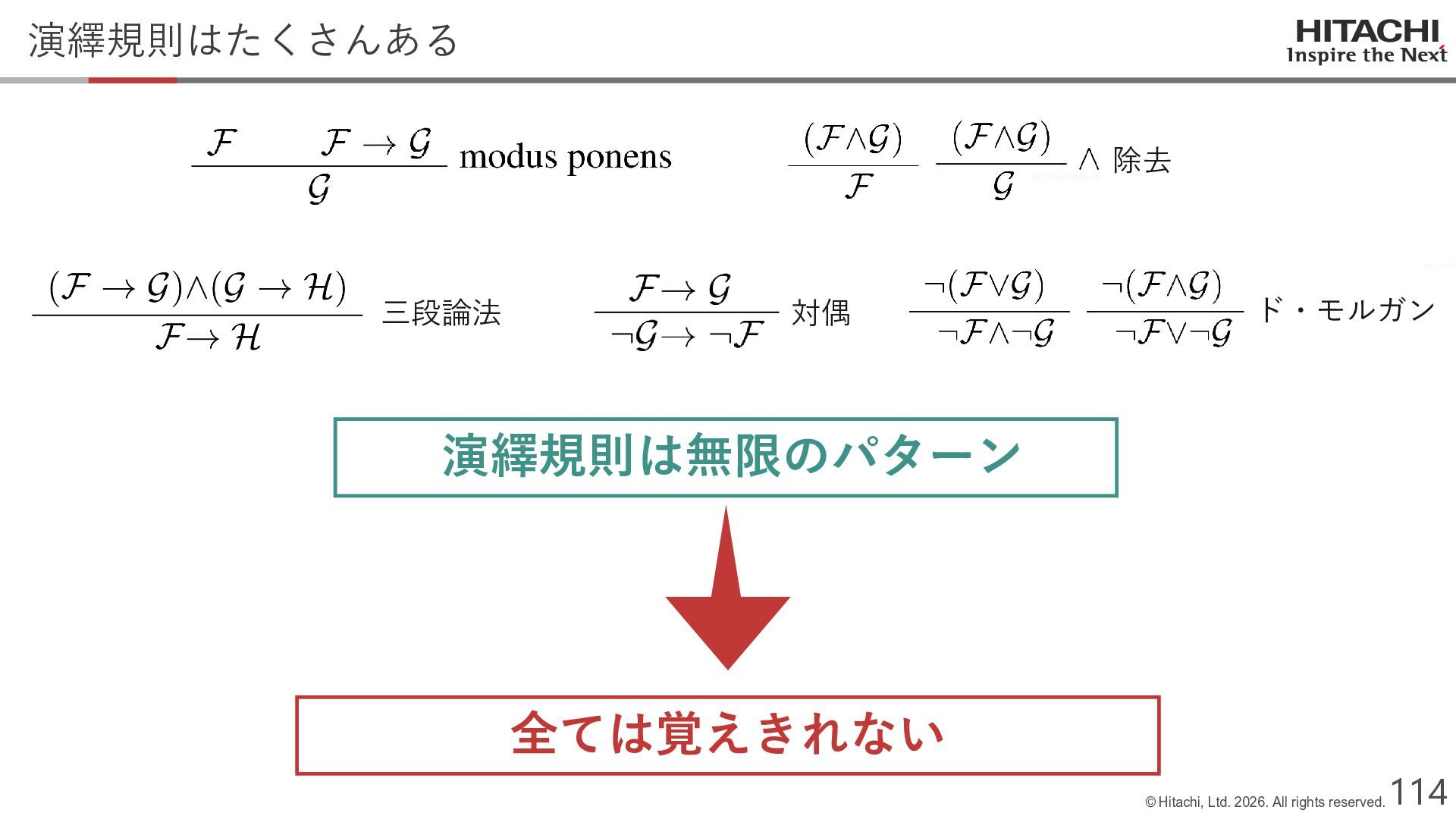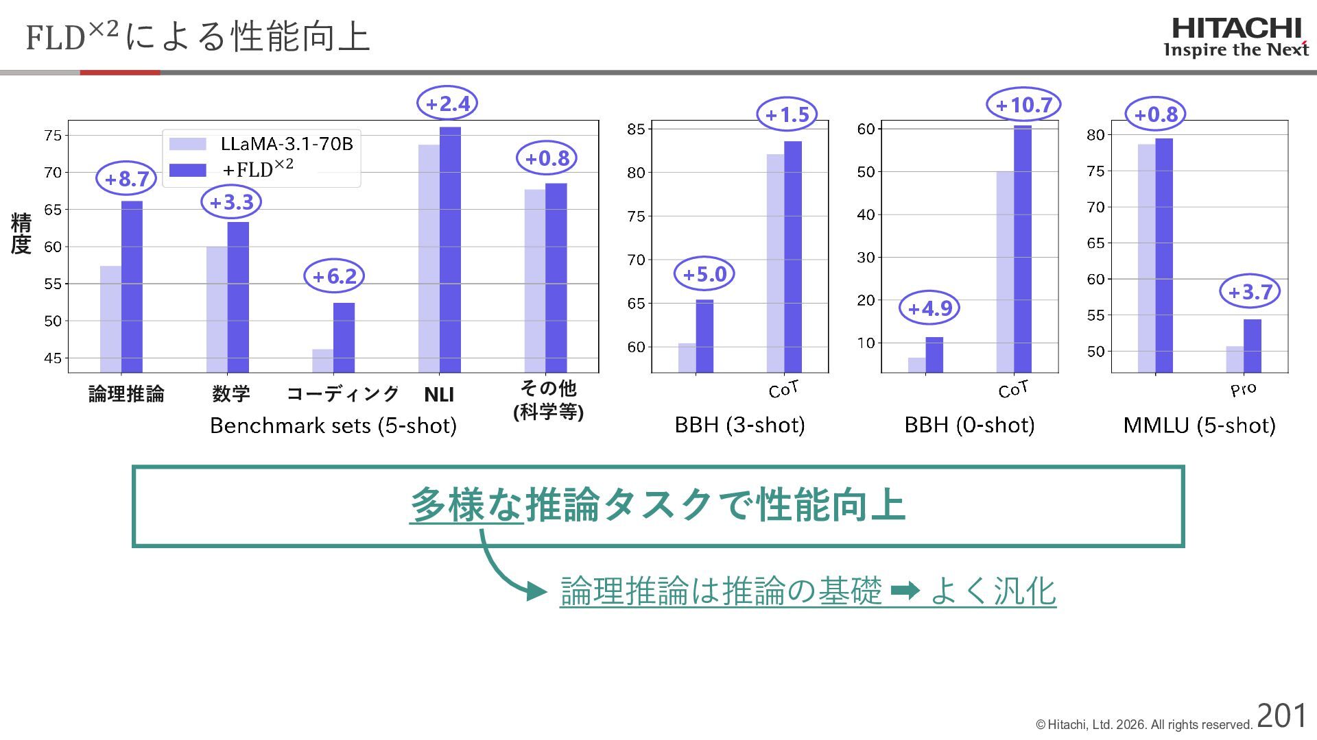 are afraid of wolves. 2. Jessica is a cat. 3. Wolves are afraid of cats. 4. Cats are afraid of sheep. 5. Winona is a wolf. 6. Sheep are afraid of cats. Jessica is afraid of sheep. 1. Rhett is not modest. 2. Vivian is confused. 3. Rhett is lazy. 4. If someone is modest or not confused, then he is not eager. Rhett is confused. (導けない) 1. All eels are fish. 2. No fish are plants. 3. Everything displayed in the collection is either a plant or an animal. 4. All animals displayed in the collection are multicellular. 5. A sea eel is displayed in the collection. 6. The sea eel is an eel or an animal or not a plant. 事実 1. Common utilities include water, electricity, gas, heating, sewer, trash, and recycling. 2. Many apartment rents cover the cost of water and electricity. 3. Susan lives in an apartment where the rent covers all utilities. 4. The rent of the apartment where Ava lives does not cover any utility expenses. 5. Noah lives in an apartment where the rent does not cover heating. 事実 事実 事実 結論 結論 Noah and Ava both need to pay the heating bill. The sea eel is multicellular or is bacteria. 結論 結論 FLD×2により解けるようになった問題 設計指針で意図した能力を獲得 設計指針1: 未知での推論 設計指針3: 公理系の多段推論 設計指針2: 前提不足 設計指針4: 多様な言語表現