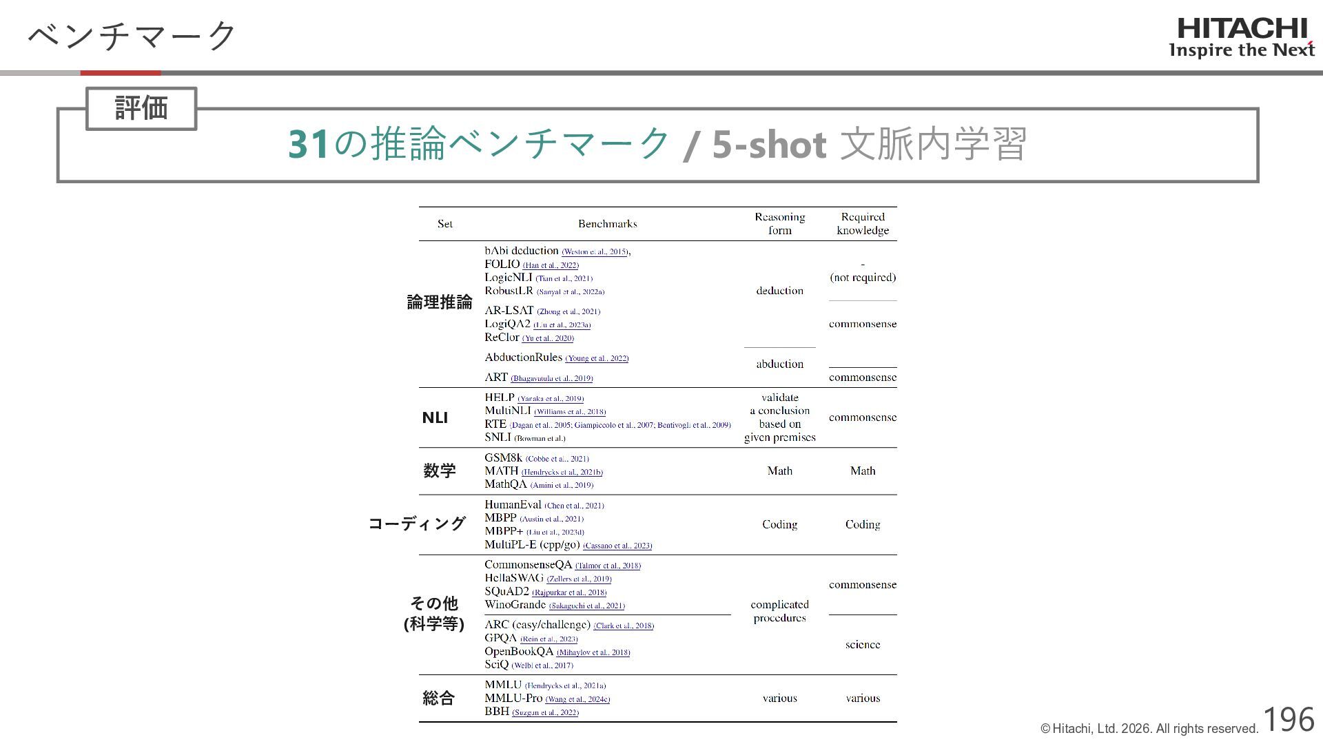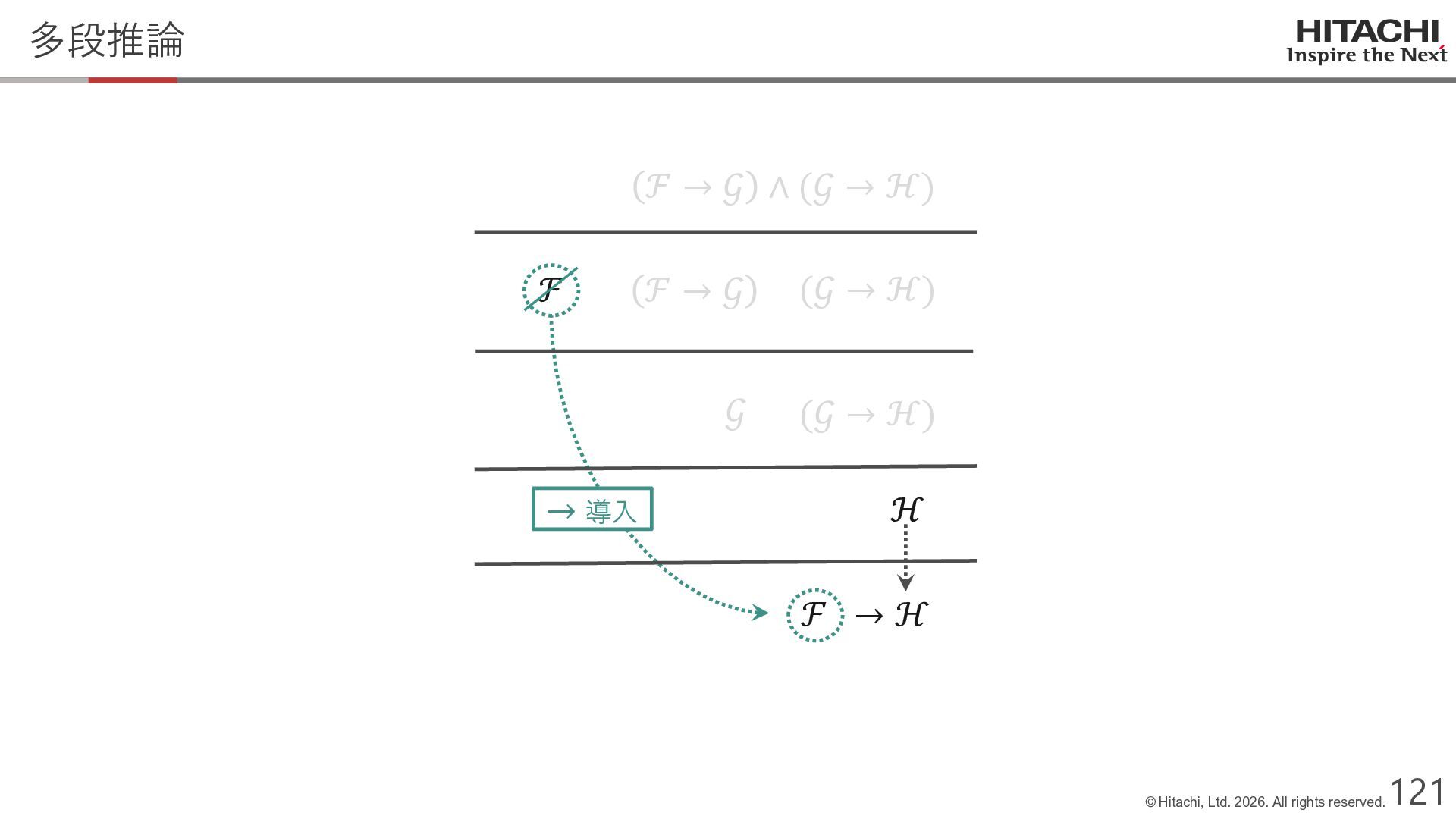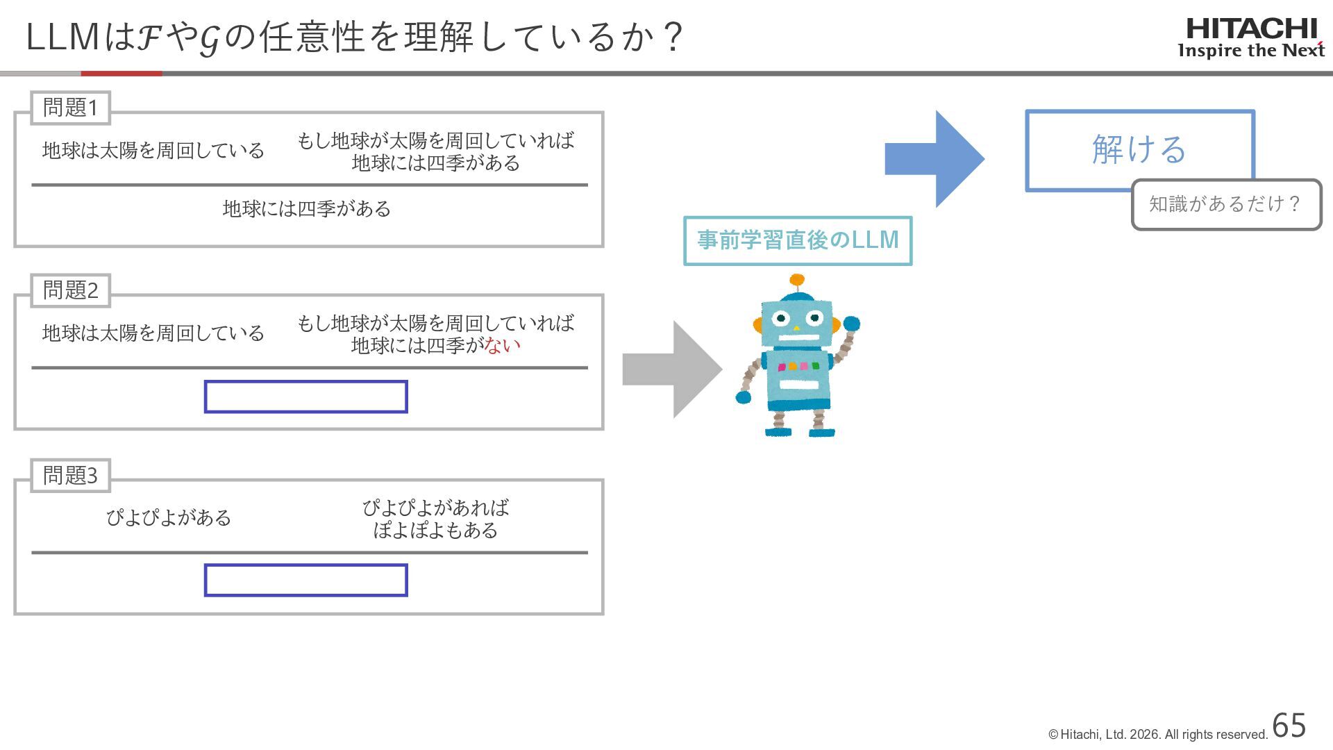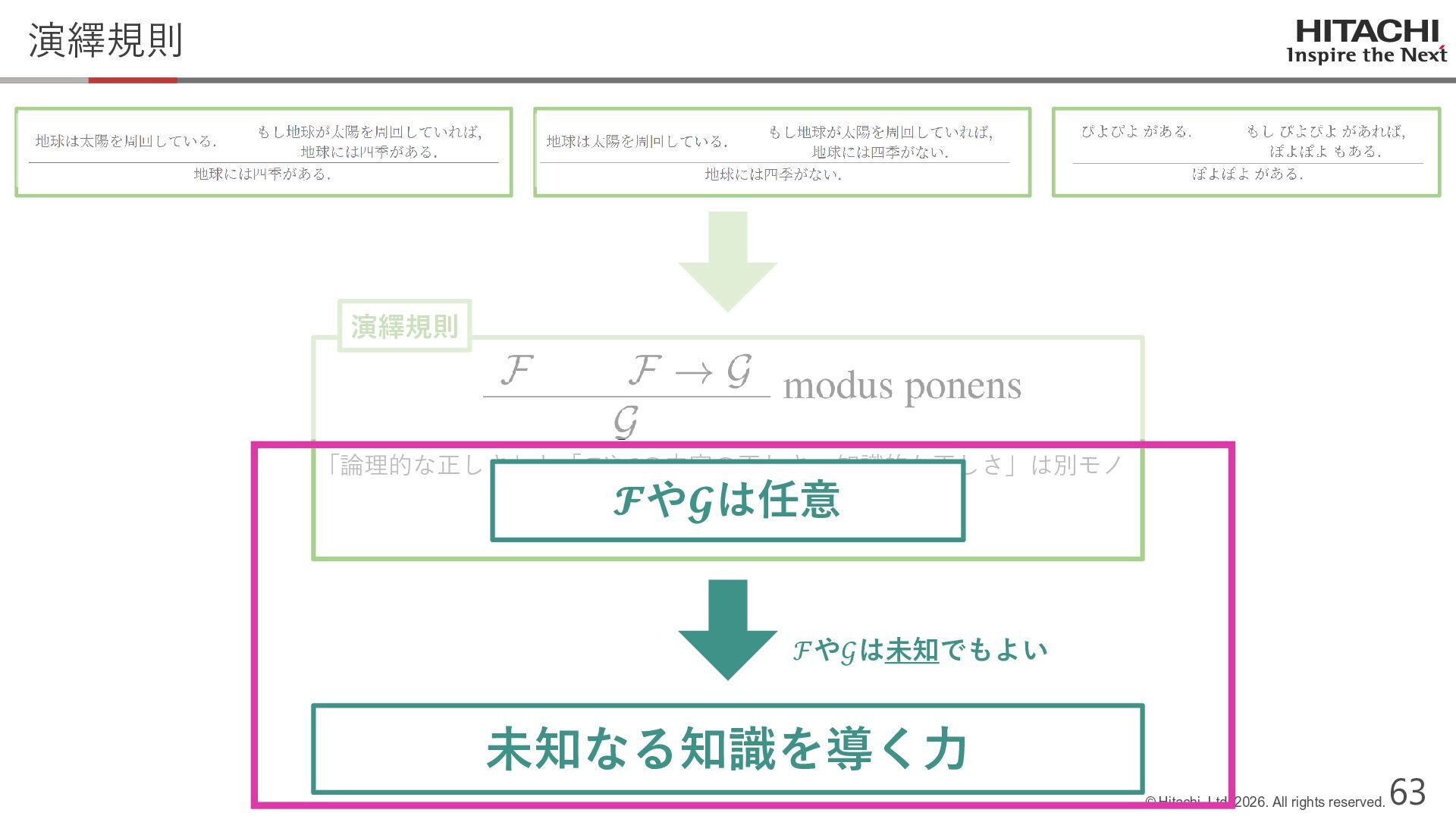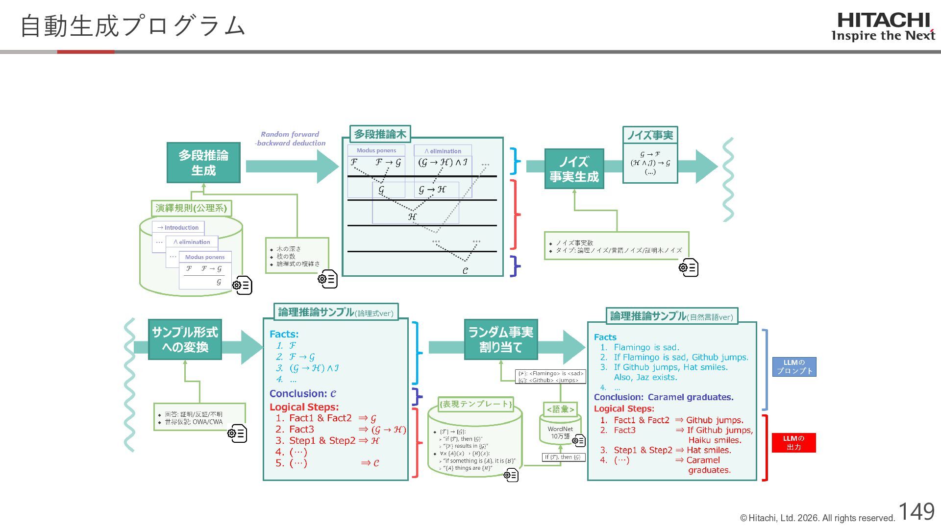 are afraid of wolves. 2. Jessica is a cat. 3. Wolves are afraid of cats. 4. Cats are afraid of sheep. 5. Winona is a wolf. 6. Sheep are afraid of cats. Jessica is afraid of sheep. 1. Rhett is not modest. 2. Vivian is confused. 3. Rhett is lazy. 4. If someone is modest or not confused, then he is not eager. Rhett is confused. (導けない) 1. All eels are fish. 2. No fish are plants. 3. Everything displayed in the collection is either a plant or an animal. 4. All animals displayed in the collection are multicellular. 5. A sea eel is displayed in the collection. 6. The sea eel is an eel or an animal or not a plant. 事実 1. Common utilities include water, electricity, gas, heating, sewer, trash, and recycling. 2. Many apartment rents cover the cost of water and electricity. 3. Susan lives in an apartment where the rent covers all utilities. 4. The rent of the apartment where Ava lives does not cover any utility expenses. 5. Noah lives in an apartment where the rent does not cover heating. 事実 事実 事実 結論 結論 Noah and Ava both need to pay the heating bill. The sea eel is multicellular or is bacteria. 結論 結論 FLD×2により解けるようになった問題 設計指針で意図した能力を獲得 設計指針1: 未知での推論 設計指針3: 公理系の多段推論 設計指針2: 前提不足 設計指針4: 多様な言語表現