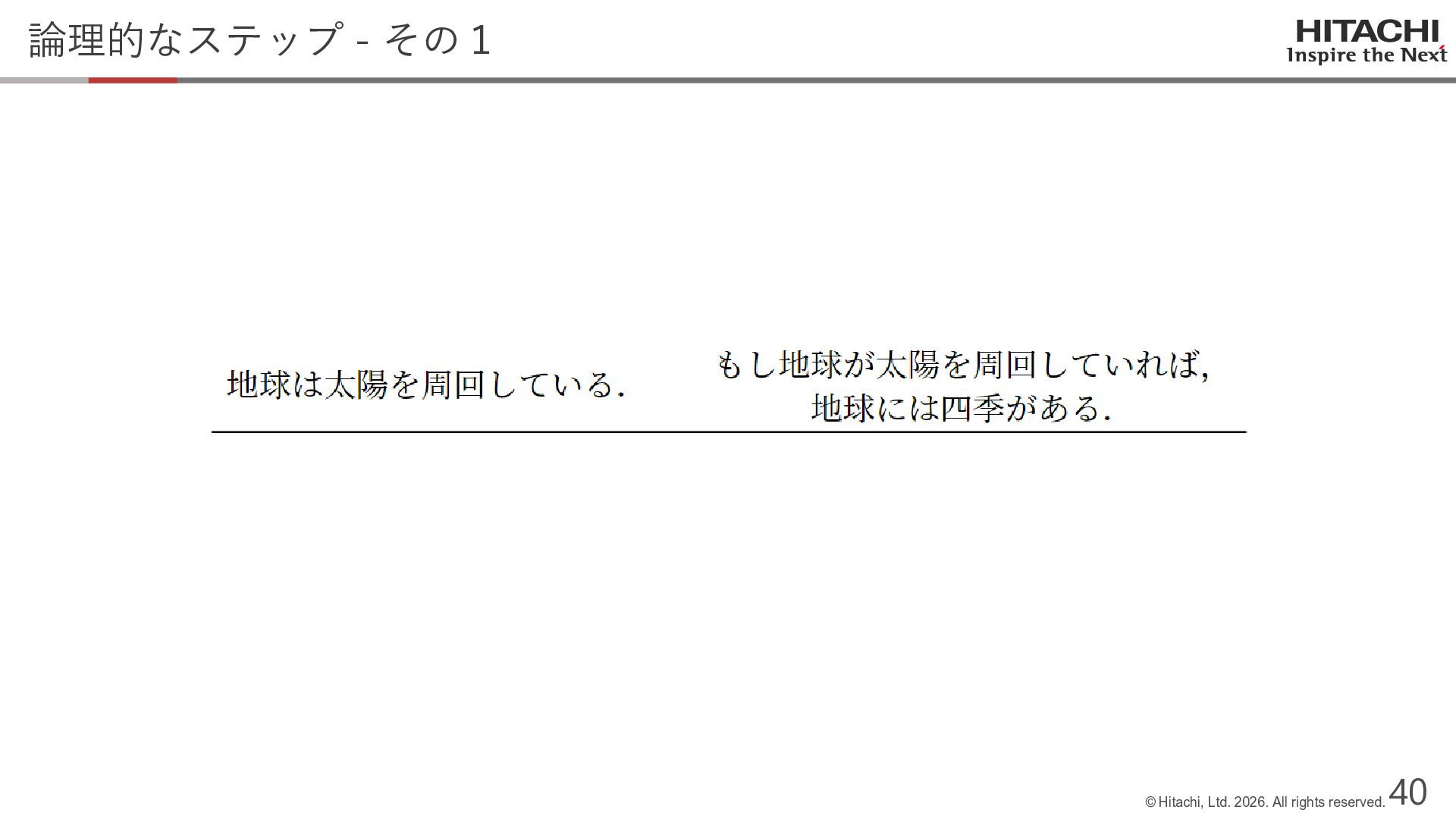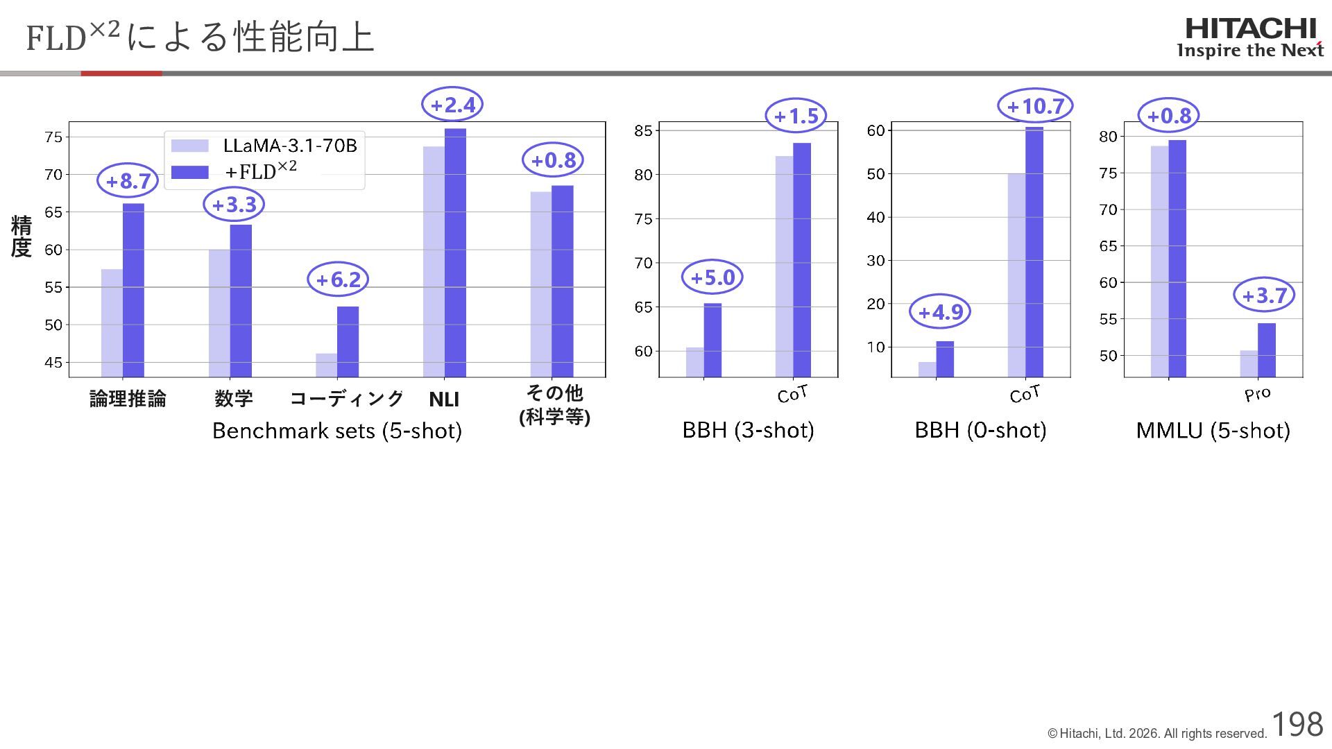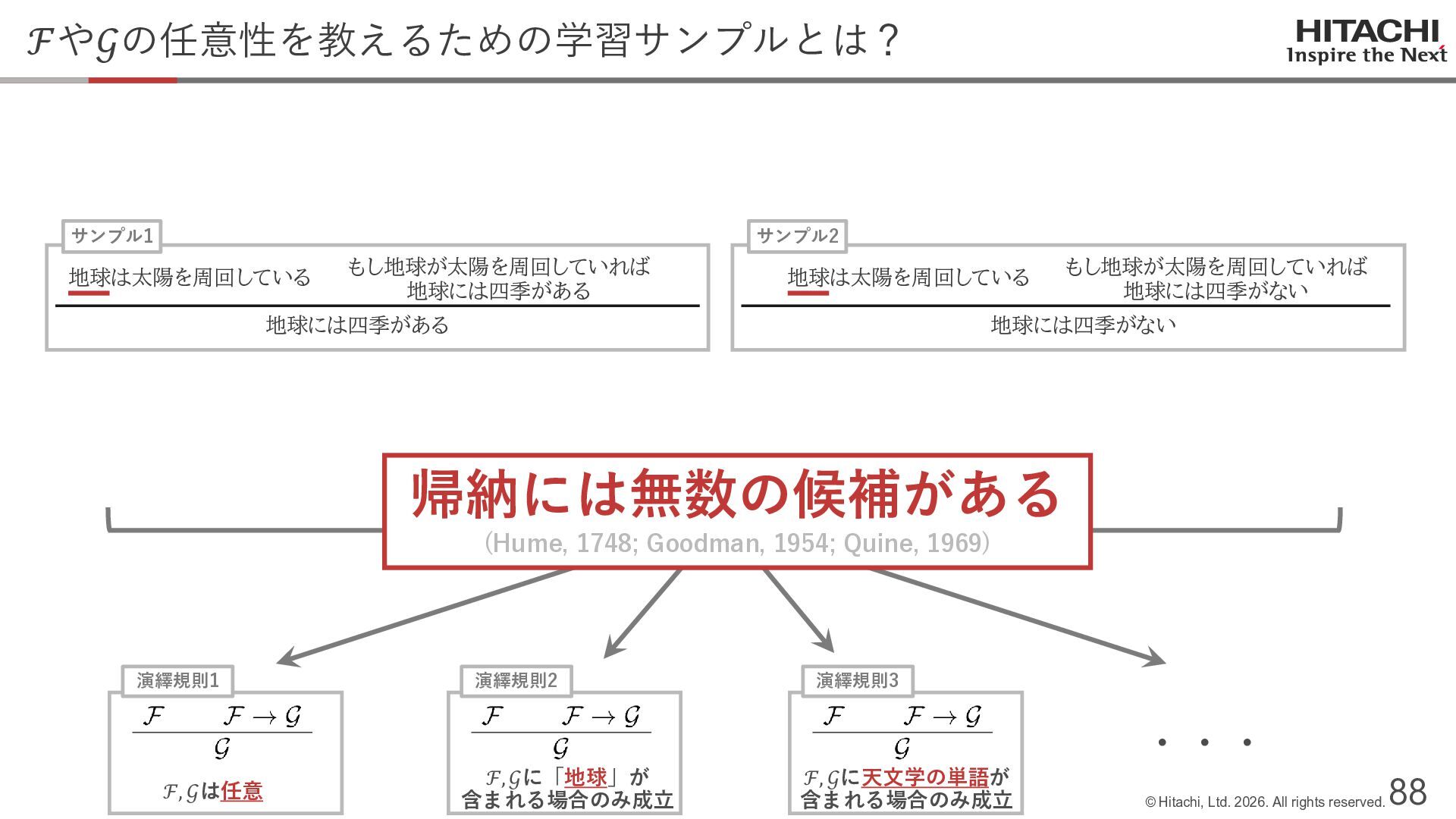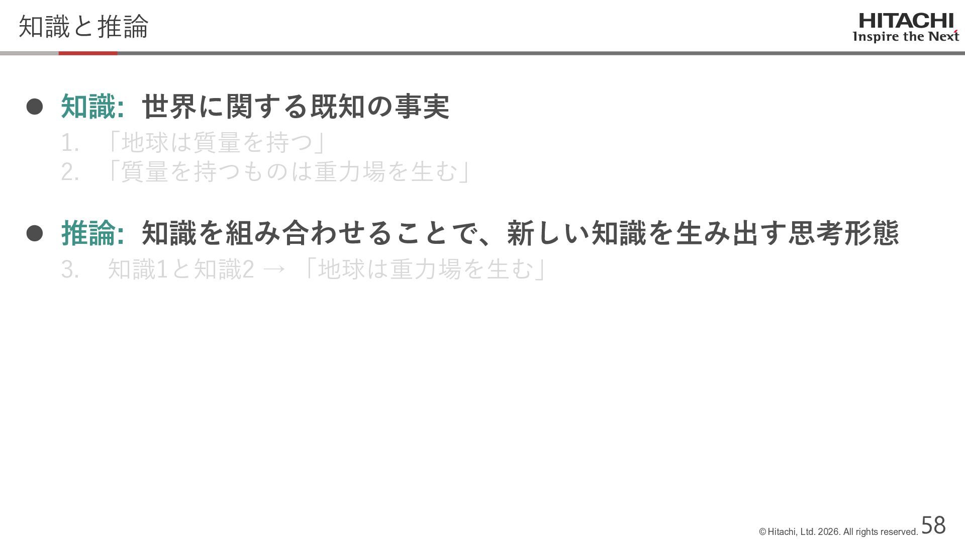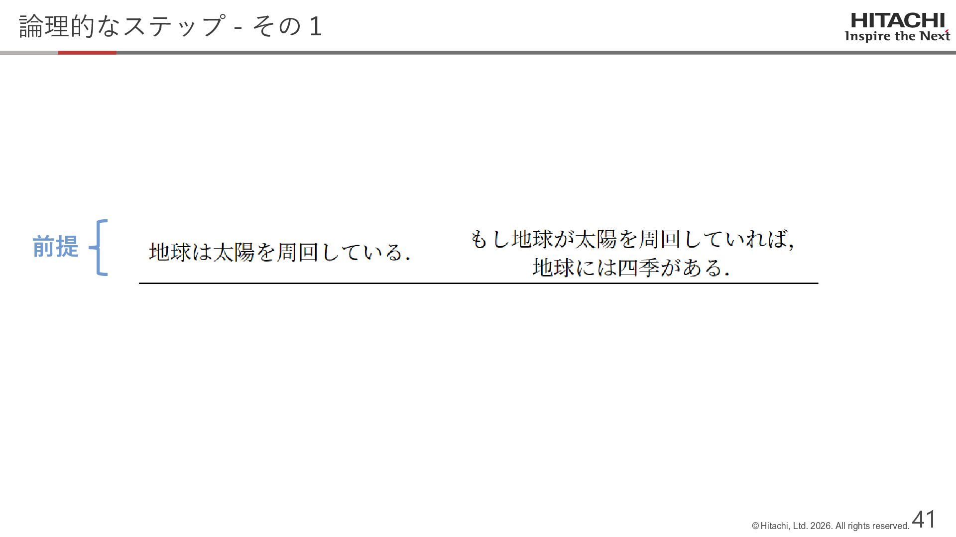 are afraid of wolves. 2. Jessica is a cat. 3. Wolves are afraid of cats. 4. Cats are afraid of sheep. 5. Winona is a wolf. 6. Sheep are afraid of cats. Jessica is afraid of sheep. 1. Rhett is not modest. 2. Vivian is confused. 3. Rhett is lazy. 4. If someone is modest or not confused, then he is not eager. Rhett is confused. (導けない) 1. All eels are fish. 2. No fish are plants. 3. Everything displayed in the collection is either a plant or an animal. 4. All animals displayed in the collection are multicellular. 5. A sea eel is displayed in the collection. 6. The sea eel is an eel or an animal or not a plant. 事実 1. Common utilities include water, electricity, gas, heating, sewer, trash, and recycling. 2. Many apartment rents cover the cost of water and electricity. 3. Susan lives in an apartment where the rent covers all utilities. 4. The rent of the apartment where Ava lives does not cover any utility expenses. 5. Noah lives in an apartment where the rent does not cover heating. 事実 事実 事実 結論 結論 Noah and Ava both need to pay the heating bill. The sea eel is multicellular or is bacteria. 結論 結論 FLD×2により解けるようになった問題 設計指針で意図した能力を獲得 設計指針1: 未知での推論 設計指針3: 公理系の多段推論 設計指針2: 前提不足 設計指針4: 多様な言語表現