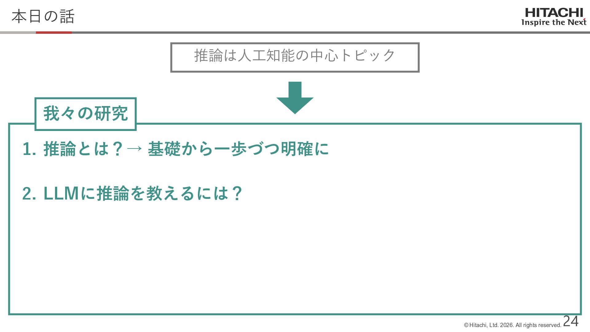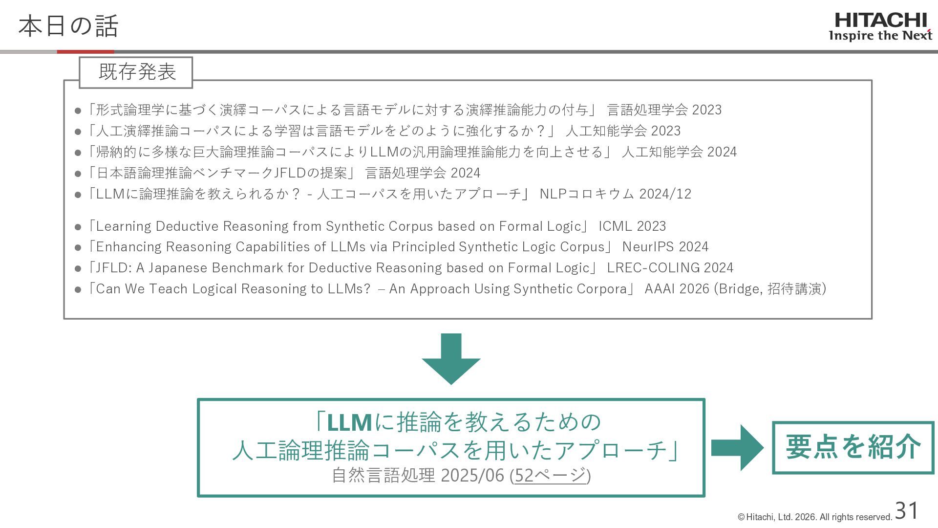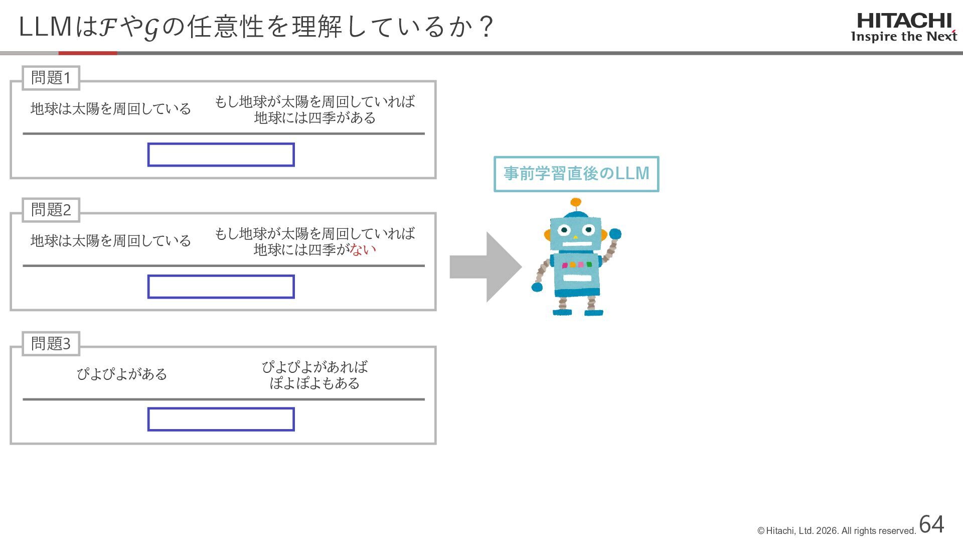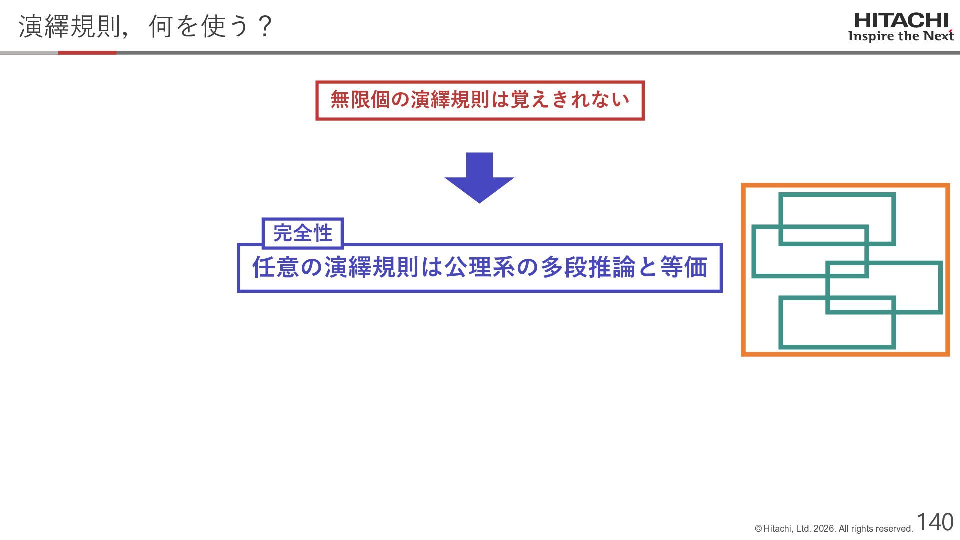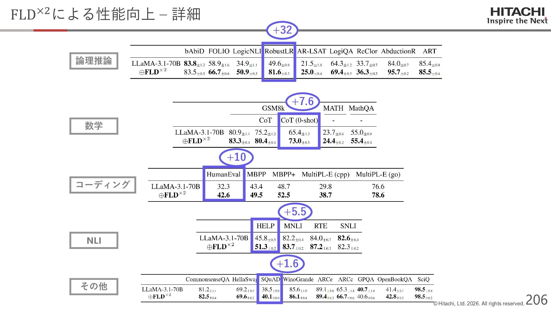 are afraid of wolves. 2. Jessica is a cat. 3. Wolves are afraid of cats. 4. Cats are afraid of sheep. 5. Winona is a wolf. 6. Sheep are afraid of cats. Jessica is afraid of sheep. 1. Rhett is not modest. 2. Vivian is confused. 3. Rhett is lazy. 4. If someone is modest or not confused, then he is not eager. Rhett is confused. (導けない) 1. All eels are fish. 2. No fish are plants. 3. Everything displayed in the collection is either a plant or an animal. 4. All animals displayed in the collection are multicellular. 5. A sea eel is displayed in the collection. 6. The sea eel is an eel or an animal or not a plant. 事実 1. Common utilities include water, electricity, gas, heating, sewer, trash, and recycling. 2. Many apartment rents cover the cost of water and electricity. 3. Susan lives in an apartment where the rent covers all utilities. 4. The rent of the apartment where Ava lives does not cover any utility expenses. 5. Noah lives in an apartment where the rent does not cover heating. 事実 事実 事実 結論 結論 Noah and Ava both need to pay the heating bill. The sea eel is multicellular or is bacteria. 結論 結論 FLD×2により解けるようになった問題 設計指針で意図した能力を獲得 設計指針1: 未知での推論 設計指針3: 公理系の多段推論 設計指針2: 前提不足 設計指針4: 多様な言語表現