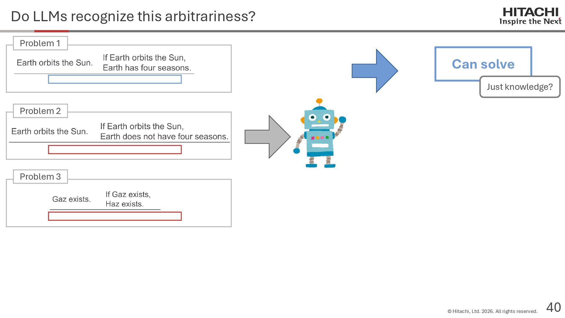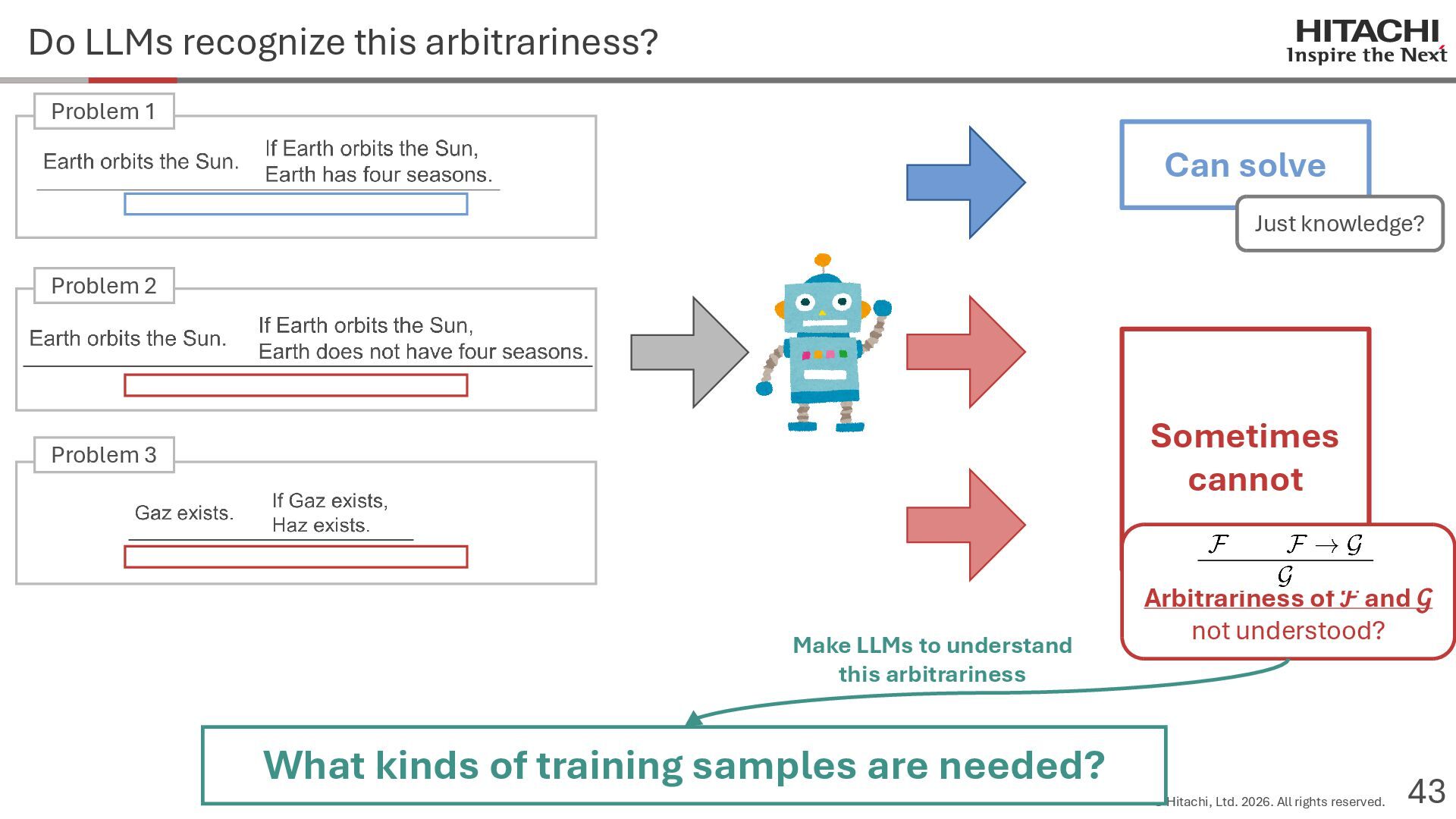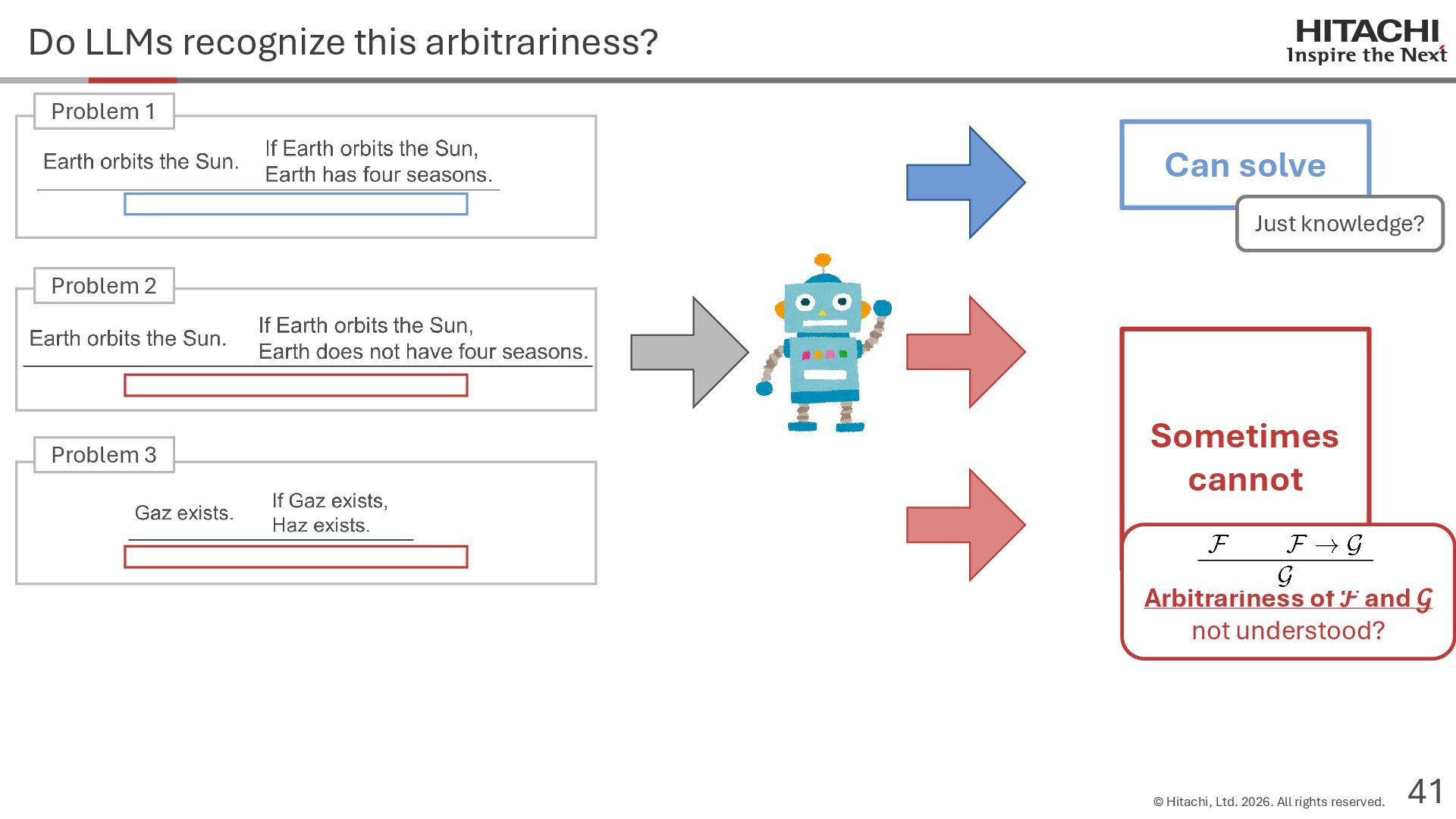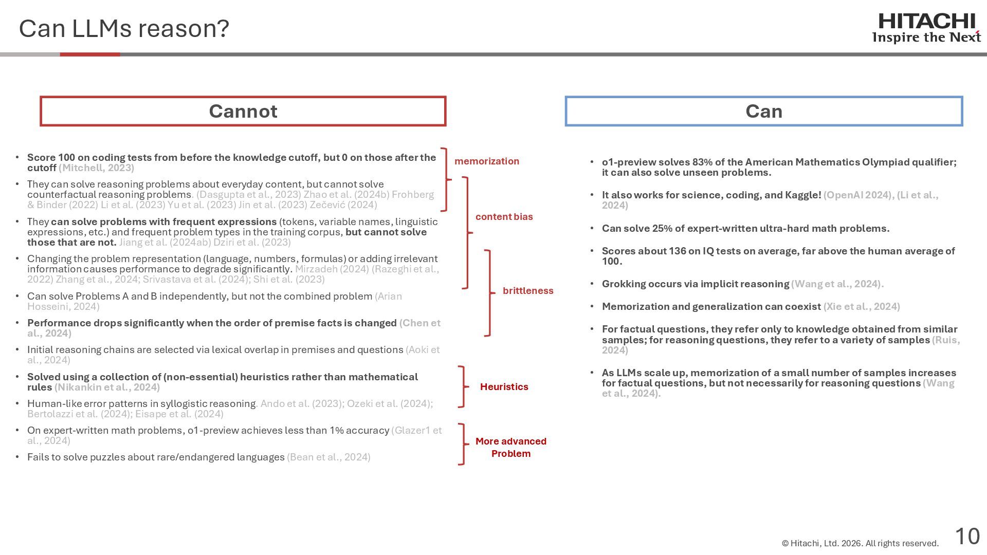 reason? Can Cannot • Score 100 on coding tests from before the knowledge cutoff, but 0 on those after the cutoff (Mitchell, 2023) • They can solve reasoning problems about everyday content, but cannot solve counterfactual reasoning problems. (Dasgupta et al., 2023) Zhao et al. (2024b) Frohberg & Binder (2022) Li et al. (2023) Yu et al. (2023) Jin et al. (2023) Zečević (2024) • They can solve problems with frequent expressions (tokens, variable names, linguistic expressions, etc.) and frequent problem types in the training corpus, but cannot solve those that are not. Jiang et al. (2024ab) Dziri et al. (2023) • Changing the problem representation (language, numbers, formulas) or adding irrelevant information causes performance to degrade significantly. Mirzadeh (2024) (Razeghi et al., 2022) Zhang et al., 2024; Srivastava et al. (2024); Shi et al. (2023) • Can solve Problems A and B independently, but not the combined problem (Arian Hosseini, 2024) • Performance drops significantly when the order of premise facts is changed (Chen et al., 2024) • Initial reasoning chains are selected via lexical overlap in premises and questions (Aoki et al., 2024) • Solved using a collection of (non-essential) heuristics rather than mathematical rules (Nikankin et al., 2024) • Human-like error patterns in syllogistic reasoning. Ando et al. (2023); Ozeki et al. (2024); Bertolazzi et al. (2024); Eisape et al. (2024) • On expert-written math problems, o1-preview achieves less than 1% accuracy (Glazer1 et al., 2024) • Fails to solve puzzles about rare/endangered languages (Bean et al., 2024) memorization content bias brittleness Heuristics • o1-preview solves 83% of the American Mathematics Olympiad qualifier; it can also solve unseen problems. • It also works for science, coding, and Kaggle! (OpenAI 2024), (Li et al., 2024) • Can solve 25% of expert-written ultra-hard math problems. • Scores about 136 on IQ tests on average, far above the human average of 100. • Grokking occurs via implicit reasoning (Wang et al., 2024). • Memorization and generalization can coexist (Xie et al., 2024) • For factual questions, they refer only to knowledge obtained from similar samples; for reasoning questions, they refer to a variety of samples (Ruis, 2024) • As LLMs scale up, memorization of a small number of samples increases for factual questions, but not necessarily for reasoning questions (Wang et al., 2024). More advanced Problem