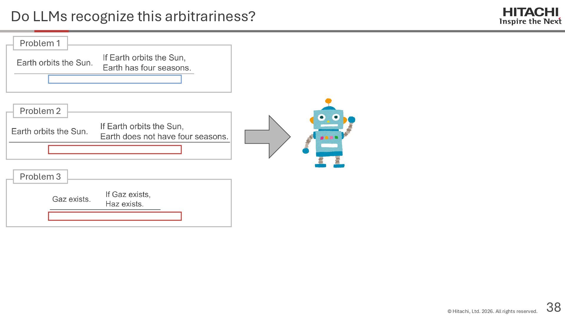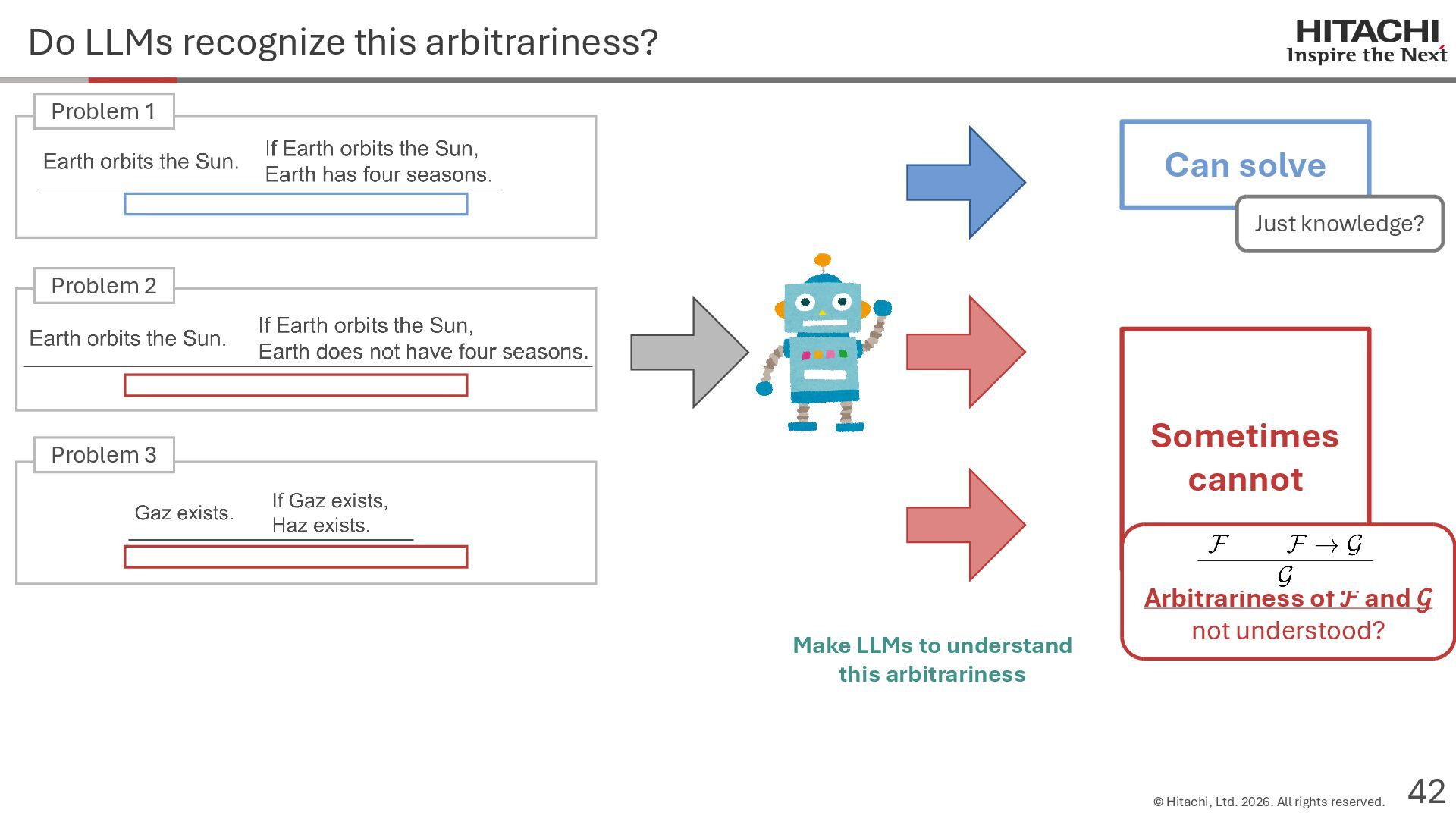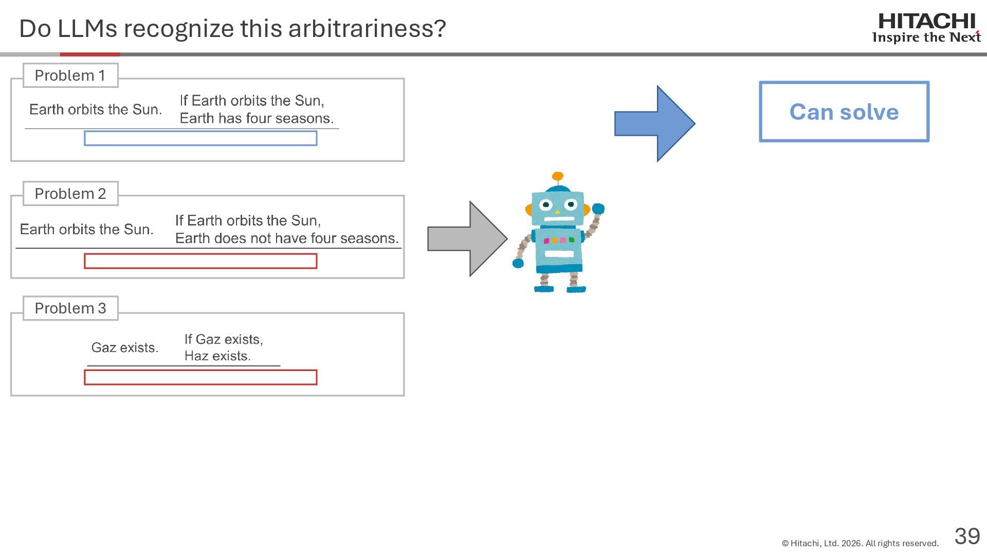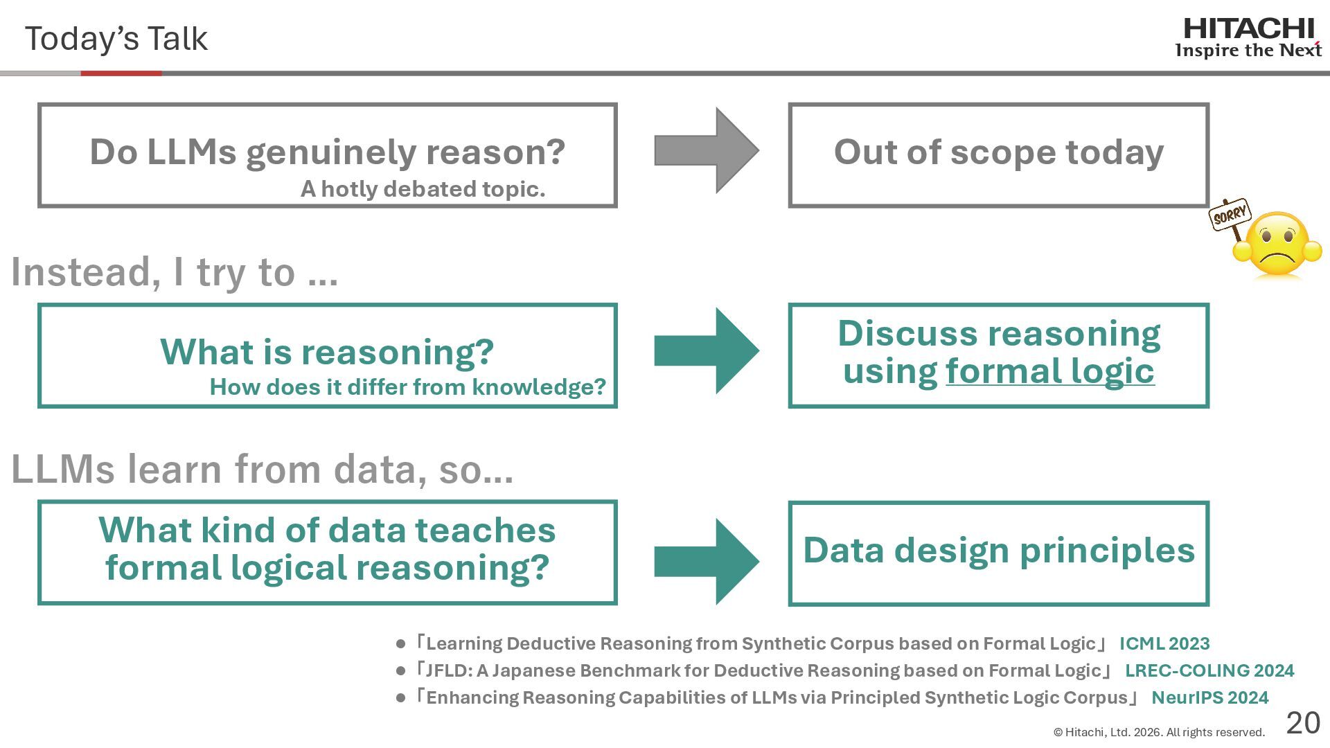 reason? Can Cannot • Score 100 on coding tests from before the knowledge cutoff, but 0 on those after the cutoff (Mitchell, 2023) • They can solve reasoning problems about everyday content, but cannot solve counterfactual reasoning problems. (Dasgupta et al., 2023) Zhao et al. (2024b) Frohberg & Binder (2022) Li et al. (2023) Yu et al. (2023) Jin et al. (2023) Zečević (2024) • They can solve problems with frequent expressions (tokens, variable names, linguistic expressions, etc.) and frequent problem types in the training corpus, but cannot solve those that are not. Jiang et al. (2024ab) Dziri et al. (2023) • Changing the problem representation (language, numbers, formulas) or adding irrelevant information causes performance to degrade significantly. Mirzadeh (2024) (Razeghi et al., 2022) Zhang et al., 2024; Srivastava et al. (2024); Shi et al. (2023) • Can solve Problems A and B independently, but not the combined problem (Arian Hosseini, 2024) • Performance drops significantly when the order of premise facts is changed (Chen et al., 2024) • Initial reasoning chains are selected via lexical overlap in premises and questions (Aoki et al., 2024) • Solved using a collection of (non-essential) heuristics rather than mathematical rules (Nikankin et al., 2024) • Human-like error patterns in syllogistic reasoning. Ando et al. (2023); Ozeki et al. (2024); Bertolazzi et al. (2024); Eisape et al. (2024) • On expert-written math problems, o1-preview achieves less than 1% accuracy (Glazer1 et al., 2024) • Fails to solve puzzles about rare/endangered languages (Bean et al., 2024) memorization content bias brittleness Heuristics • o1-preview solves 83% of the American Mathematics Olympiad qualifier; it can also solve unseen problems. • It also works for science, coding, and Kaggle! (OpenAI 2024), (Li et al., 2024) • Can solve 25% of expert-written ultra-hard math problems. • Scores about 136 on IQ tests on average, far above the human average of 100. • Grokking occurs via implicit reasoning (Wang et al., 2024). • Memorization and generalization can coexist (Xie et al., 2024) • For factual questions, they refer only to knowledge obtained from similar samples; for reasoning questions, they refer to a variety of samples (Ruis, 2024) • As LLMs scale up, memorization of a small number of samples increases for factual questions, but not necessarily for reasoning questions (Wang et al., 2024). More advanced Problem