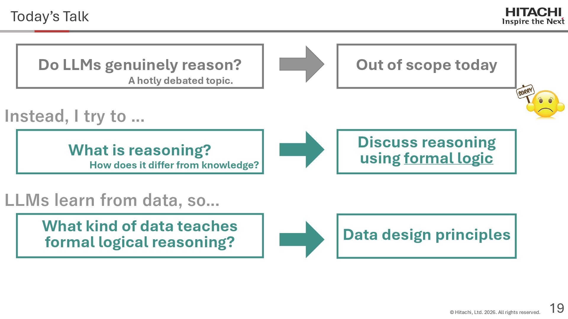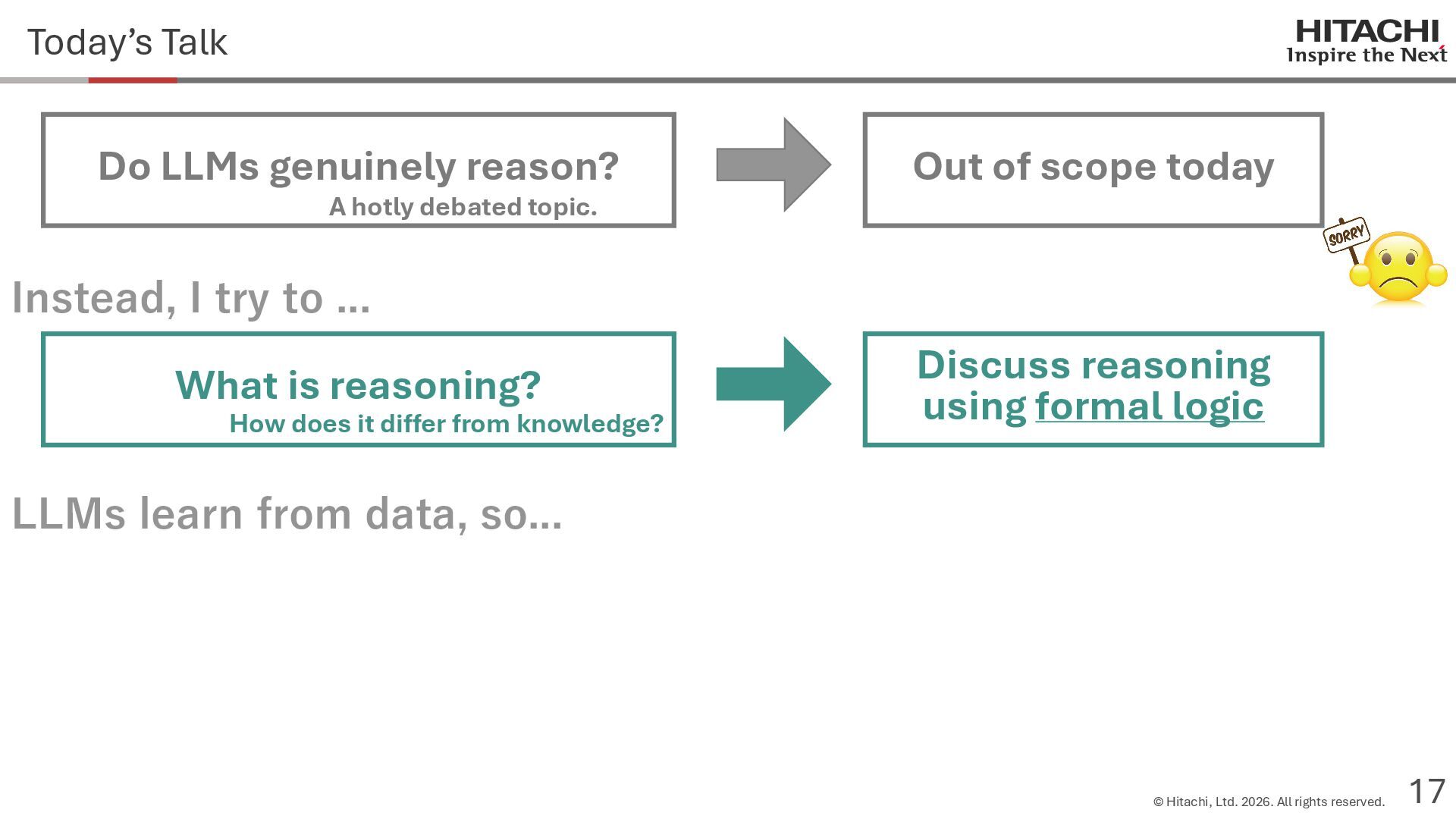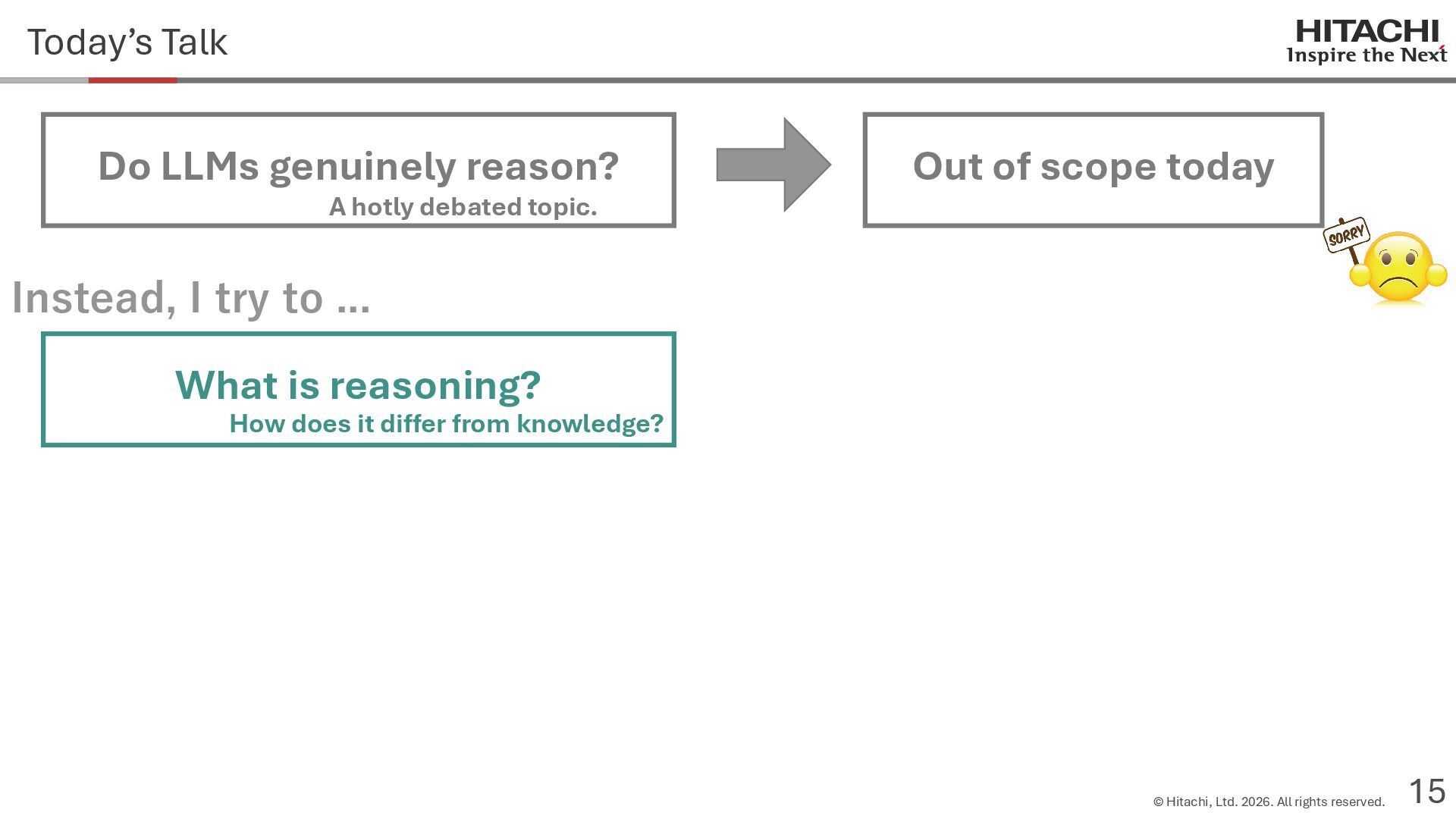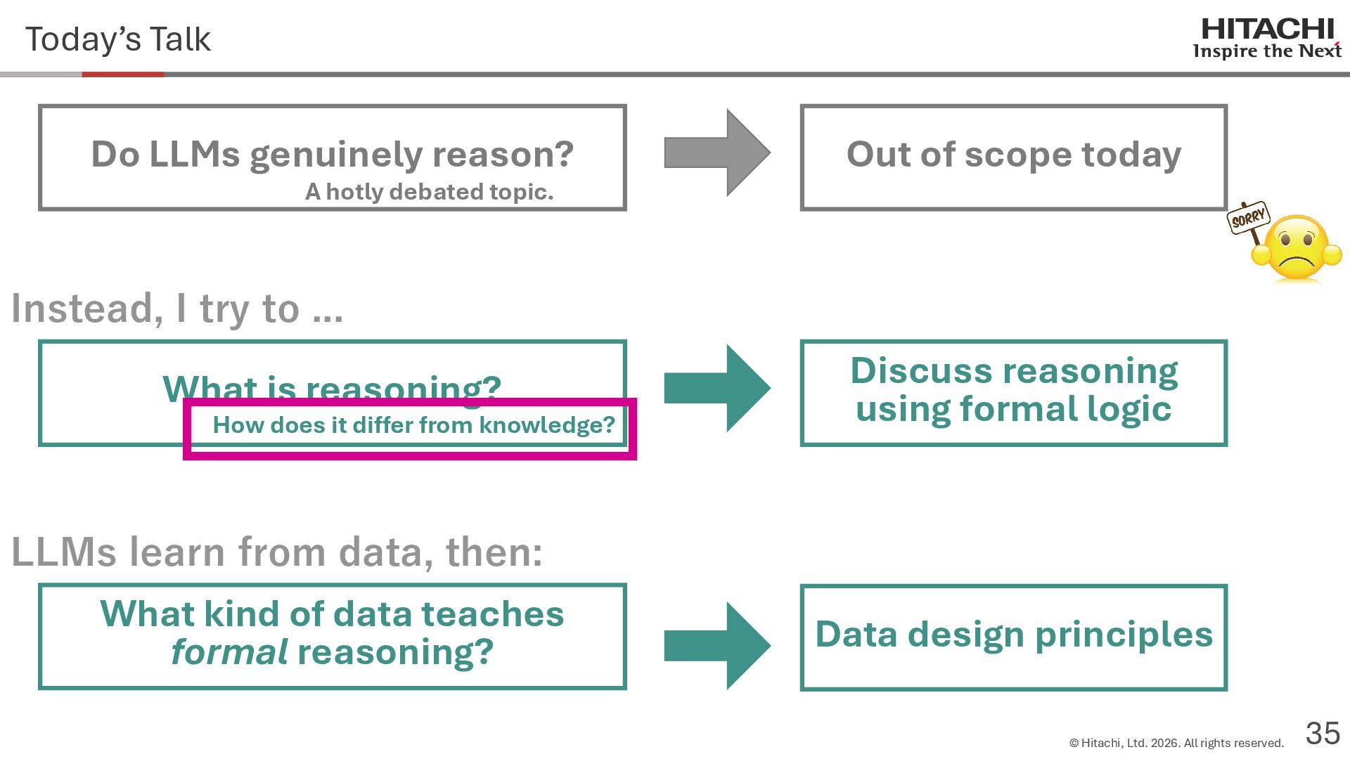 reason? Can Cannot • Score 100 on coding tests from before the knowledge cutoff, but 0 on those after the cutoff (Mitchell, 2023) • They can solve reasoning problems about everyday content, but cannot solve counterfactual reasoning problems. (Dasgupta et al., 2023) Zhao et al. (2024b) Frohberg & Binder (2022) Li et al. (2023) Yu et al. (2023) Jin et al. (2023) Zečević (2024) • They can solve problems with frequent expressions (tokens, variable names, linguistic expressions, etc.) and frequent problem types in the training corpus, but cannot solve those that are not. Jiang et al. (2024ab) Dziri et al. (2023) • Changing the problem representation (language, numbers, formulas) or adding irrelevant information causes performance to degrade significantly. Mirzadeh (2024) (Razeghi et al., 2022) Zhang et al., 2024; Srivastava et al. (2024); Shi et al. (2023) • Can solve Problems A and B independently, but not the combined problem (Arian Hosseini, 2024) • Performance drops significantly when the order of premise facts is changed (Chen et al., 2024) • Initial reasoning chains are selected via lexical overlap in premises and questions (Aoki et al., 2024) • Solved using a collection of (non-essential) heuristics rather than mathematical rules (Nikankin et al., 2024) • Human-like error patterns in syllogistic reasoning. Ando et al. (2023); Ozeki et al. (2024); Bertolazzi et al. (2024); Eisape et al. (2024) • On expert-written math problems, o1-preview achieves less than 1% accuracy (Glazer1 et al., 2024) • Fails to solve puzzles about rare/endangered languages (Bean et al., 2024) memorization content bias brittleness Heuristics • o1-preview solves 83% of the American Mathematics Olympiad qualifier; it can also solve unseen problems. • It also works for science, coding, and Kaggle! (OpenAI 2024), (Li et al., 2024) • Can solve 25% of expert-written ultra-hard math problems. • Scores about 136 on IQ tests on average, far above the human average of 100. • Grokking occurs via implicit reasoning (Wang et al., 2024). • Memorization and generalization can coexist (Xie et al., 2024) • For factual questions, they refer only to knowledge obtained from similar samples; for reasoning questions, they refer to a variety of samples (Ruis, 2024) • As LLMs scale up, memorization of a small number of samples increases for factual questions, but not necessarily for reasoning questions (Wang et al., 2024). More advanced Problem