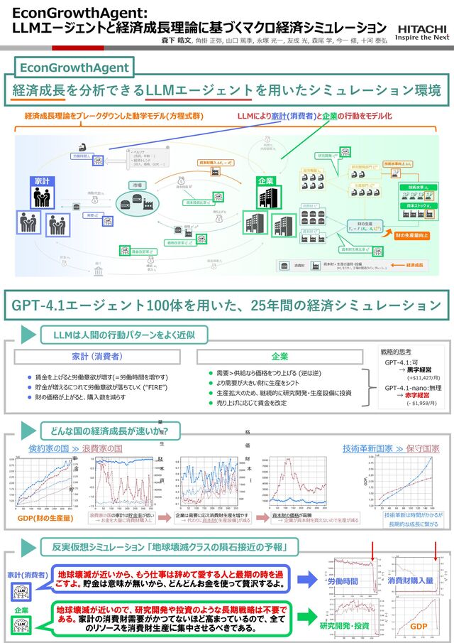 factors, “capital stock accumulation through 128 investment” and “technological innovation through R&D”, assuming given and fixed ratios for 129 investment (s) and R&D (r0). However, in reality, these factors arise from interactions among 130 micro-level decisions of economic agents, such as firms and households. Without this micro-level 131 lens, a comprehensive analysis of growth is impossible. 132 We therefore first break down growth theory into a system of dynamic equations describing how micro- 133 level decisions and other economic variables interact and evolve. We model capital accumulation 134 through a process where firms produce and sell capital goods, while other firms buy them to use in 135 their production. Similarly, we model technological innovation through firms allocating a portion 136 of labor to R&D, raising their technology levels. Furthermore, these decisions can be influenced by 137 those made within the same firms, as well as by other firms and households. For instance, funds for 138 purchasing capital goods come from previous sales, which depend on firm-set prices, competitors’ 139 prices, and household demand, while R&D labor depends on the labor supplied by households. Thus, 140 we enumerate a wide range of decision types for both firms and households, together with all relevant 141 interactions. 142 Then, we implement LLM agents to drive these dynamics with realistic decisions of households and 143 firms, creating an executable simulation environment named EconGrowthAgent (Figure 1). 144 3.1 LLM Agents 145 Assume NH household agents and NF firm agents. Each household h ∈ [1, NH] is assigned a 146 random persona prompt Pr(h)—including name, age, job, and residence—to approximate real-world 147 diversity. For decision-making, it receives a decision prompt DH listing decision items (e.g., “How 148 many goods to buy?”) and an economic trend prompt E(h) t providing variables up to timestep t 149 (month), such as income, goods prices and previous consumption, to support rational decisions. 150 For counterfactual simulations, it receives a counterfactual prompt Ct (e.g., “a novel infection X is 151 spreading”). We concatenate these into a single prompt PH(h) t = Pr(h) ⊕ DH ⊕ E(h) t ⊕ Ct to query 152 LLMs. 153 Likewise, each firm f ∈ [1, NF ] receives PF (f) t = Pr(f) ⊕ DF ⊕ E(f) t ⊕ Ct. E(f) t includes 154 firm-related variables (e.g., past demand and sales). See Appendix E for the details and LLM outputs. 155 4
