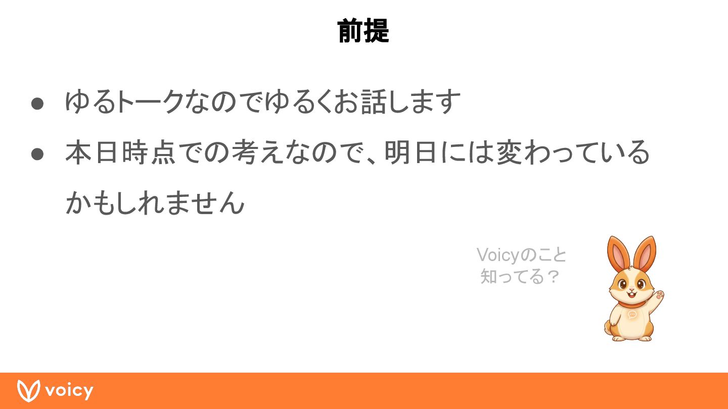 • ゆるトークなのでゆるくお話します • 本日時点での考えなので、明日には変わっている かもしれません Voicyのこと 知ってる? 前提