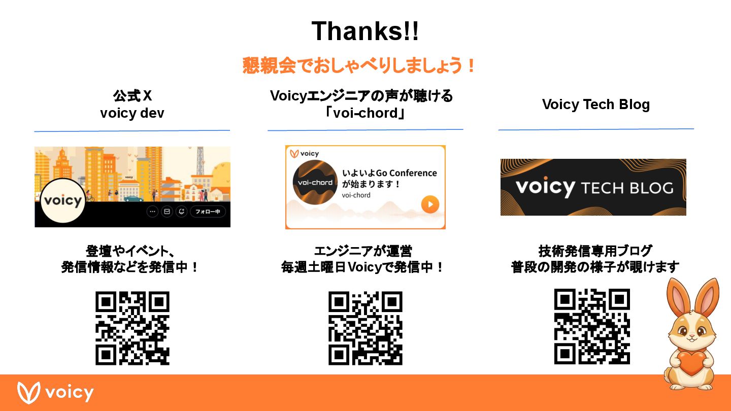 Thanks!! 懇親会でおしゃべりしましょう! 公式X voicy dev Voicyエンジニアの声が聴ける 「voi-chord」 Voicy Tech Blog