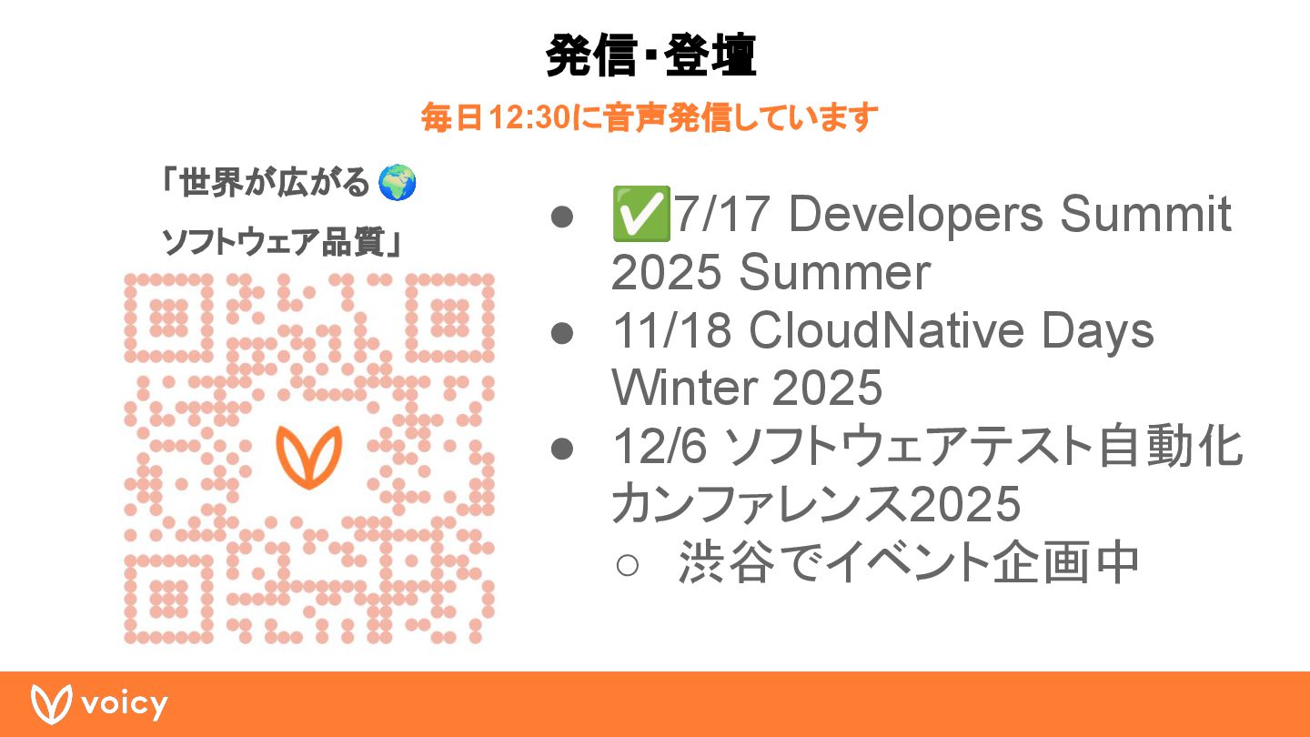 毎日12:30に音声発信しています 発信・登壇 • ✅7/17 Developers Summit 2025 Summer • 11/18