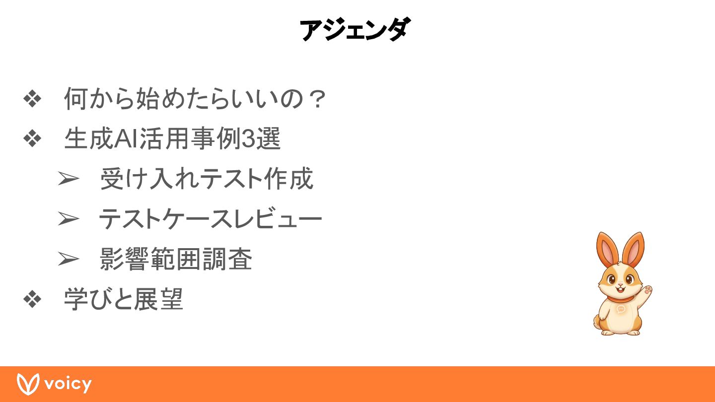 アジェンダ ❖ 何から始めたらいいの? ❖ 生成AI活用事例3選 ➢ 受け入れテスト作成 ➢ テストケースレビュー ➢