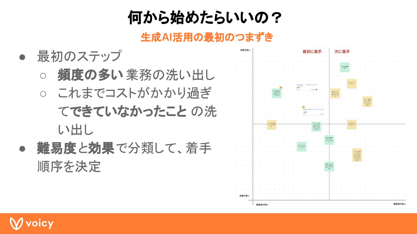 い出し • 難易度と効果で分類して、着手 順序を決定 生成AI活用の最初のつまずき