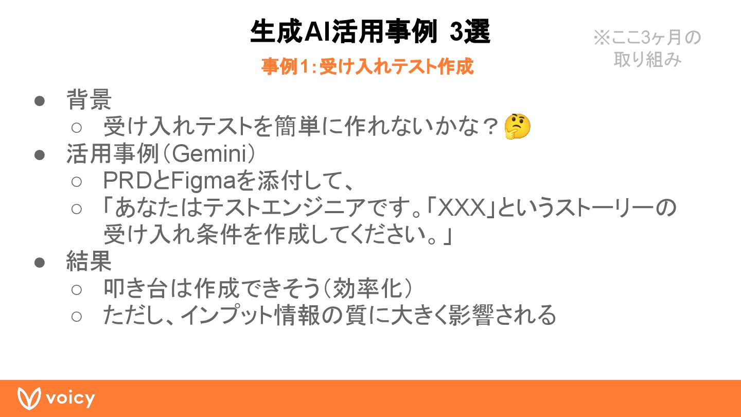 ◦ 「あなたはテストエンジニアです。「XXX」というストーリーの 受け入れ条件を作成してください。」 • 結果 ◦ 叩き台は作成できそう(効率化) ◦ ただし、インプット情報の質に大きく影響される 事例1:受け入れテスト作成 ※ここ3ヶ月の 取り組み