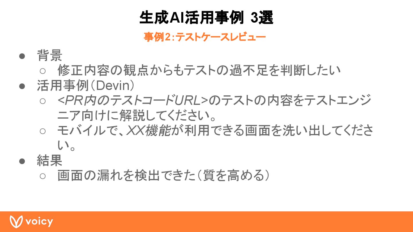 生成AI活用事例 3選 事例2:テストケースレビュー • 背景 ◦ 修正内容の観点からもテストの過不足を判断したい • 活用事例(Devin) ◦