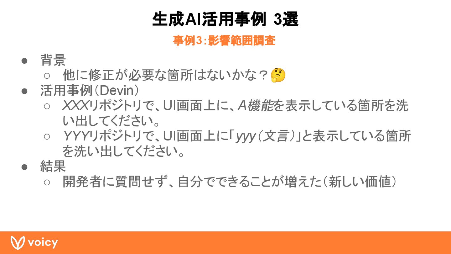 生成AI活用事例 3選 • 背景 ◦ 他に修正が必要な箇所はないかな?🤔 • 活用事例(Devin) ◦ XXXリポジトリで、UI画面上に、A機能を表示している箇所を洗