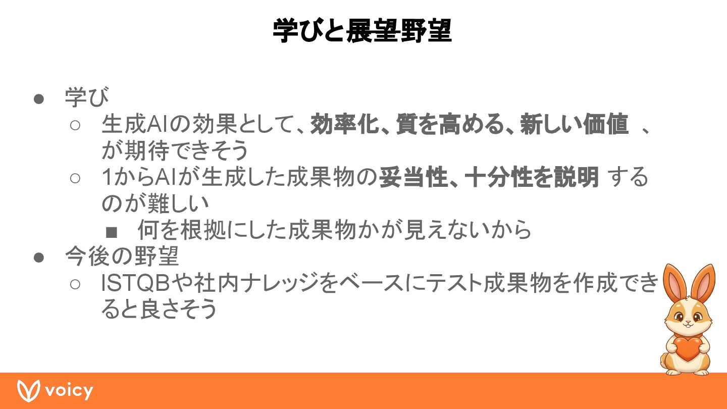 ▪ 何を根拠にした成果物かが見えないから • 今後の野望 ◦ ISTQBや社内ナレッジをベースにテスト成果物を作成でき ると良さそう 学びと展望野望