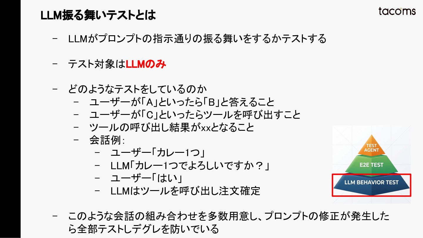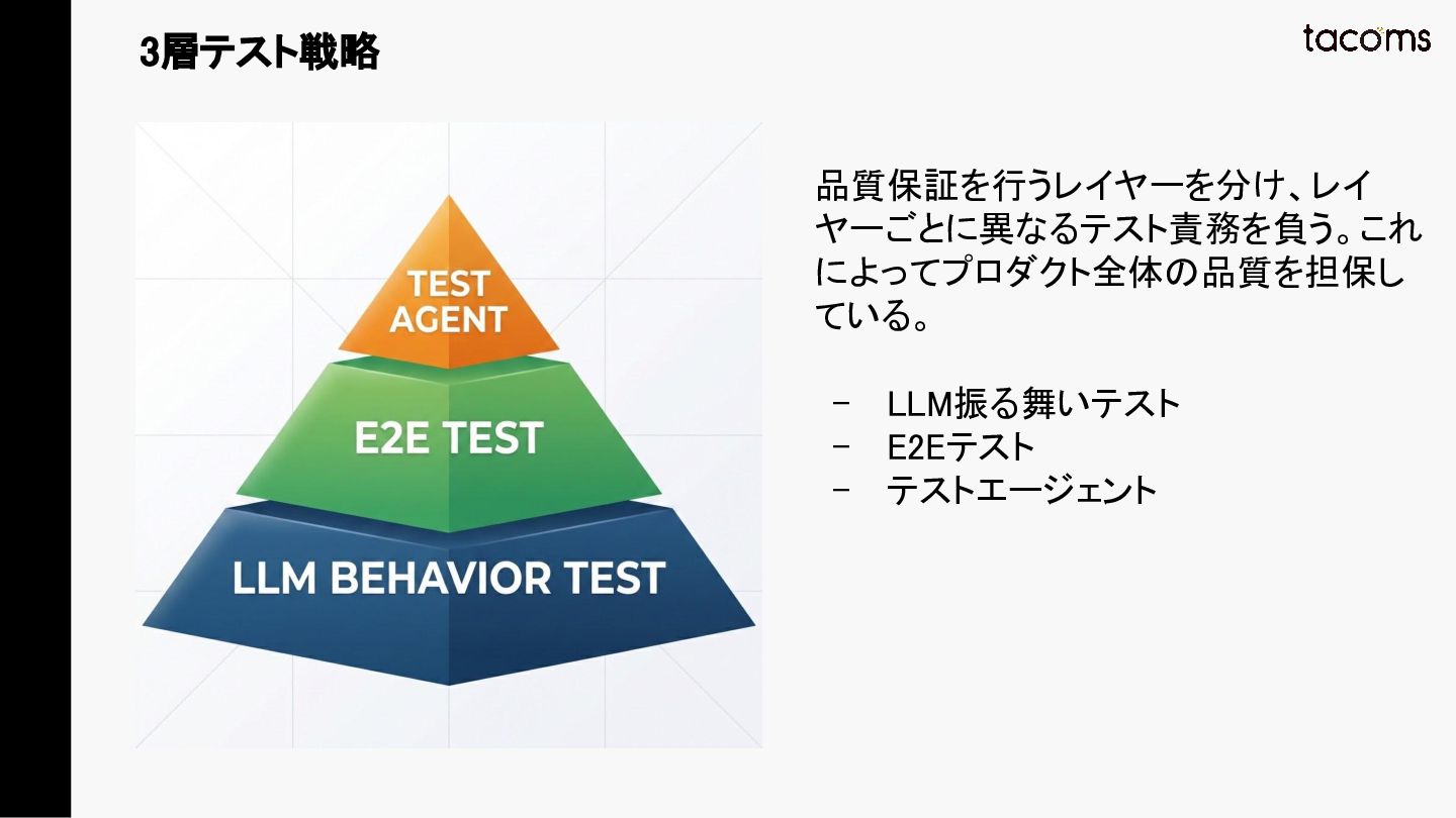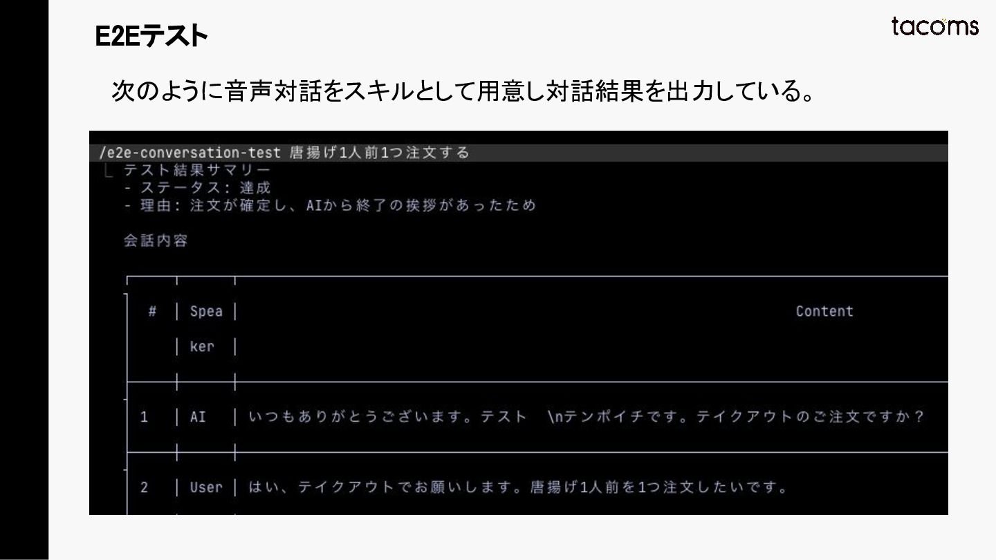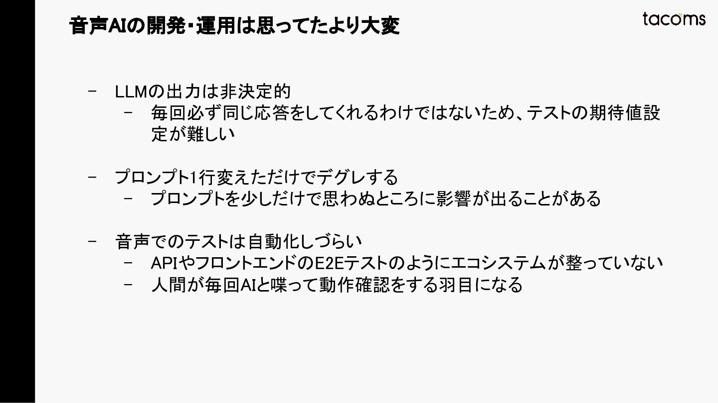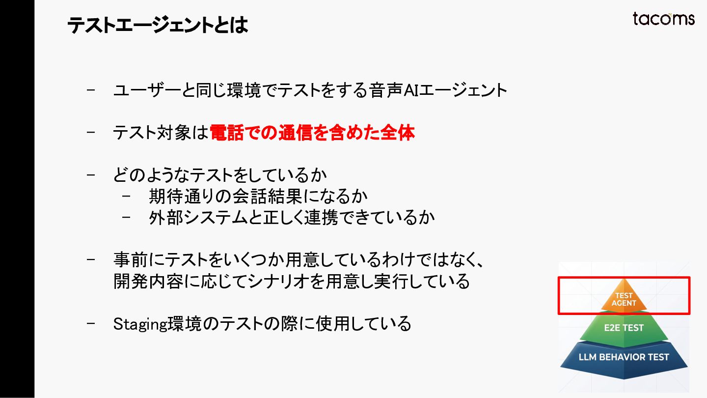 音声AIエージェントの品質保証は、プロンプト変更によるデグレ、コンポーネント間の結合不具合、実際の通話品質と、テスト対象が多層にわたります。本発表では、飲食店向けAI電話注文システムの開発で構築した「LLM振る舞いテスト」「E2Eテスト」「テストエージェント」の3層テスト戦略を紹介し、品質と開発速度を両立するアプローチを共有します。
