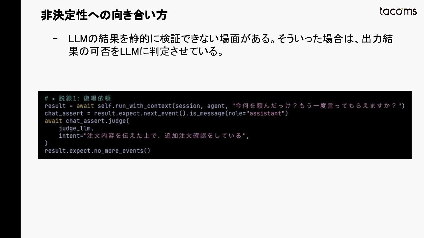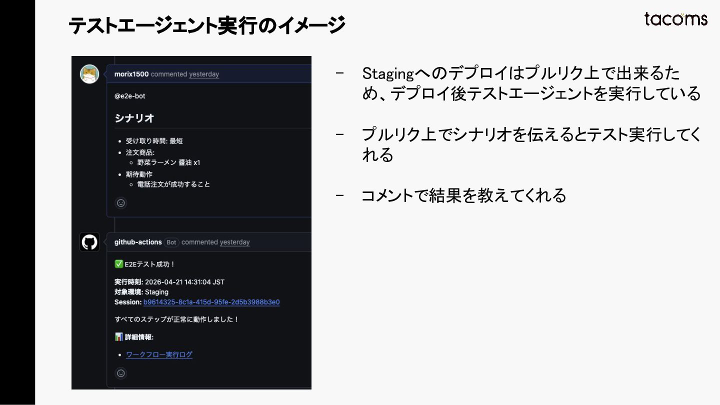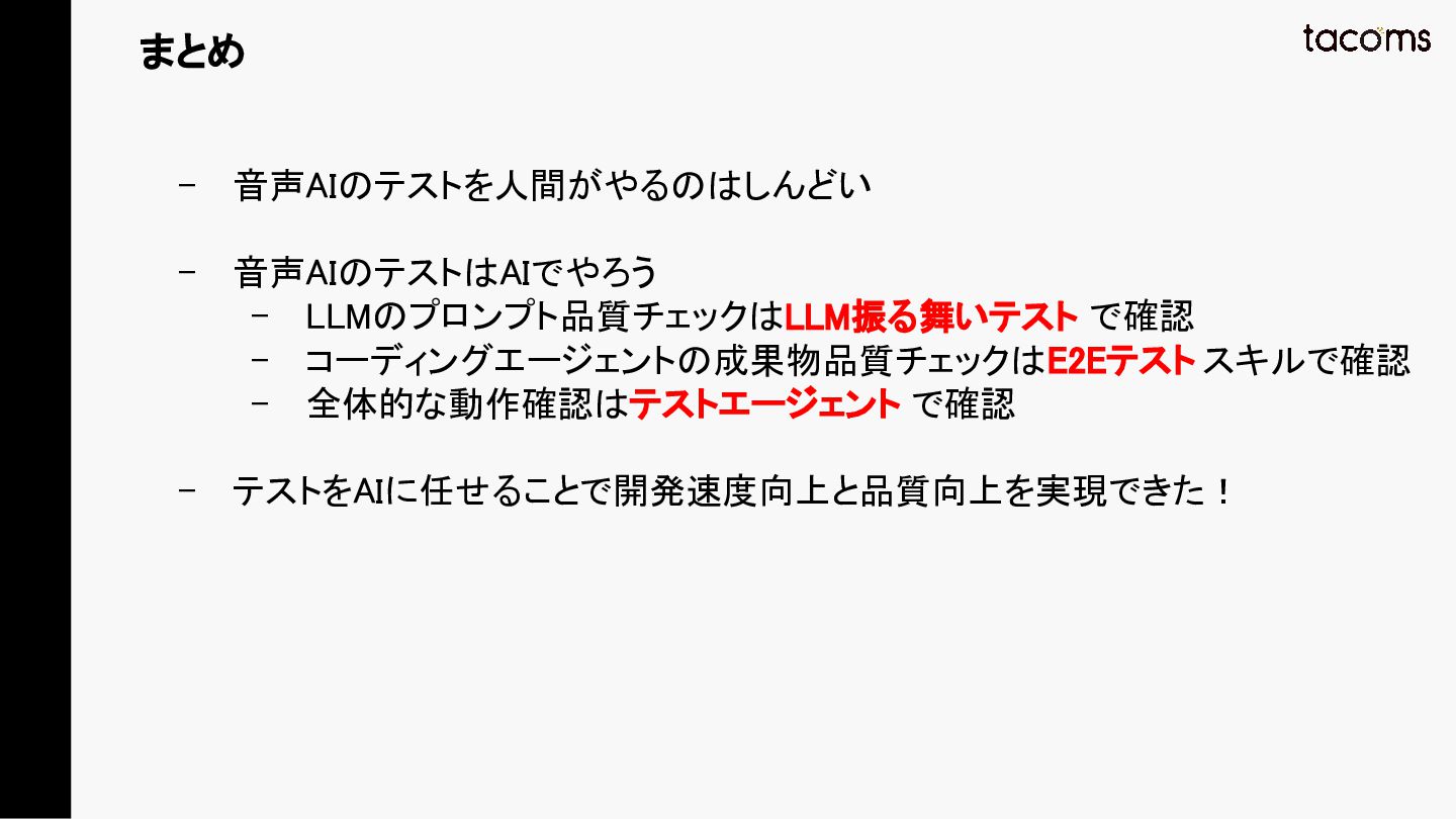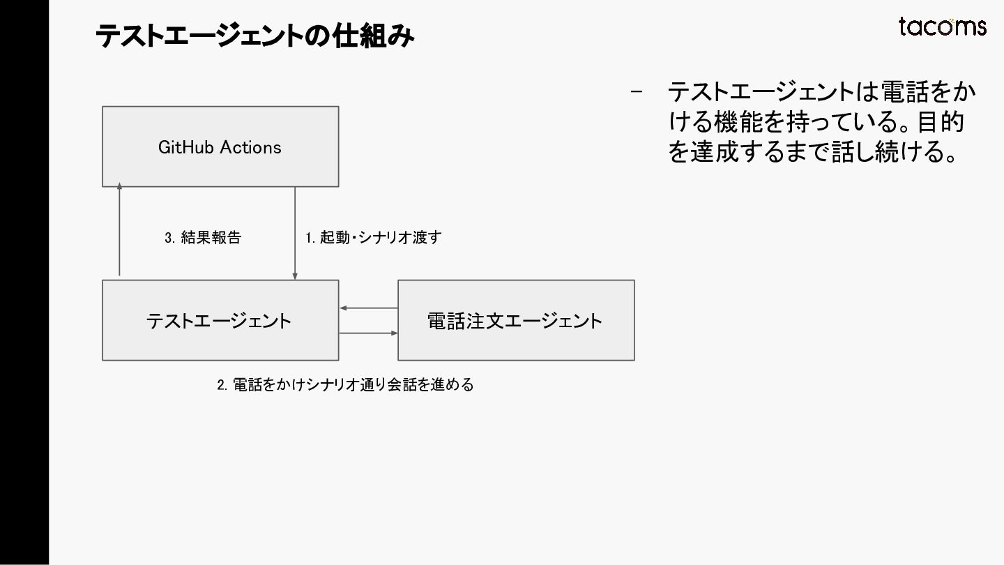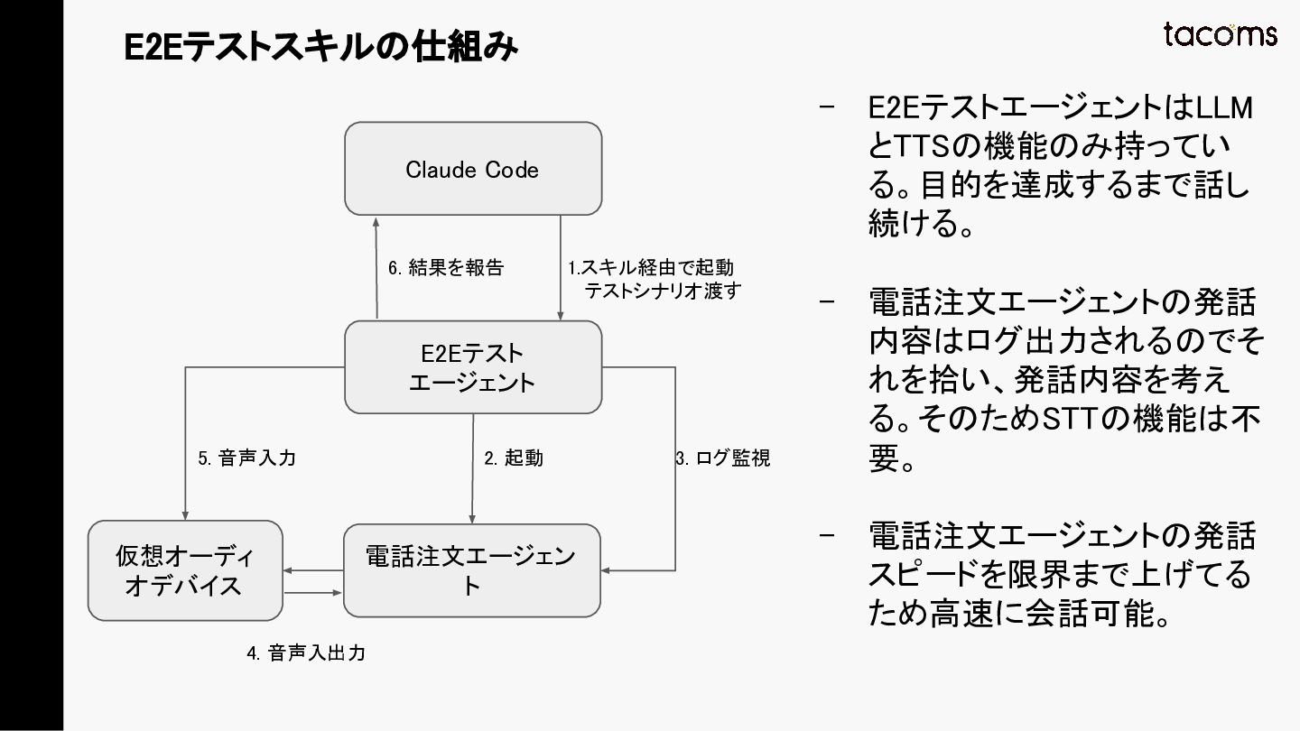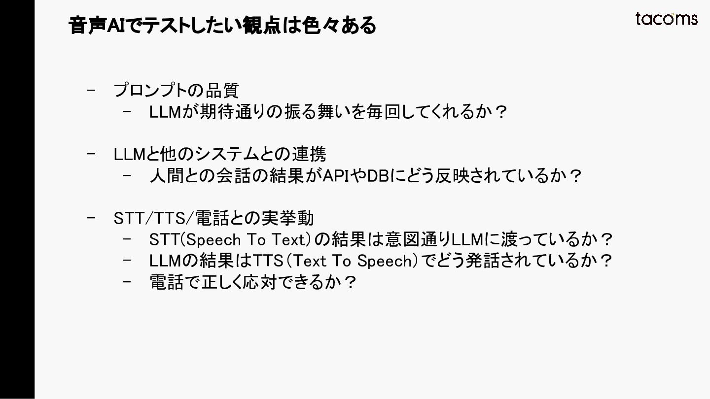 音声AIエージェントの品質保証は、プロンプト変更によるデグレ、コンポーネント間の結合不具合、実際の通話品質と、テスト対象が多層にわたります。本発表では、飲食店向けAI電話注文システムの開発で構築した「LLM振る舞いテスト」「E2Eテスト」「テストエージェント」の3層テスト戦略を紹介し、品質と開発速度を両立するアプローチを共有します。